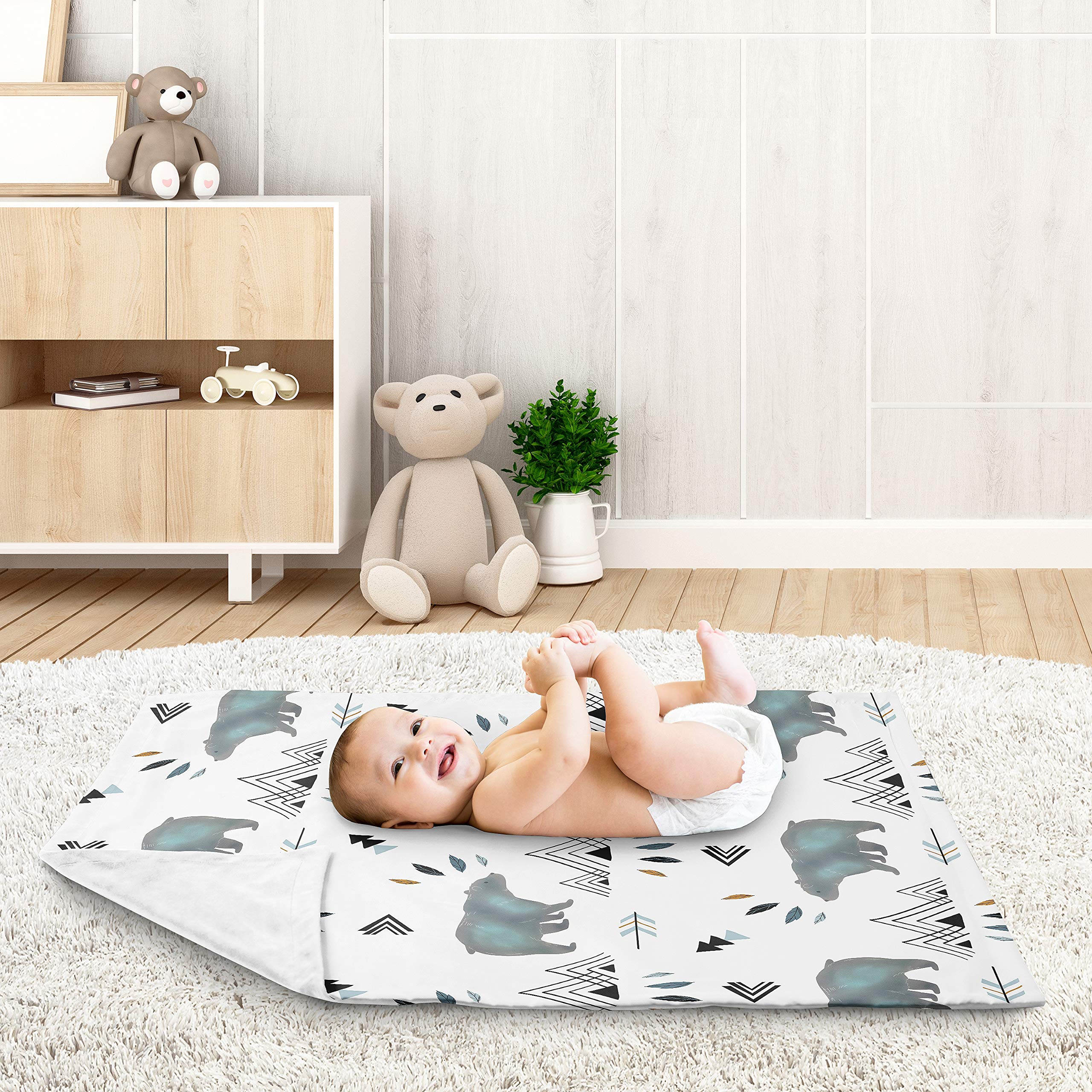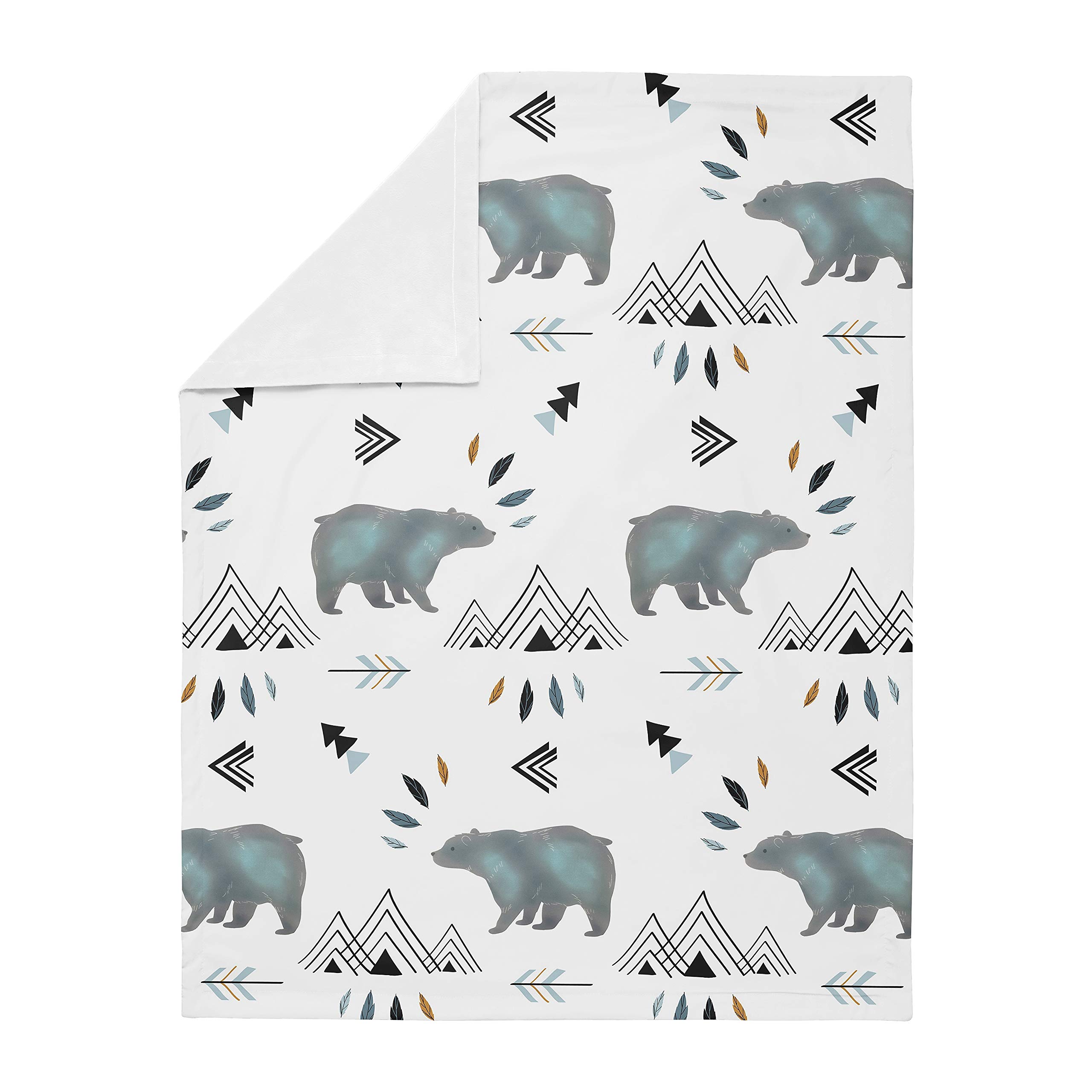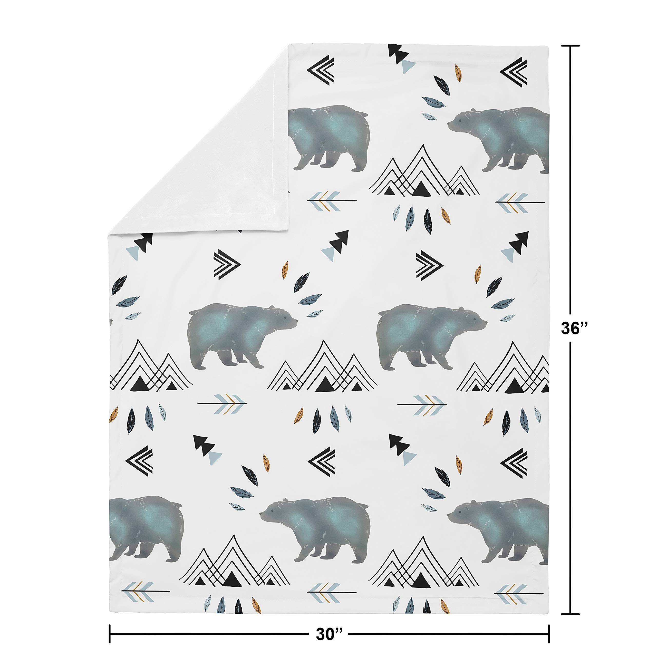 Blanket is designed using a bear and mountain watercolor brushed microfiber print and reverses to soft white minky