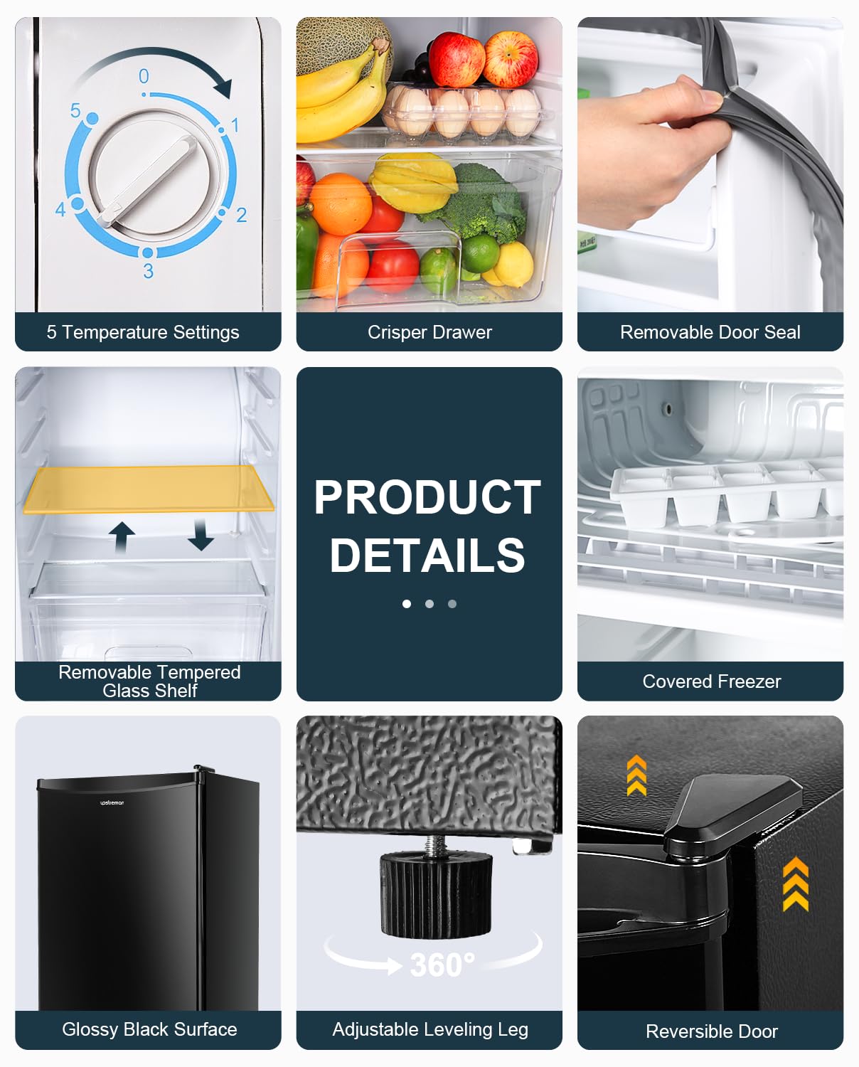 Crisper Drawer & Removable Shelves: Features a crisper drawer to keep your greens and fruits fresh and juicy. The small fridge storage space is adjustable to practical uses with removable shelves. Arrange these shelves how you see fit and you’d be amazed how much the small fridge can stores