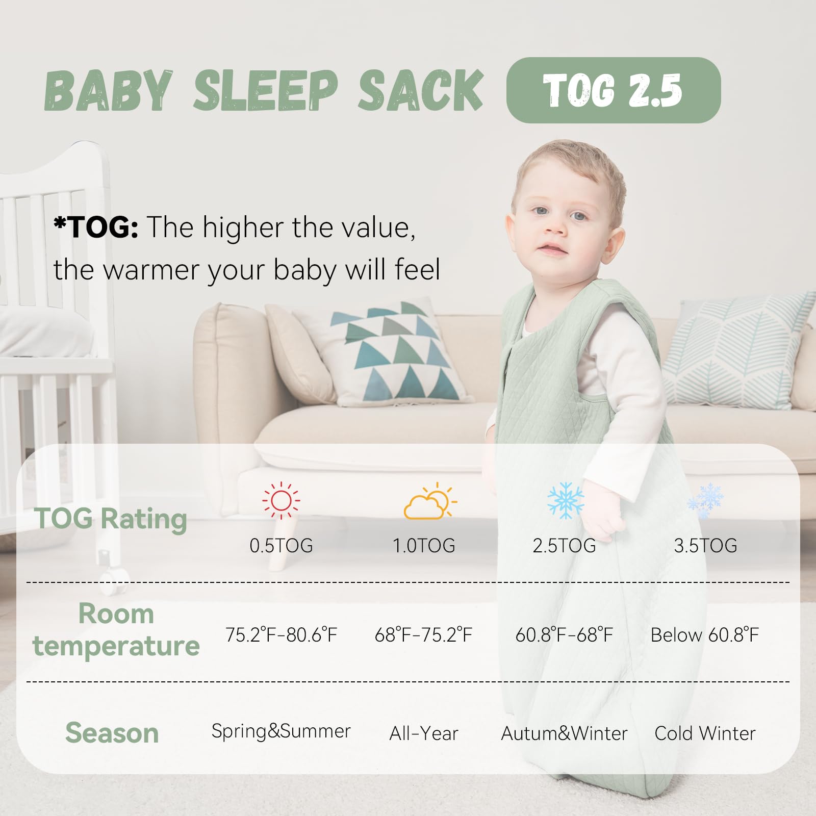 Warm and Cozy - This baby sleep sack made with 100% Organic cotton fabric and fluffy polyester filling, super-soft and breathable for comfort. TOG 2.5 sleep sack is ideal for cooler weather. 3-layer breathable material and sleeveless design helps regulate baby's temperature, reducing overheating risk and ensuring warmth and cozy.