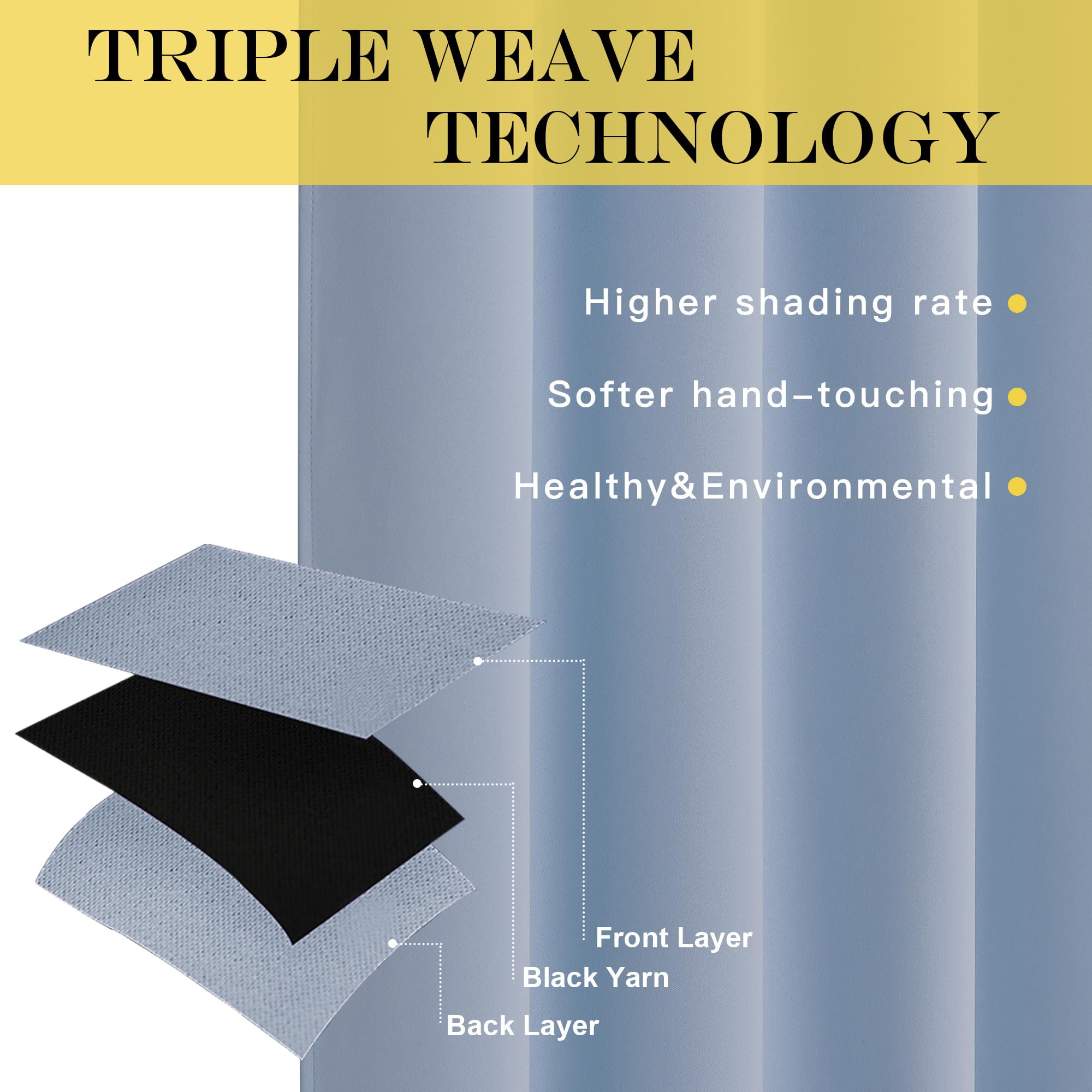 AMAZING FABRIC: The blackout curtain's fabric is a super soft and heavily innovative triple-weave polyester fabric. The Same material back as of front makes it appear more elegant. The 10 sliver grommets top (inner diameter is 1.6-inch) adds a modern touch and easy hanging.