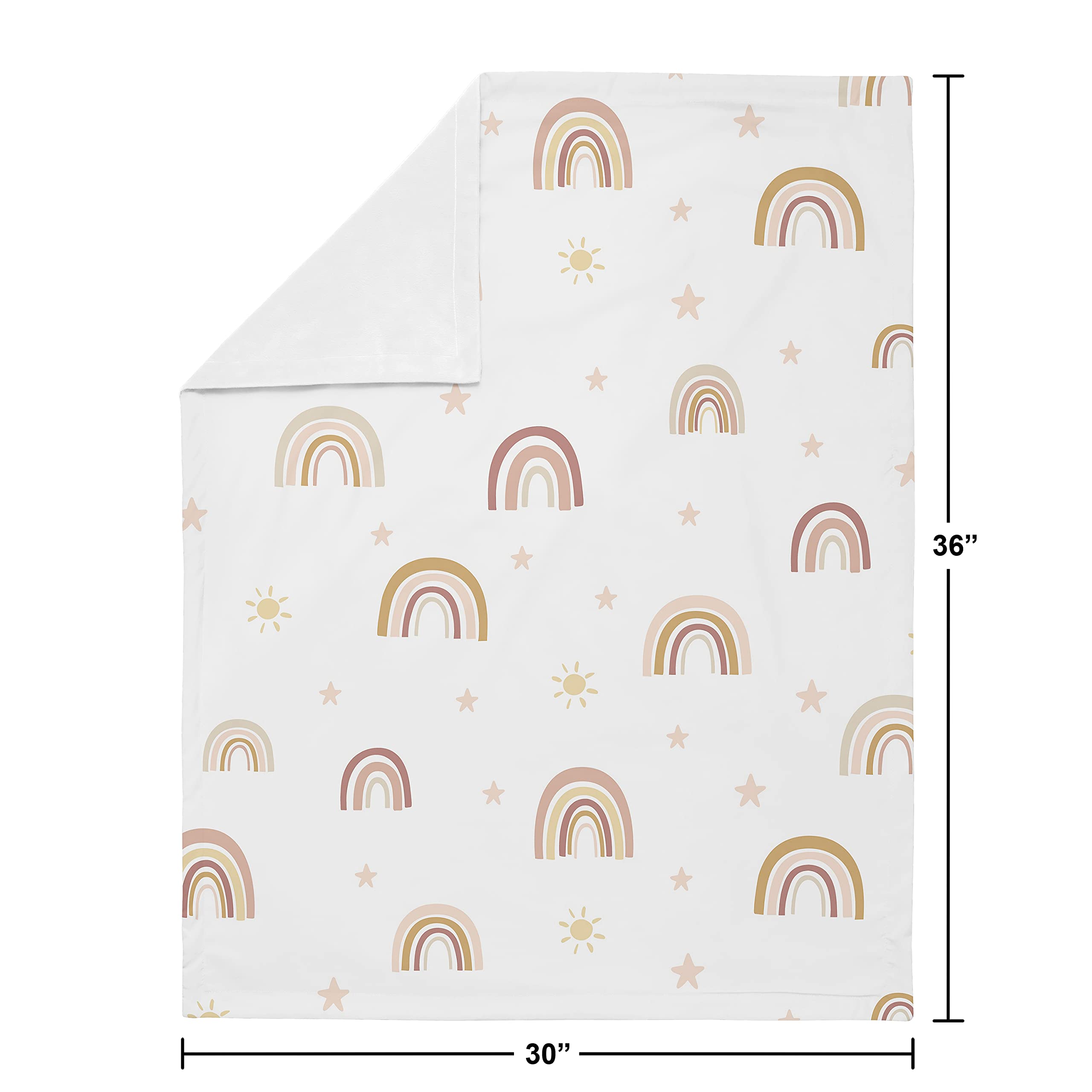 Blanket is designed using a pink and yellow boho watercolor rainbow brushed microfiber print and reverses to soft white minky