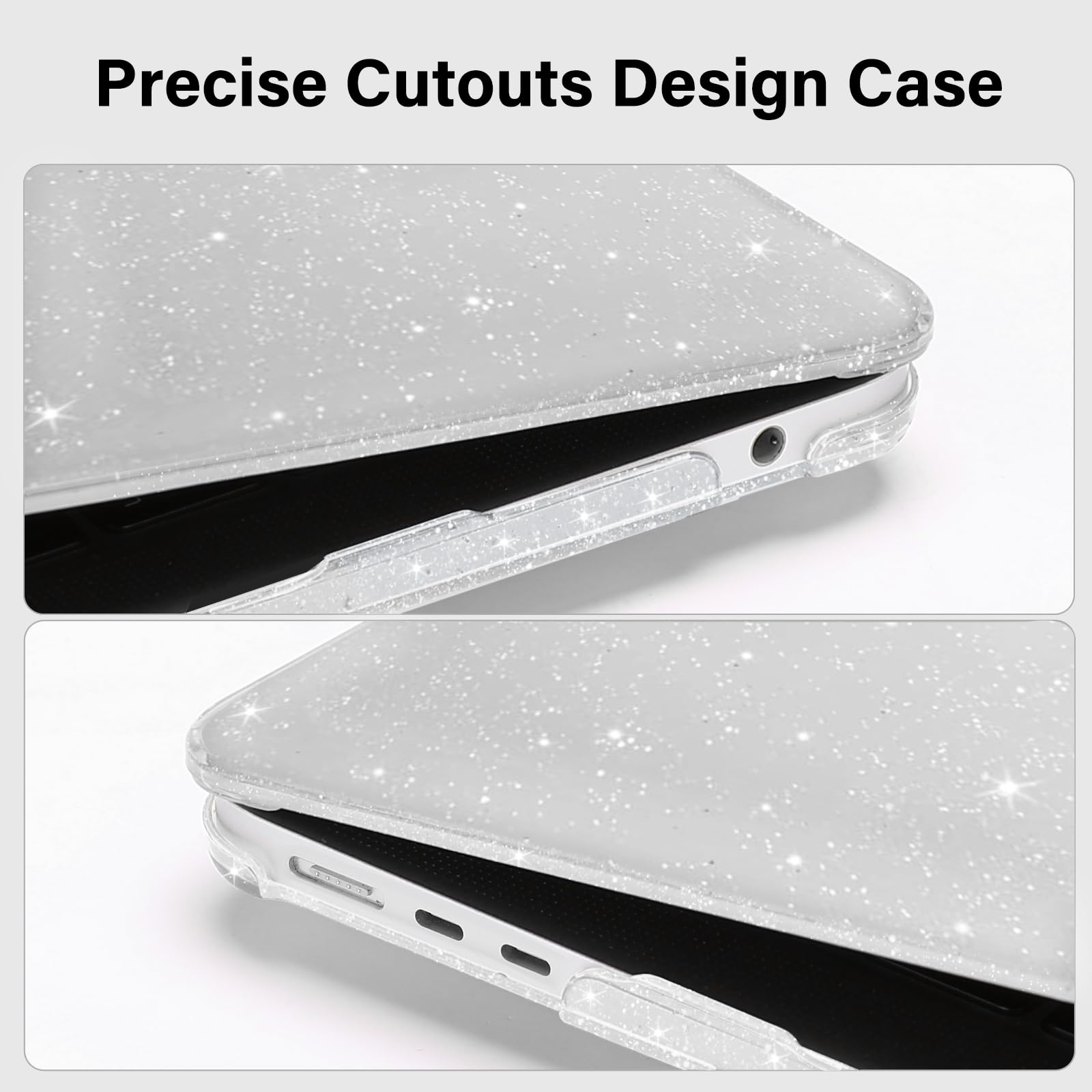 NO Cut Out design. Fully vented for heat disbursement, fully access to all buttons and features. Totally removable, easy to put on and take off that can protect your laptop from scrapes and scratches. The top and bottom case added lots of small glitters, so it will show different color with the difference of light. Sparkly glitter case design makes your laptop more attractive and fashionable.