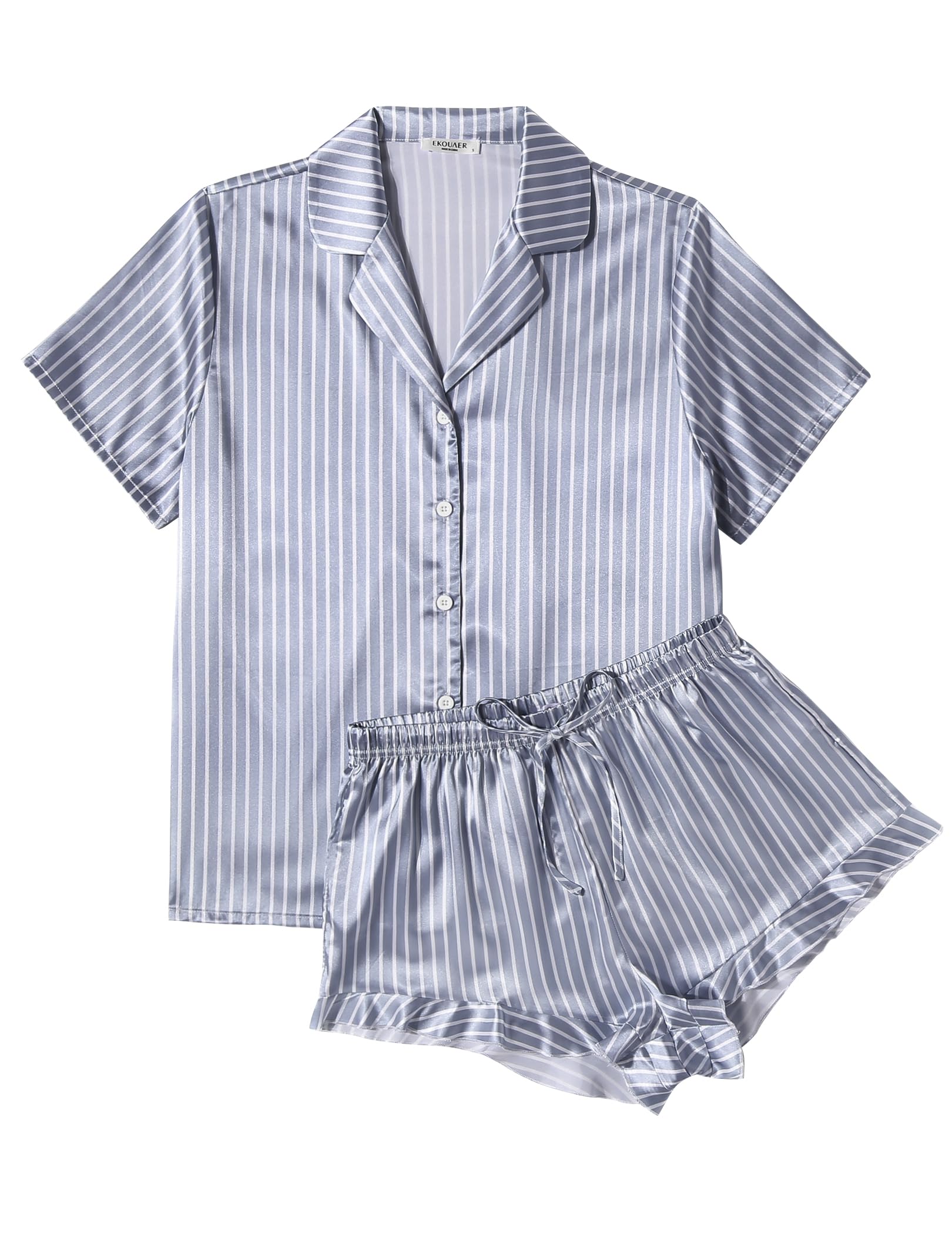 【Pajama Bottoms】:Two piece stripe pajama set for women featuring classic casual loungewear set style, featuring short sleeve top and pants for relaxed fit, boxer short with drawstring elastic waist to make relaxing as comfortable as possible