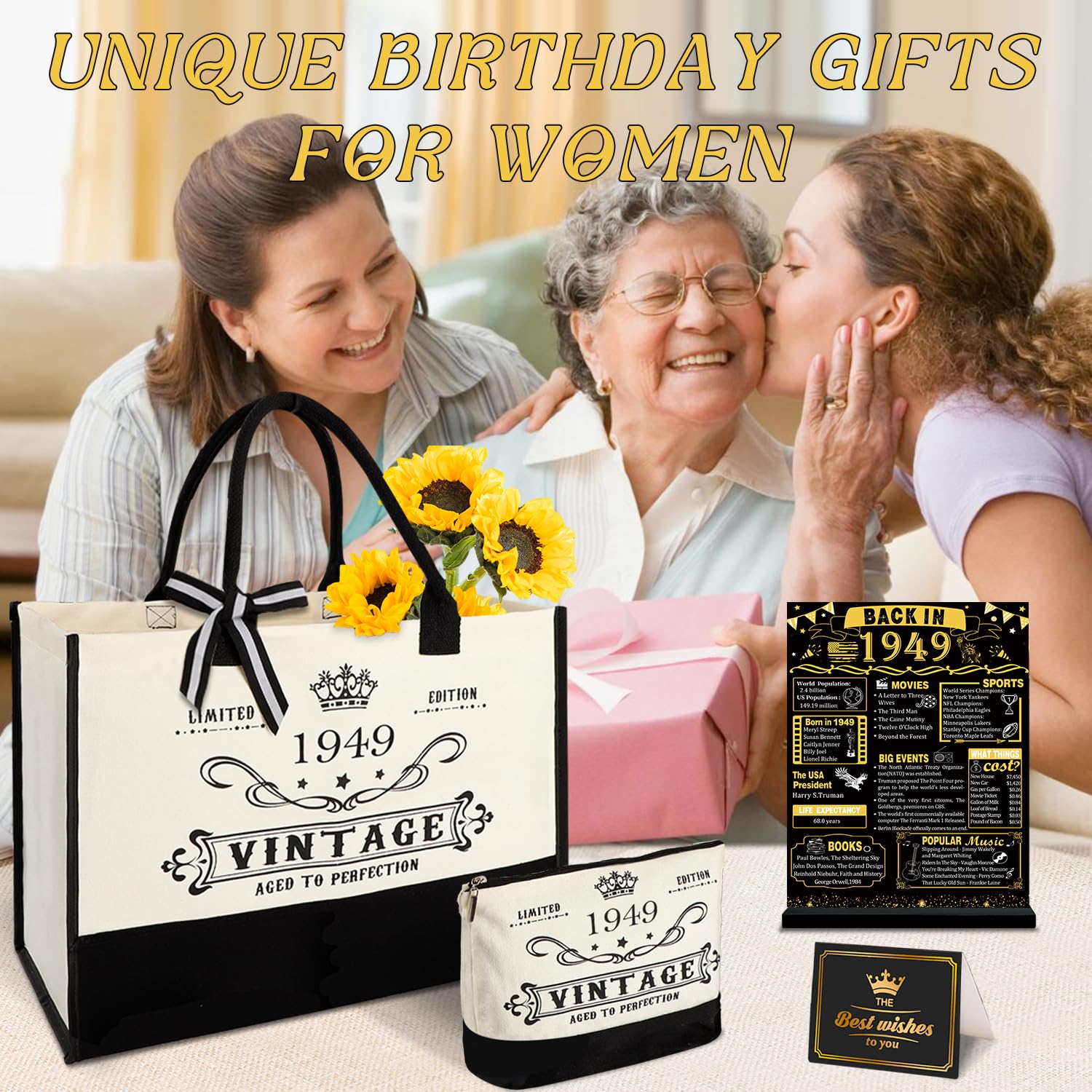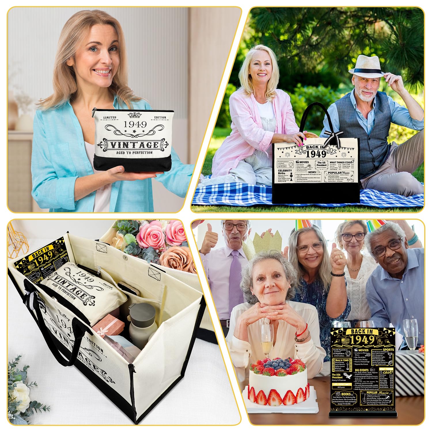 Great Gift for Her 76th Birthday: This gifts set for 76th birthday women contains: 1 X 1949 beach bag, 1 X cosmetic bag, 1 X back in 1949 poster, 1 X greeting card. Unique canvas tote bag gifts set will be a adorable gift for women's 76th birthday. This birthday 76 gifts themed idea makes the perfect choice for putting a smile on her face on their special day.