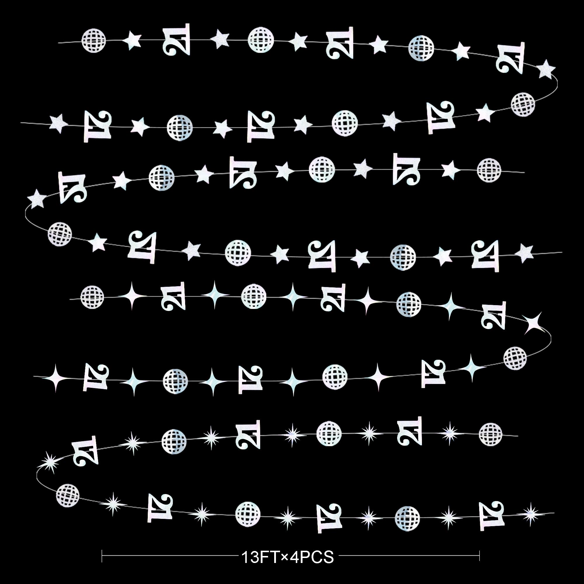 Package includes: 4 strings of 13 feet/4 meters laser iridescent disco ball and number 21 sparkling twinkle star garlands , totally is 52 feet/16 meters.