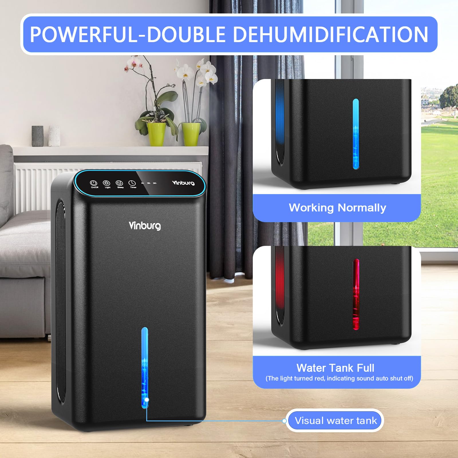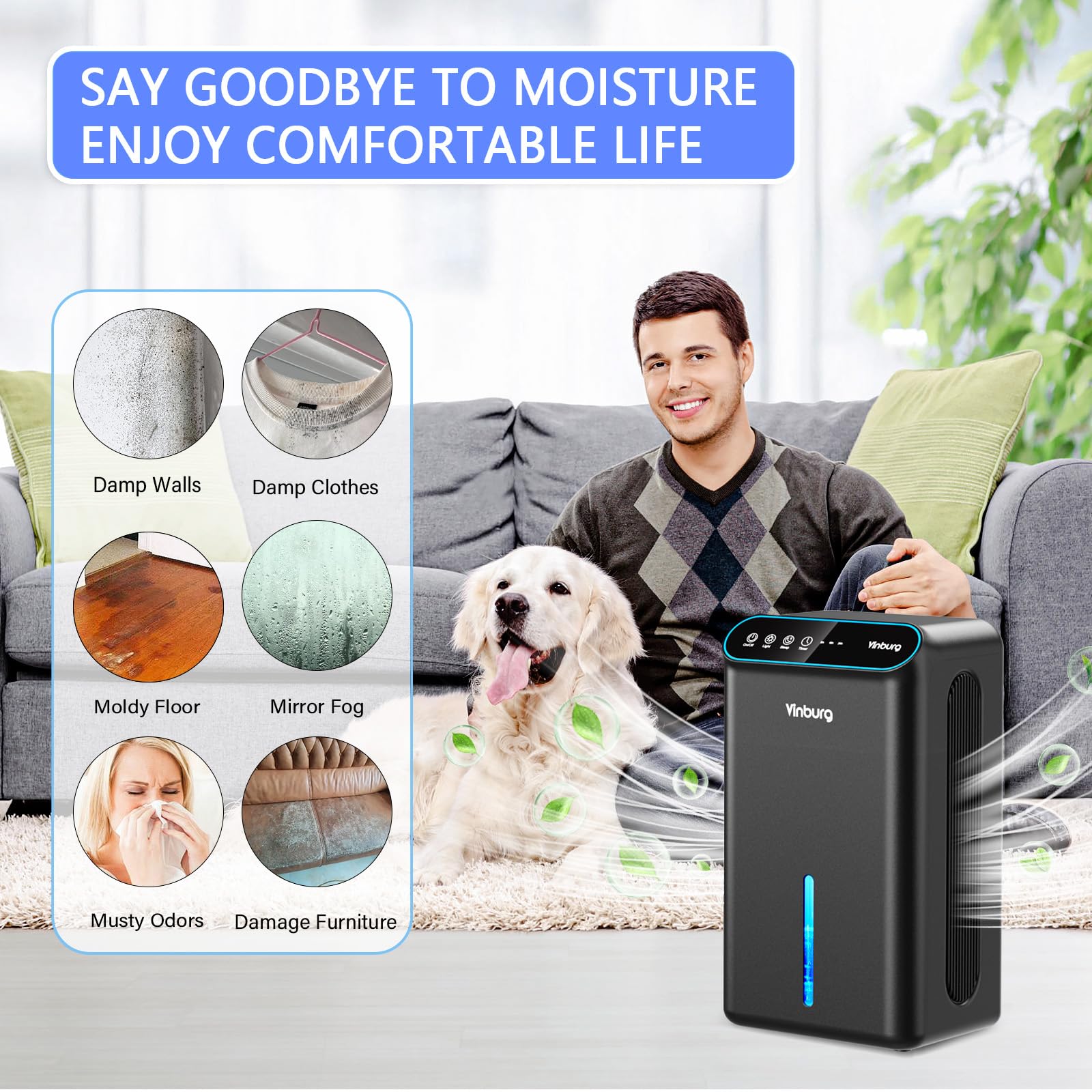 【Day & Sleep Mode with Whisper-Quiet Operation】This smart dehumidifier features two modes for all-day comfort. Day Mode delivers powerful moisture removal during active hours, while Sleep Mode lowers fan speed and noise to below 30 dB, turns off the lights, and creates a calm, undisturbed atmosphere—perfect for bedrooms, nurseries, and quiet workspaces.