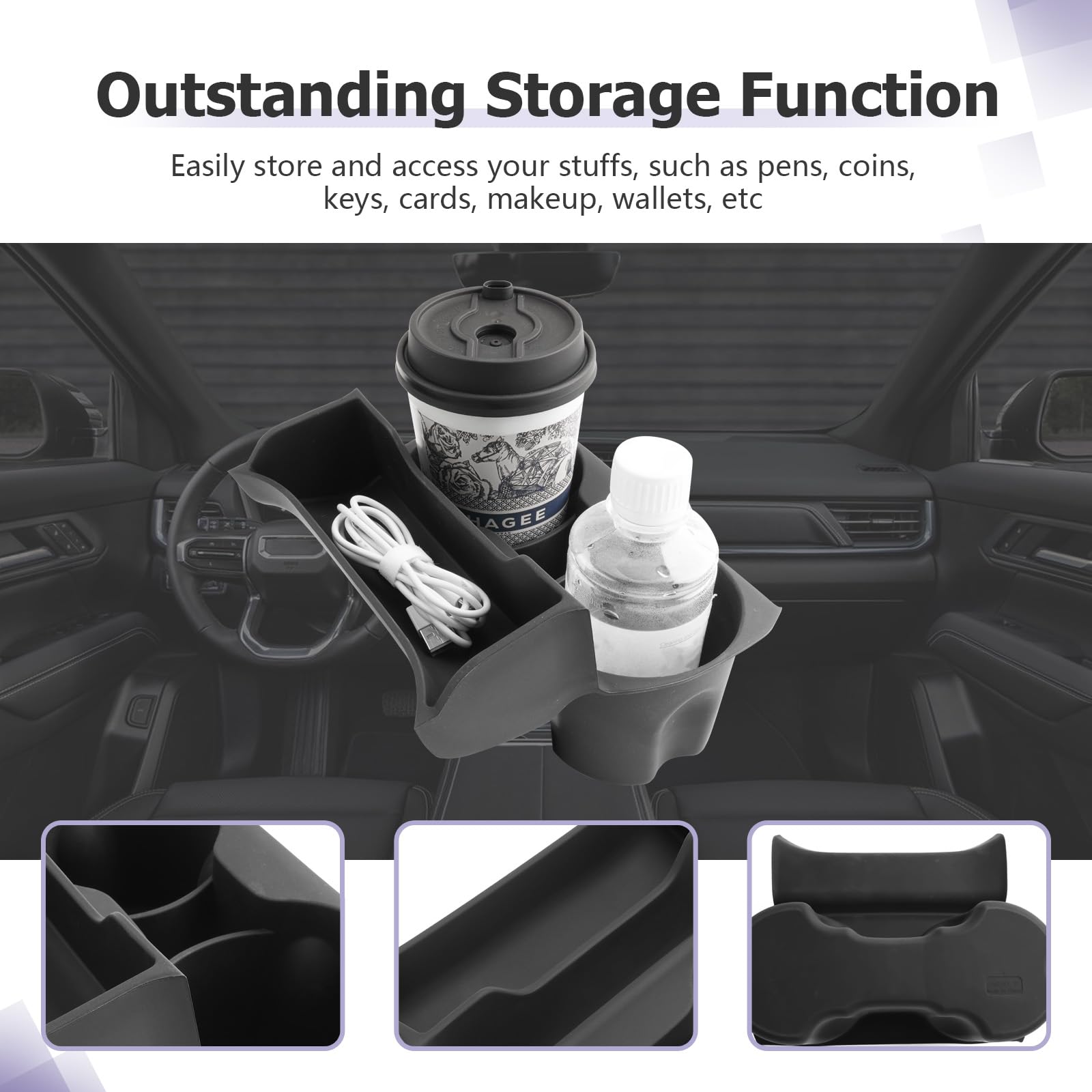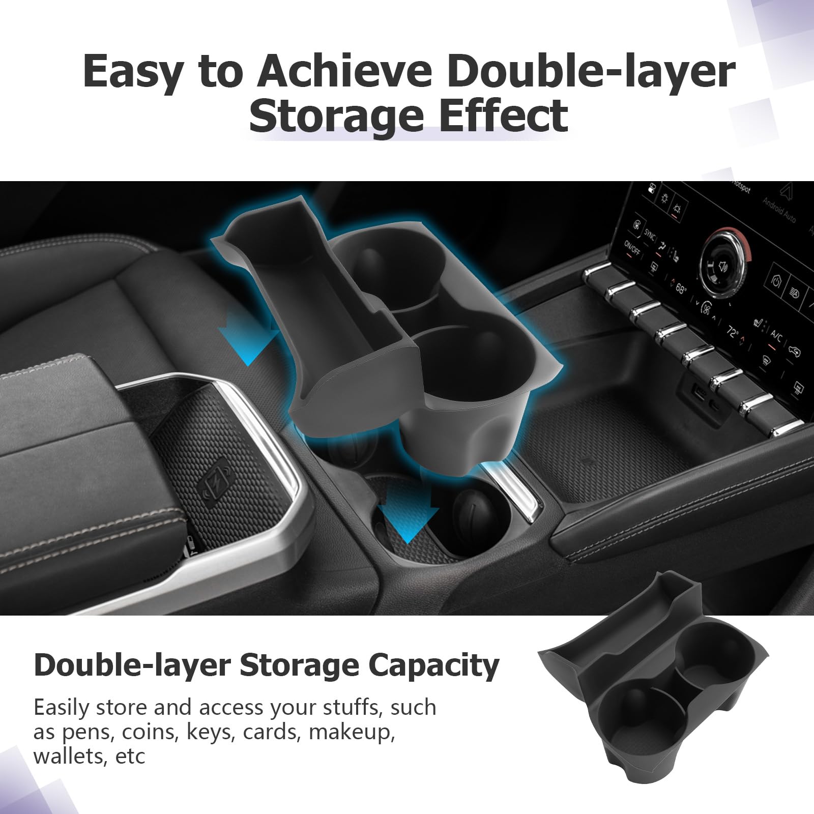 2-IN-1 DESIGN — LUWU has tried to combine the functions of the center console cup holder and the center console storage box to maximize the use of space firstly. It can store small items such as, coins, pens, bills, etc., and it can be used with 2 water cup holders or beverage holders at the same time