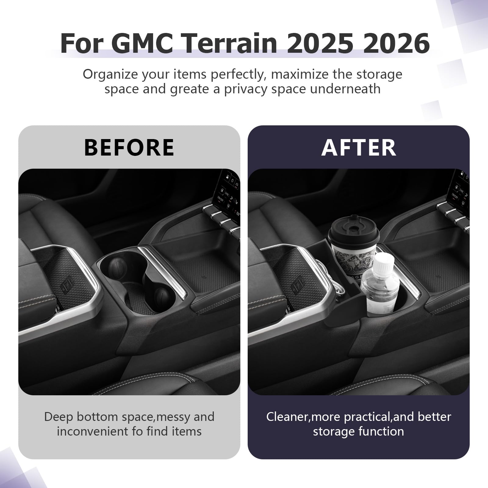 Easy to Install — Easily disassemble the 2026 Terrain accessories,car center console storage box, and directly insert the 2025 Terrain armrest console organizer into the center console, without modification, no cutting/tools. The 2026 Terrain center console organizer overall texture structure can be well integrated with the shift console, without abrupt display