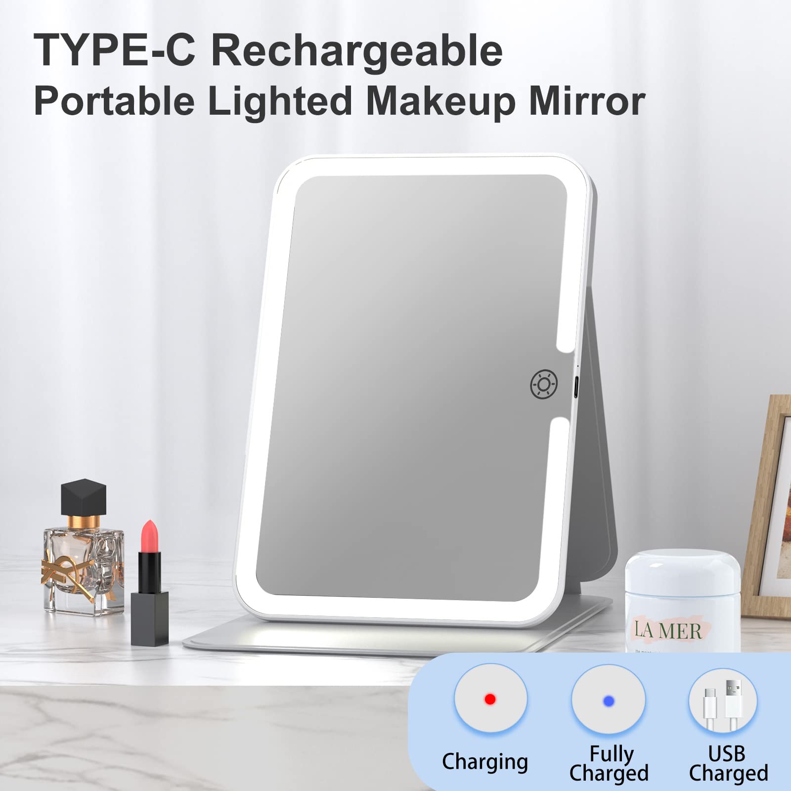 ๐ใ๐๐๐๐ก๐๐ซ๐ ๐๐๐๐ฅ๐ ๐๐จ๐ง๐ญ๐ข๐ง๐ฎ๐จ๐ฎ๐ฌ๐ฅ๐ฒ ๐๐จ๐ซ๐ค ๐๐จ๐ซ ๐.๐ ๐๐จ๐ฎ๐ซ๐ฌ:This beauty mirror built-in 1000mAh rechargeable Lithium battery, continuously works for up to 1.3 hours after fully charged, no need to charge frequently any more, convenient for you to take for travelling. The vanity mirror can be charged through type-c by powerbank, PC, etc. Soft pads at the bottom make the mirror stands stably by itself on countertop