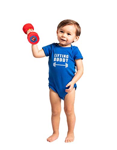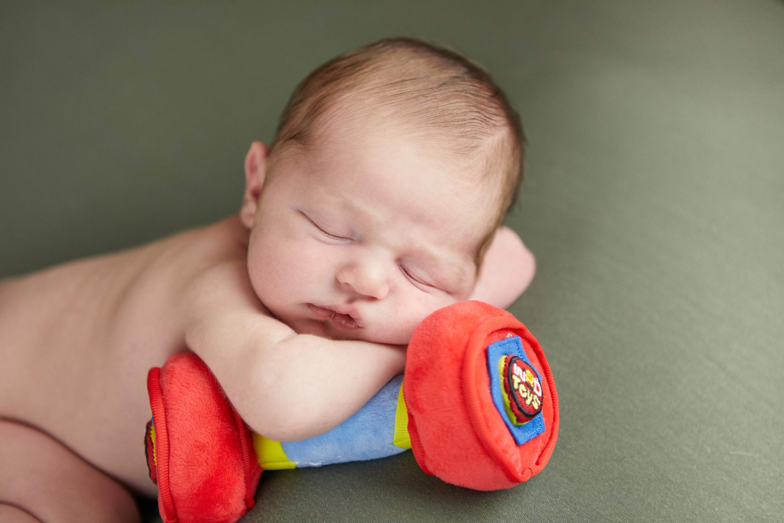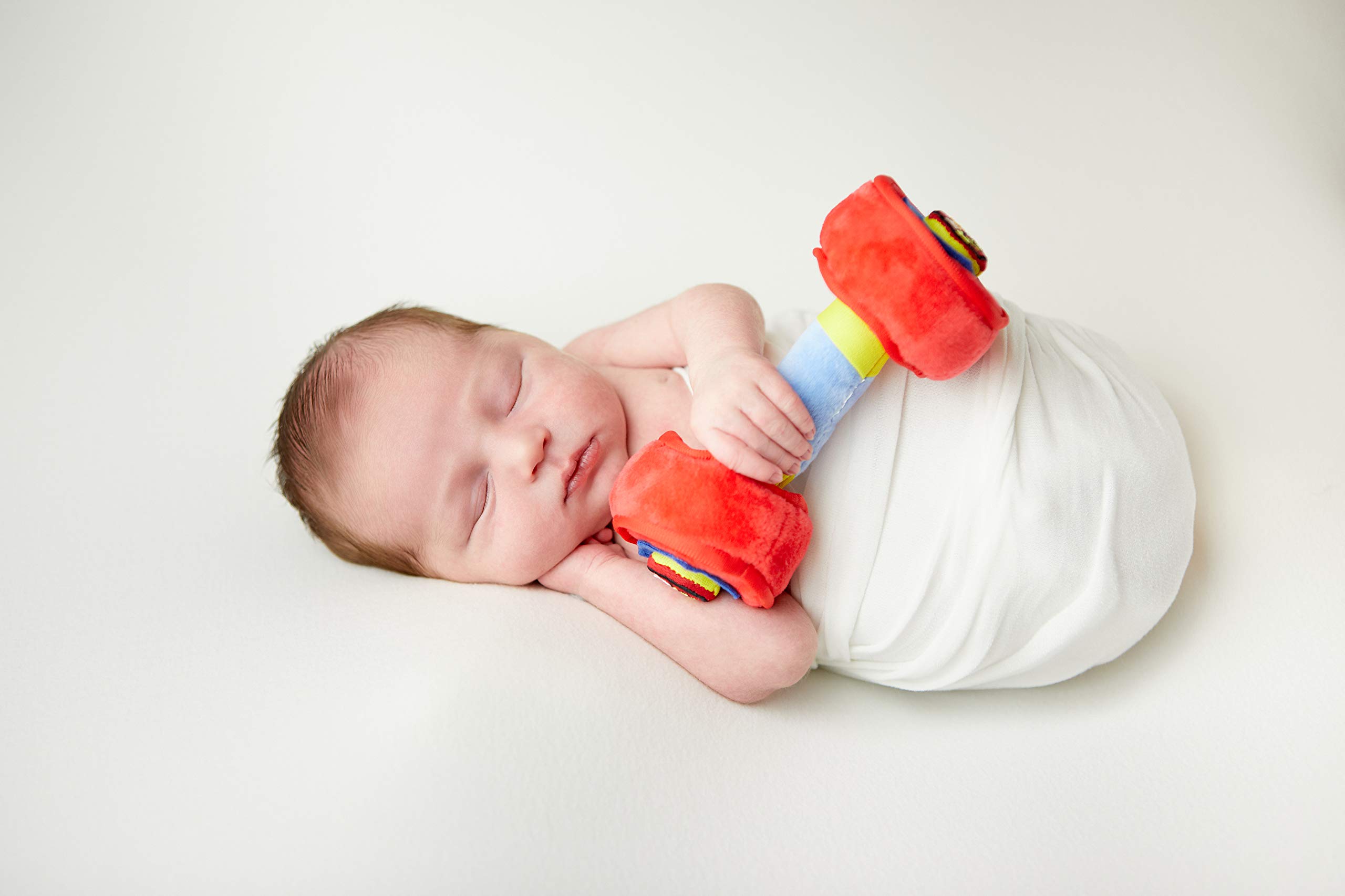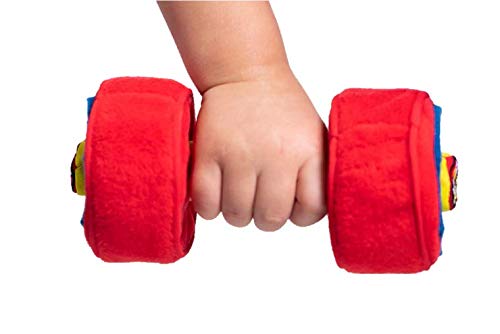WOD Toys Baby Dumbbell! Made with soft hug-able materials that's safe for your newborn or infant. Comfy plush handle with crinkle sound and texture when squeezed. Soft Dumbbells with rattle and stitched hex design to keep baby entertained. Great for newborn pictures, or a perfect way to tell the world that your baby is arriving!