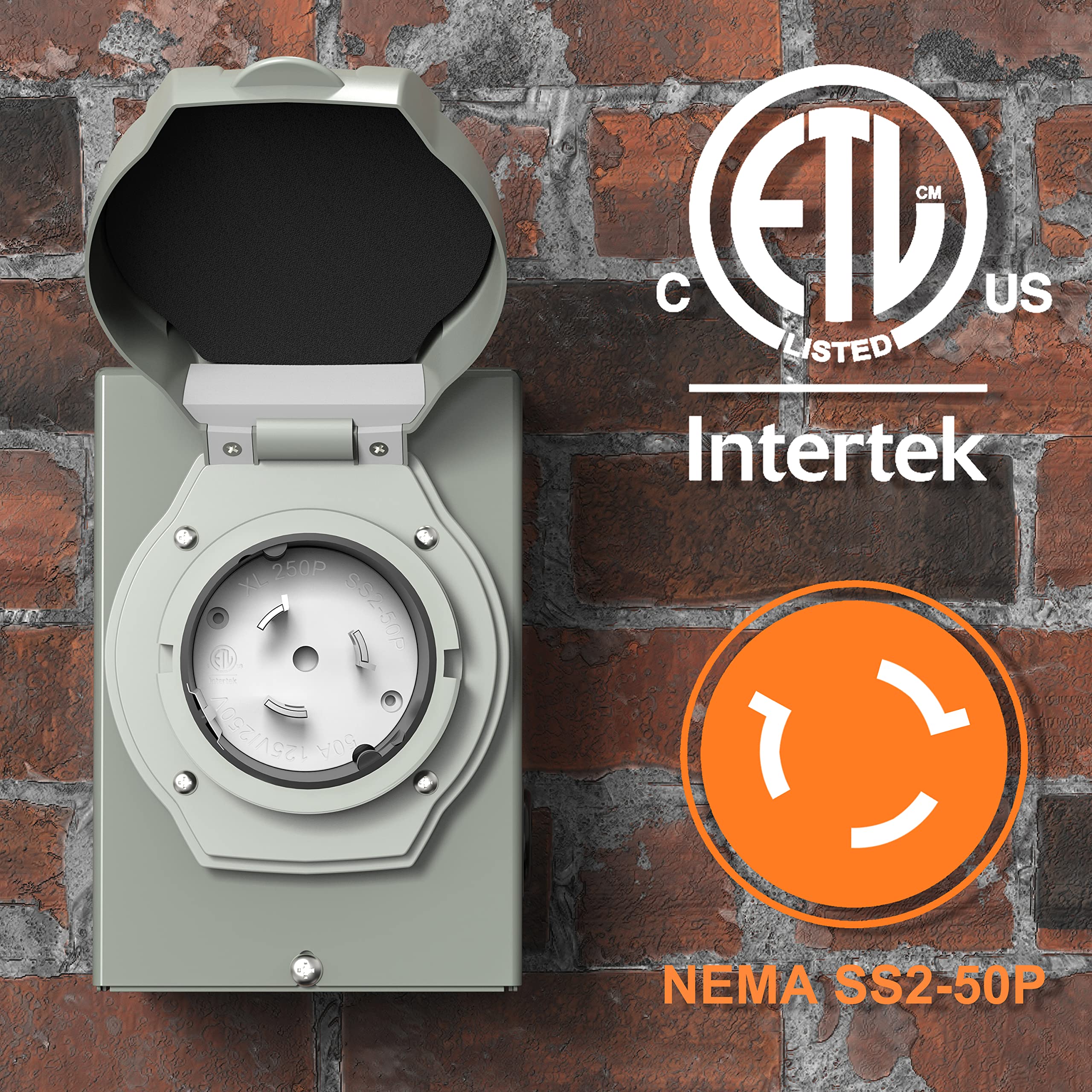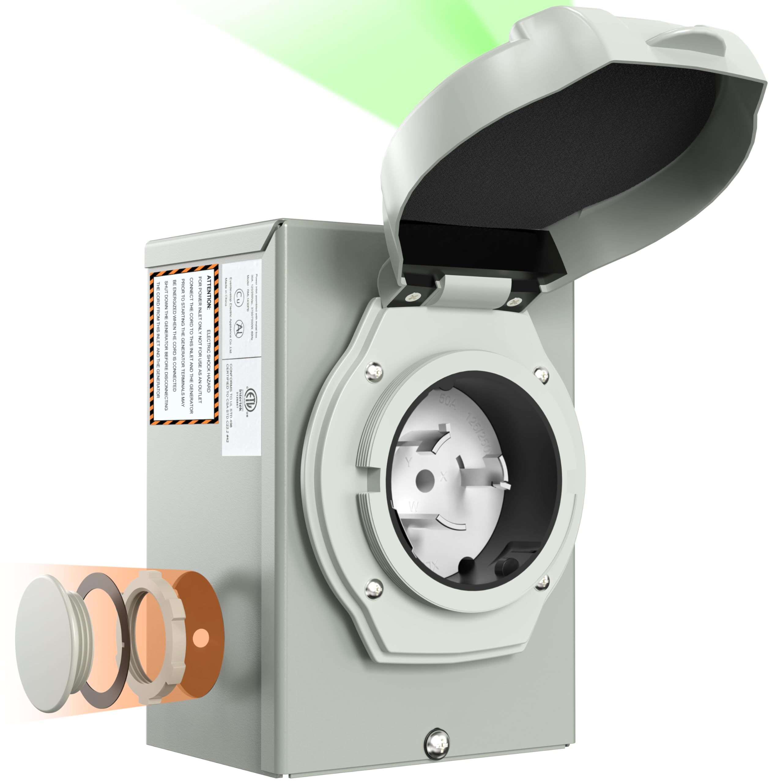 Specification: 50 Amp, 125/250V, 12500W, NEMA SS2-50P twist-lock style power generator inlet box, suit for all 50 amp NEMA SS2-50R generator cords. The best partner for the generator to the house power cord, ETL Certified