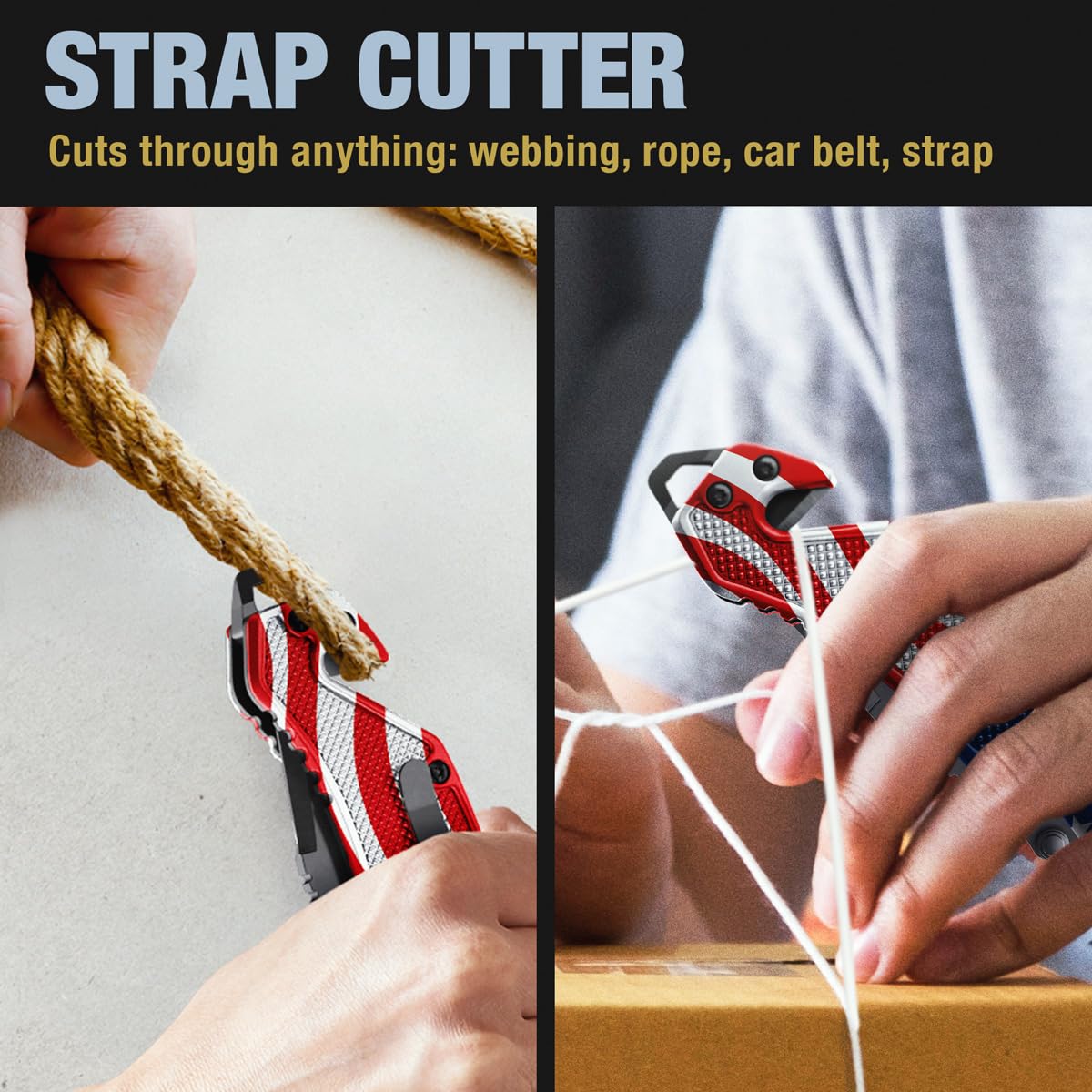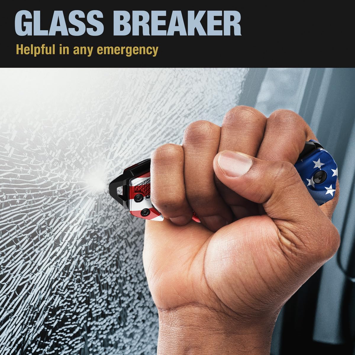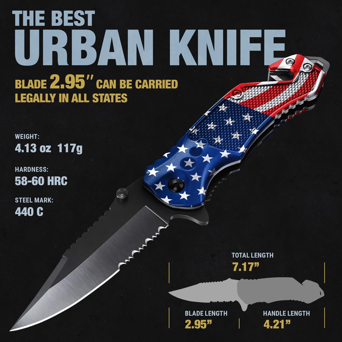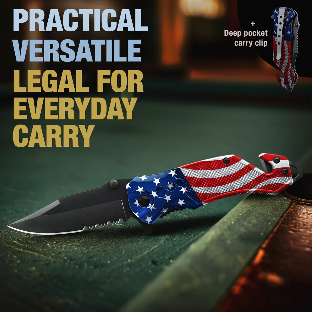 Patriotic knife is a 5-in-1. This versatile pocket knife is legal to carry in all states of the United States. Tactical folding tool equipped with a serrated blade, strap cutter, glass breaker, pocket clip, and lanyard hole. It features a 440C stainless steel blade that's sharp and reliable, complemented by a durable aluminum ergonomic handle. Blade length - 2.95”; Handle length - 4.2”; Overall length - 7.17”; Weight - 4.12 oz.