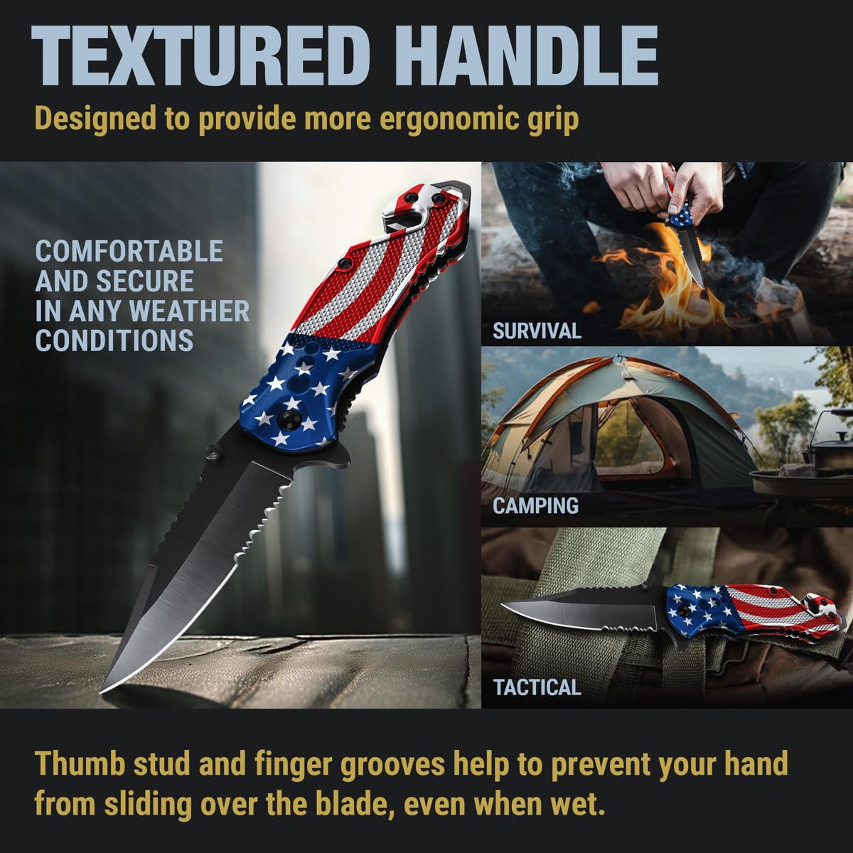 Perfect Everyday Accessory: Our American flag hand folding knife is the perfect accessory for any proud American. Its sleek and compact design makes it an ideal everyday carry item. Whether you're celebrating Independence Day on the 4th of July or just want to showcase your love for the USA, this knife is a symbol of your dedication. Gift for retired men, travelers, outdoorsy men, military men, fisherman, country boy, cyclists, hunters, campers, marines, working men, hikers.