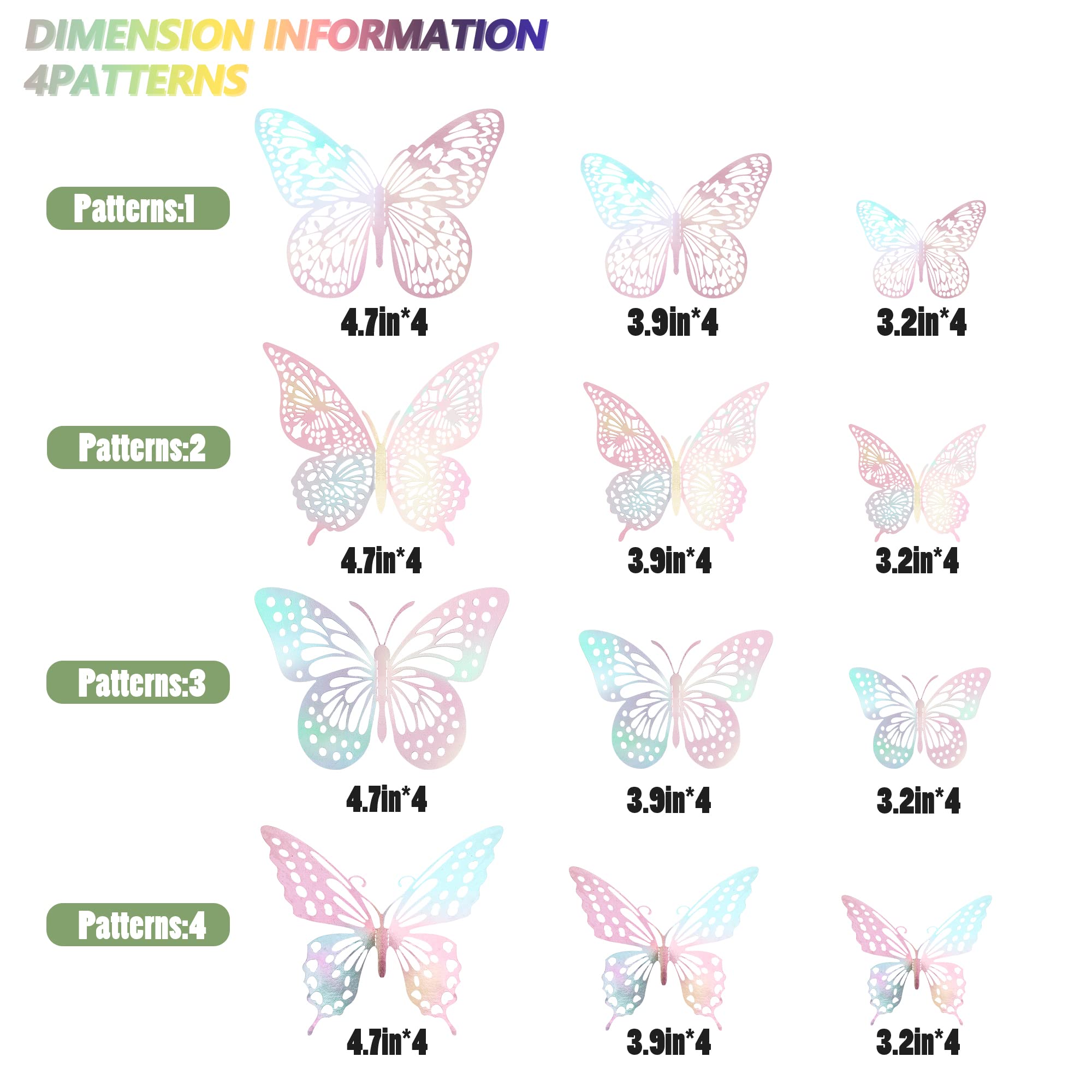 【Package Included】48 pcs butterflies: 12 pcs Style 1, 12 pcs Style 2, 12 pcs Style 3, 12 pcs Style 4, each style has 3 sizes(3", 4", 5"). Coming with 48 pcs double sided adhesive dots.