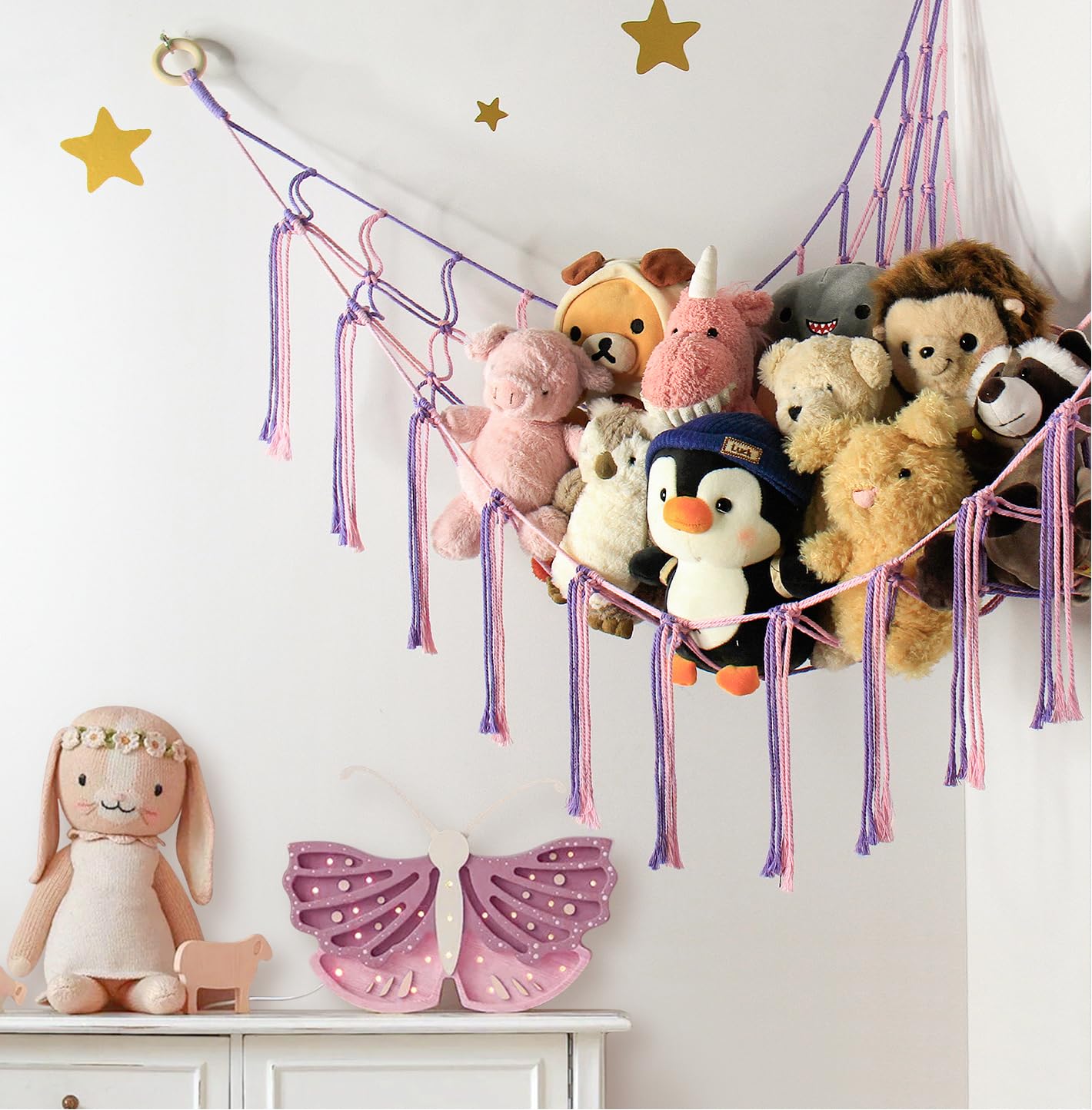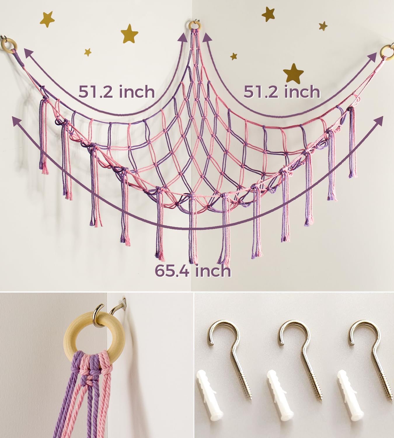 GREAT STUFFED ANIMAL NET:This toy hammock net is made of 100% premium cotton which is environmentally . The traditional handmade macrame rope is applied to the animal hammock which means the hanging net would not loosen or change its shape and ensures a longer durability.