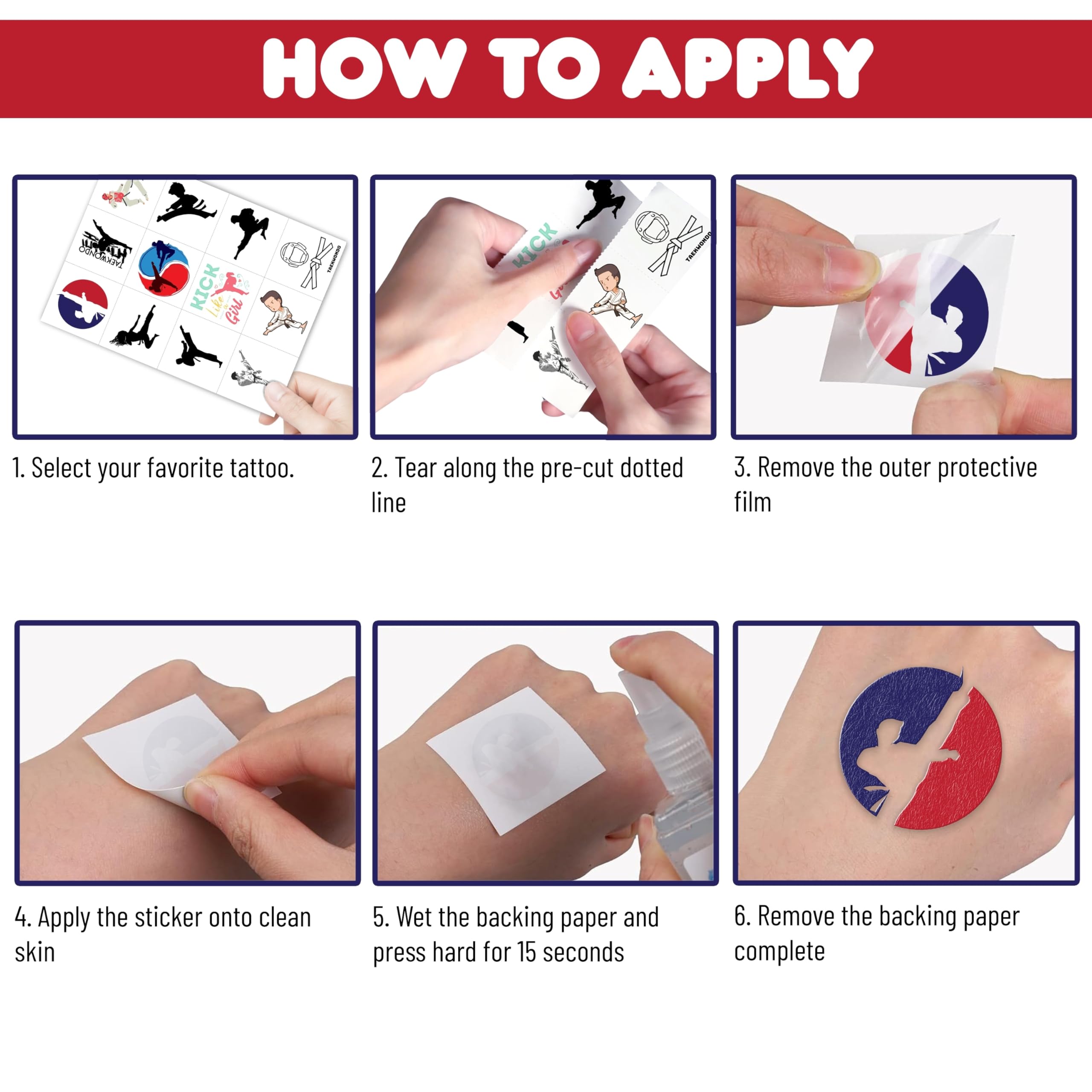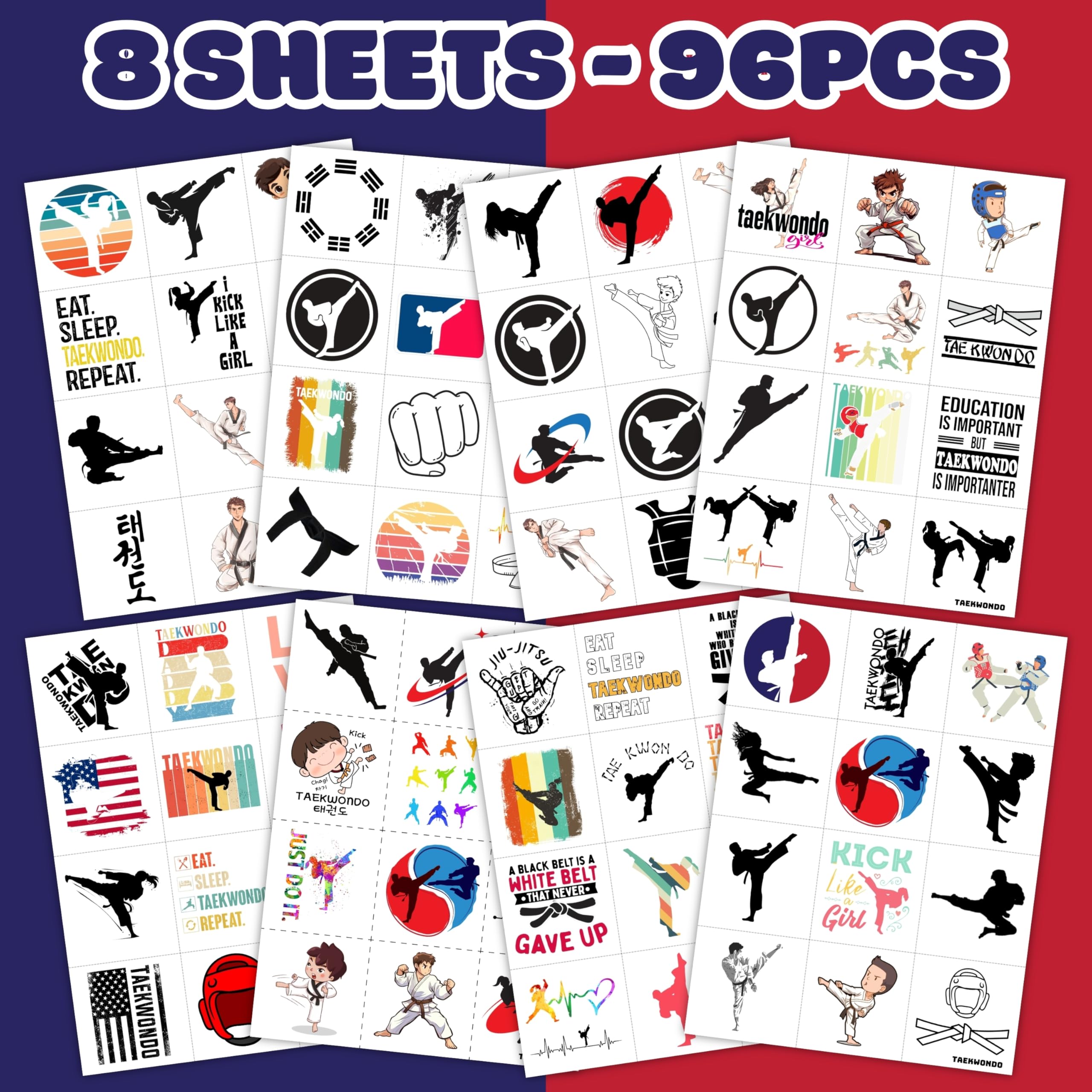 🥋 【IDEAL PRE-CUT TATTOOS FOR THEMED TAEKWONDO DECOR – NO SCISSORS NEEDED】: This set of Pre-Cut temporary TAEKWONDO-themed tattoo stickers comprises 8 sheets in total, featuring 96 adorable, distinct designs. They are excellent for distributing as party favors and small gifts with a TAEKWONDO theme for holidays. Each sheet measures 6.3 * 4.7 inches, making them suitable for kids of all sizes. No scissors needed – just peel and apply!