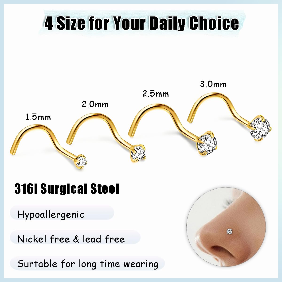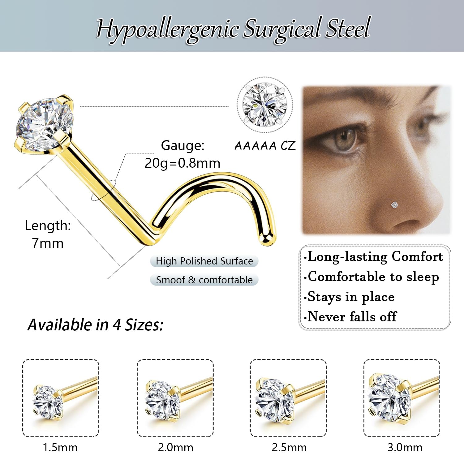 Variety of Sizes Set: 8pcs nose studs in a set, All Gauge--20G(0.8mm); Pin Length: 7mm; Cubic Zirconia Size: 1.5/2/2.5/3mm. The multi-size set is designed to suit your everyday style. The 20Gauge nose piercings stud, adorned with a sparkling crystal, not only enhances your allure but also complements any outfit flawlessly.