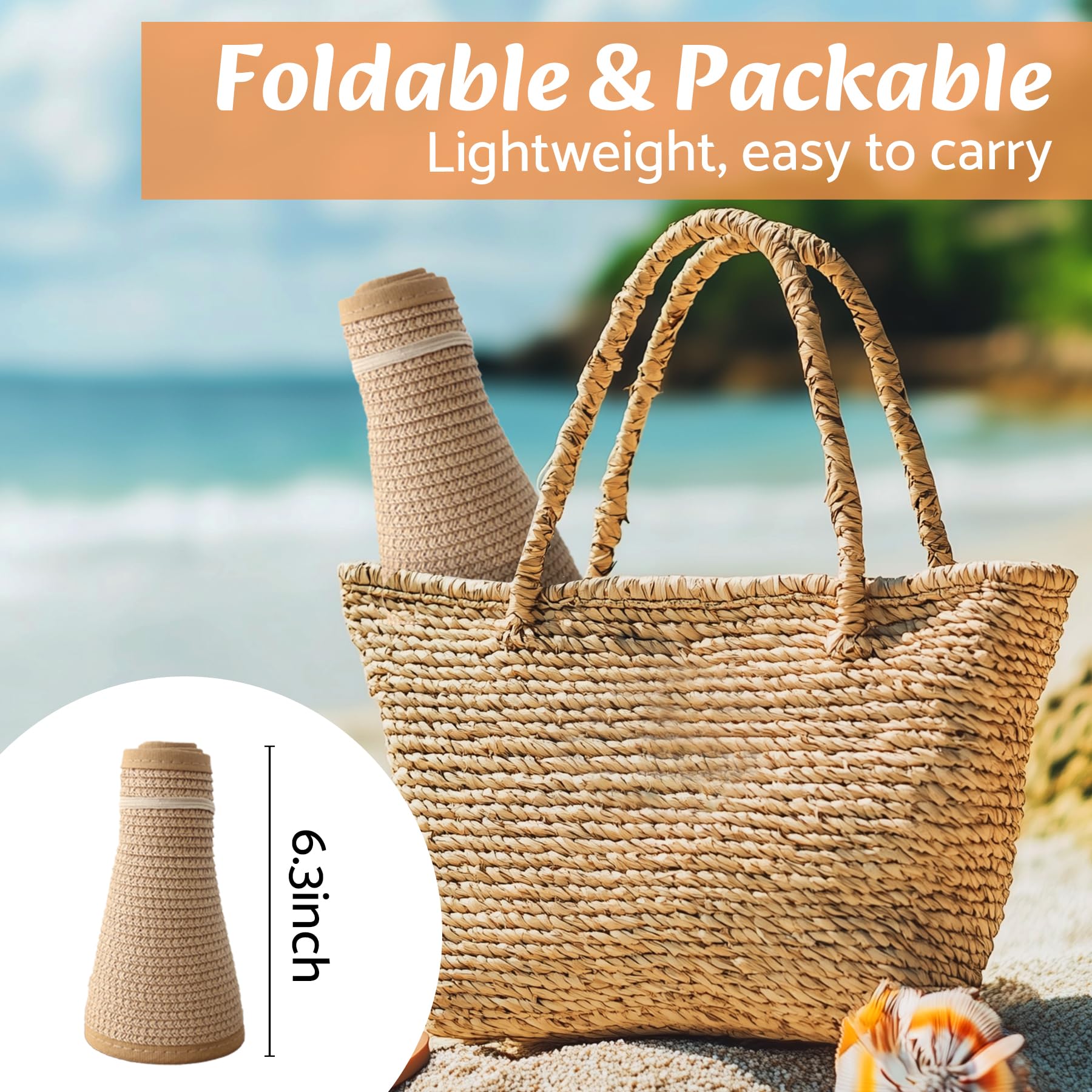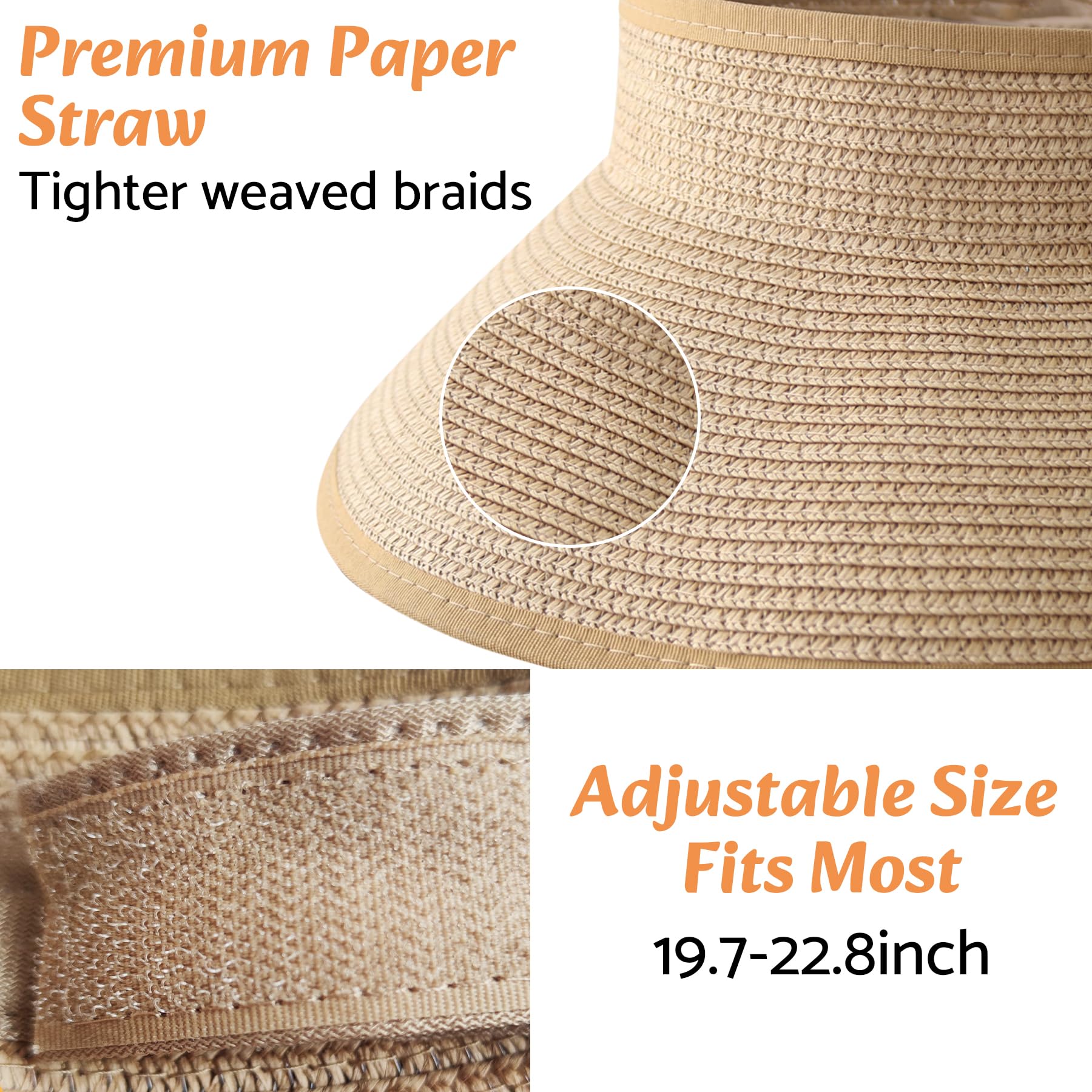 Description SUN PROTECTION: The sun hats for women feature a wide, stable brim that effectively shields your face and neck from the sun. With ample coverage, you can confidently play outdoor activities without worrying about getting sunburned FOLDABLE & PACKABLE: The sun hat is lightweight and foldable, making it easy to carry everywhere. Its foldable design ensures that the brim does not lose its shape, allowing you to protect yourself from the sun's rays wherever you go OPEN-TOP DESIGN: The sun hat not only blocks 98% UV rays but also boasts a functional style. The open-top design allows you to easily tie your hair up in a ponytail without messing up your hairstyle, and keeping it cool and breathable ADJUSTABLE SIZE FITS MOST: The sun hat featuring an adjustable hook and loop fastener at the back, offering a comfortable fit for all head sizes. You can easily adjust the hat's tightness to ensure maximum comfort during you use the hat WIDE USAGE: The sun hat is a good accessory for any outdoor activity, such as beach, pool, park, gardening, or traveling. And the hat is made of high quality paper straw, tighter weave, very strong and stable