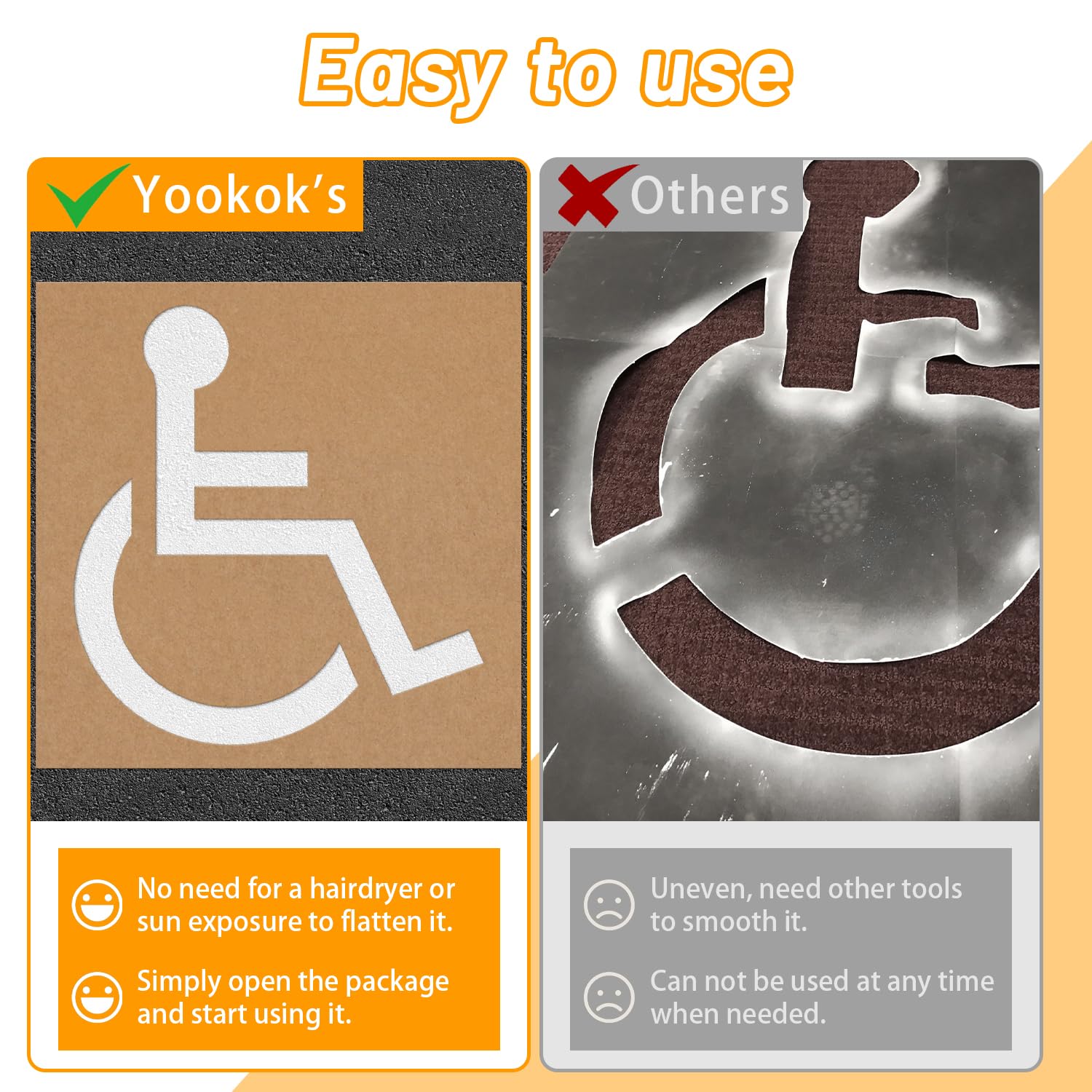Versatility: In addition to marking handicap parking spaces, the Yookok Handicap Parking Stencil can be used for other special parking spaces or traffic signage, offering flexible and diverse applications.