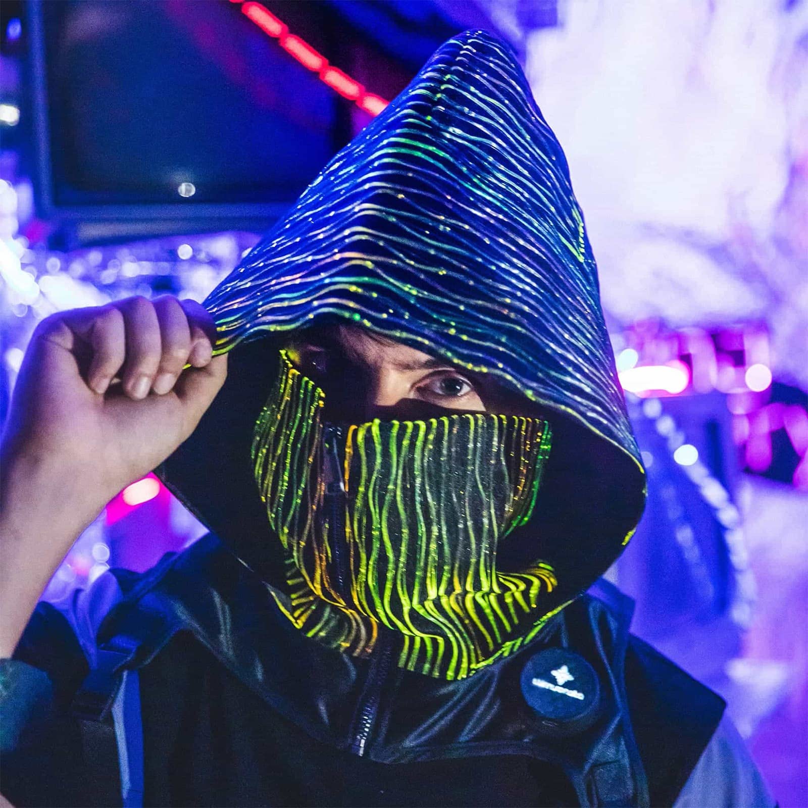 【STAND OUT IN THE CROWD】As a futuristic clothing, the LED cowl hood combines fashion and technology, and is widely popular in electronic music festivals, cosplay, theme parties, clubs, etc. Light up hat can quickly attract everyone's attention, and the effect is best at night.