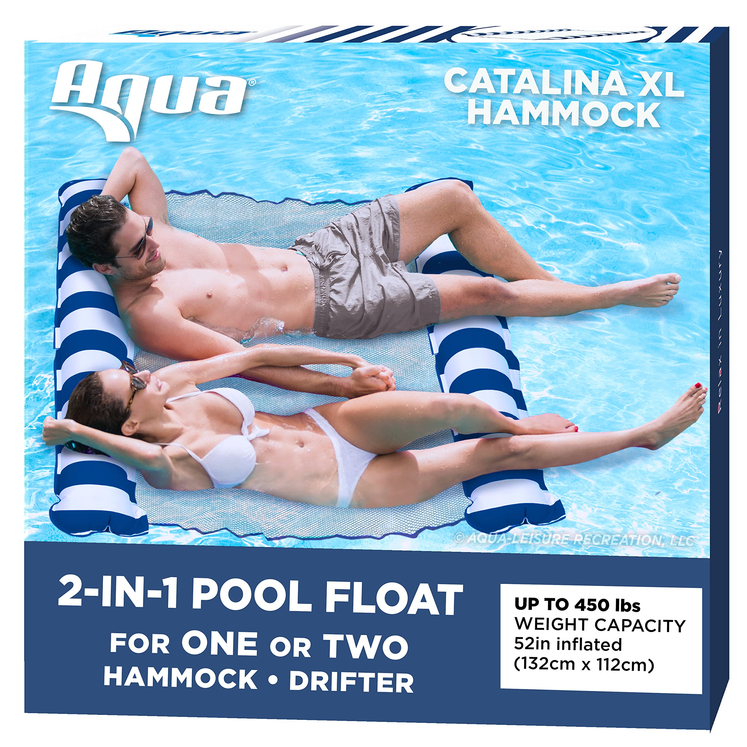 Color: Catalina XL Hammock, Navy/White Relaxing for Two – Spacious for one! Sit back and relax together on the Catalina 3-in-1 Hammock. The hammock’s supportive mesh lining keeps both of you cool at the water’s surface as the inflatable head and leg rests support you comfortably. Our comfortable lounge quickly converts between a hammock, a lounge chair or a drifter—simply roll it up! Ages 15 and up, Weight capacity is 250 lbs.-Versatile: Catalina 3-in-1 Hammock offers 3 unique positions! Hammock, lounge chair, and drifter.Recline-Relax-Dream: Supportive mesh lining keeps you cool as you relax on the water’s surface. Customer Comment: “Easiest pool float to get on and get off of while in the water.”Perfect Size: 50” x 52” (127 cm x 132 cm) Ages 15 and up; Weight Capacity 250 lbs.WARNING: This is not a life-saving device. NEVER leave children unattended while device is in use. Use only under competent supervision. Good safety practices should be followed at all times. Do not over-inflate or use high-pressure air to inflat. Fabric colors may fade if frequently used in high chlorine-salt-bromine chemically treated pool water or ocean-water. More importantly, commercial pools are much higher in chlorine, salt and bromine levels than your average home residential pool. Product color and graphics may vary from those pictured