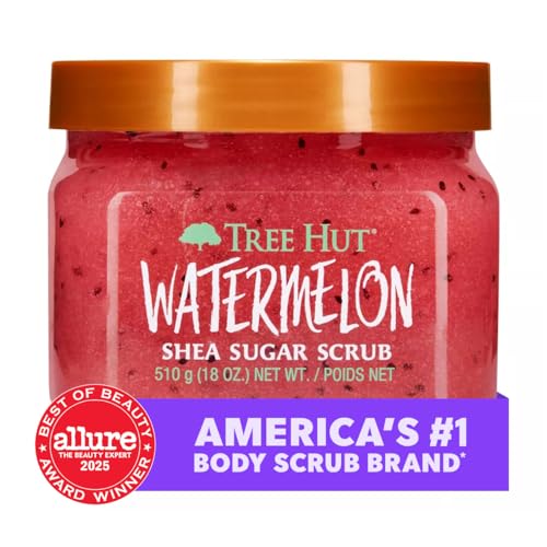 Scrub away the day and reveal soft, glowing skin with our Tree Hut Watermelon Shea Sugar Scrub! Made with real Sugar, Shea Butter, Watermelon, Vegan Collagen, and a blend of six natural oils, this body scrub deeply nourishes and balances skin's hydration to help restore skin's natural glow. The thoughtful ingredients work together to hydrate, renew, and smooth skin while removing dull, dry skin. Plus, our Watermelon scent smells like a burst of hydration with key notes of watermelon, lemon zest and raspberry cotton candy. Tree Hut Shea Sugar Body Scrubs are formaldehyde-free, gluten-free, paraben-free, sulfate-free, and vegan. Apply a generous amount to damp or dry skin, buff in circular motions, and rinse well for skin that feels refreshed, smooth, and radiant. Tree Hut believes that everyone deserves to take time in their day to feel good, even if it's just in the shower or bath. From our Shea Sugar Scrubs and Body Lotions to our Fragrance Mists and Body Washes, we craft delicious and delightful beauty products with exceptional quality. *Naterra calculation based in part on data reported by NIQ through its Syndicated Database service for the Exfoliator/Scrubs category for the latest 52 wks ending 11.02.2024. Copyright © 2024, Nielsen Consumer LLC.