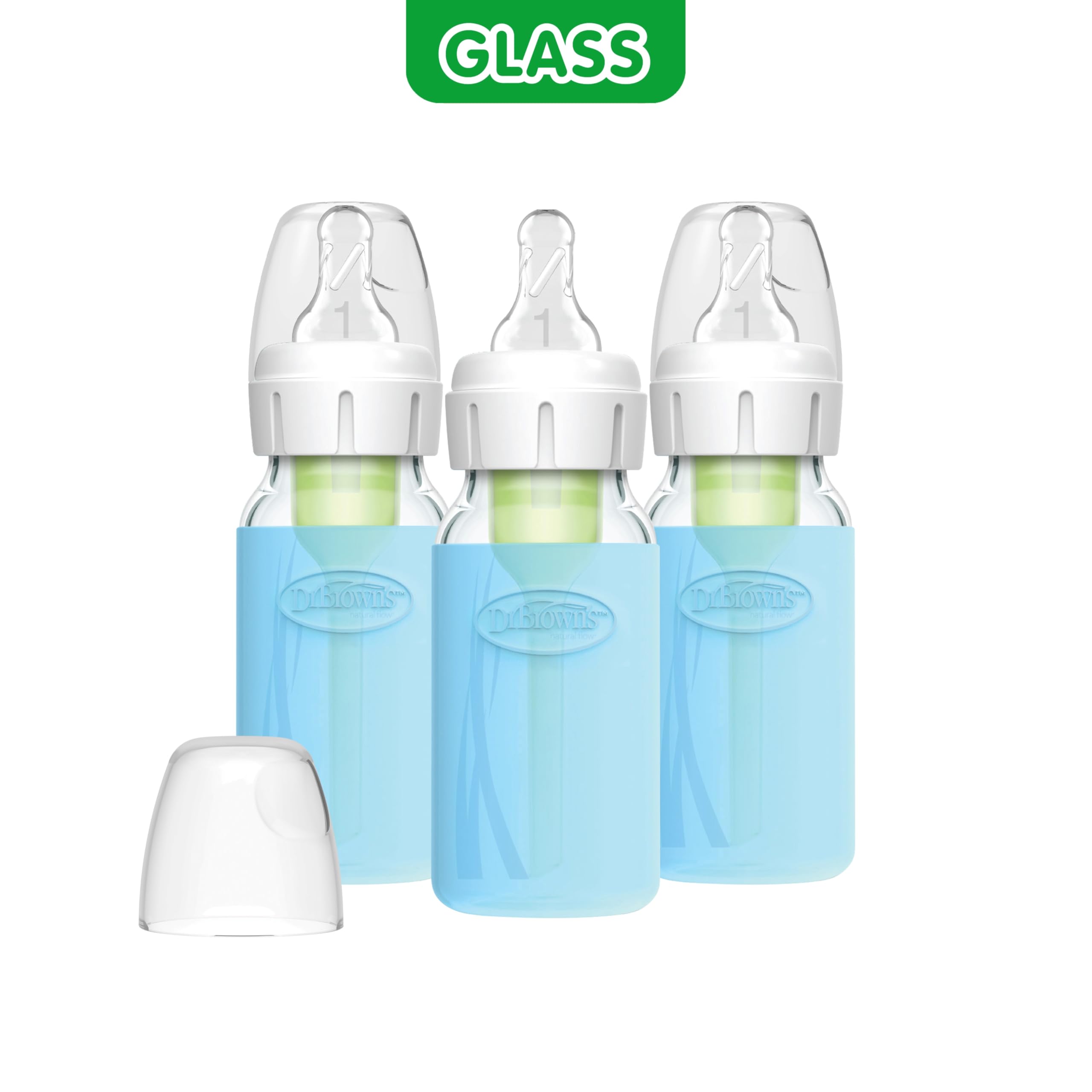 Your options have never been better with Dr. Brown's Natural Flow Anti-Colic Options+ Narrow Glass Baby Bottle. The anti-colic internal vent system is clinically proven to reduce colic. Dr. Brown's bottles provide a more comfortable feeding experience for baby by decreasing spit-up, burping, and gas. The vacuum-free feeding is closest to breastfeeding and Dr. Brown's silicone nipples provide a consistent flow so baby can feed at their own pace. The breast-like nipple shape encourages a proper latch for a more natural bottle-feeding experience and eases the transition from breast to bottle and back again. Dr. Brown's vent system is proven to help preserve bottle milk nutrients and aids in digestion for a better night's sleep. The silicone nipple, together with the internal vent system, offer a reliable and trusted bottle-feeding experience that makes Dr. Brown's the #1 Pediatrician Recommended Baby Bottle in the U.S.* Dr. Brown's Glass bottles are heat and thermal shock-resistant, which can withstand hot and cold temperatures, along with gradual temperature changes. Made to grow with baby, our bottle is designed to nourish through all of baby's feeding stages. Also included are three removable silicone bottles sleeves to help protect Dr. Brown's Options+ Glass Bottles against breakage while feeding, sterilizing, or washing. Safe for use in dishwasher (top rack only), electric and microwave sterilizers or boiling water. BPA Free. *IQVIA Health ProVoice Survey 2024.