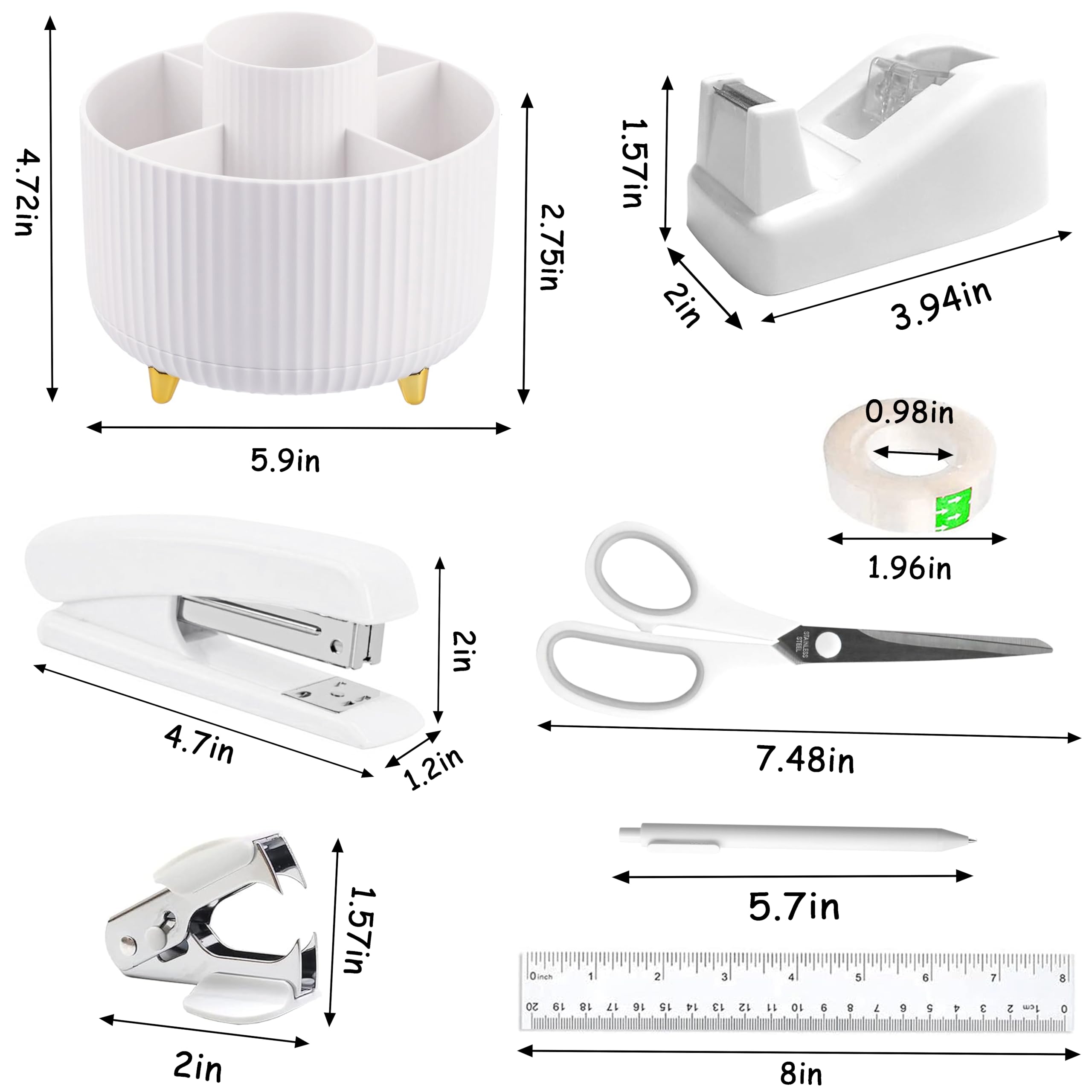 【Package Includes】10pc white office supplies for desk includes 1 Pencil Holder For Desk, 1 Tape Dispenser, 1 Stapler, 1 Staple Remover, 1000 Staples, 1 Tape, 1 cute 4-grid Clips Set(including 40 paper clips, 3 large binder clips, 5 small binder binders, 25 thumbtacks), 1 Ruler, 1 Scissor, 1 Ballpoint Pen. Our office accessories can meet your daily office and study needs.