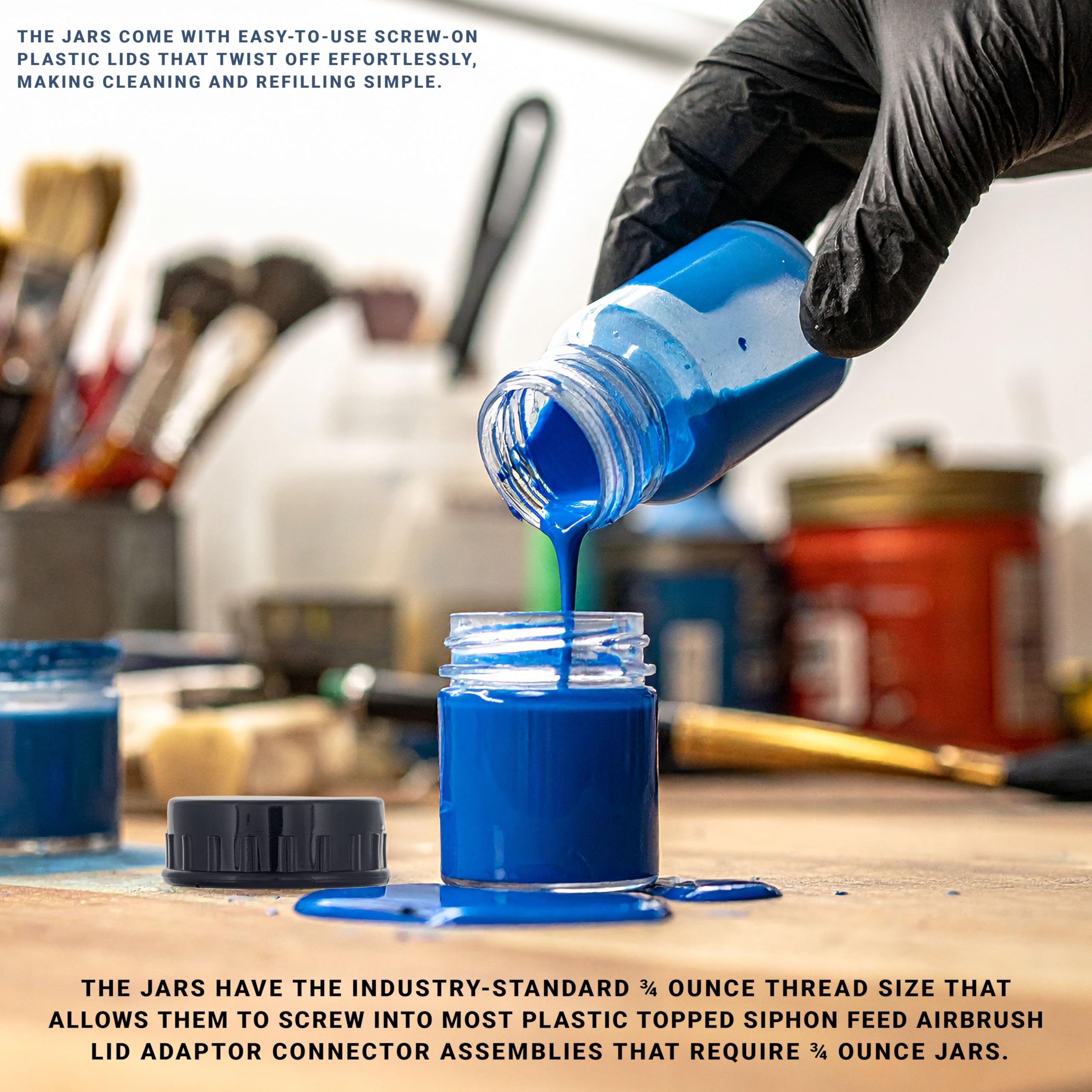 The jars have the industry-standard 3/4 ounce thread size that allows them to screw into most plastic topped siphon feed airbrush lid adaptor connector assemblies that require 3/4 ounce jars.