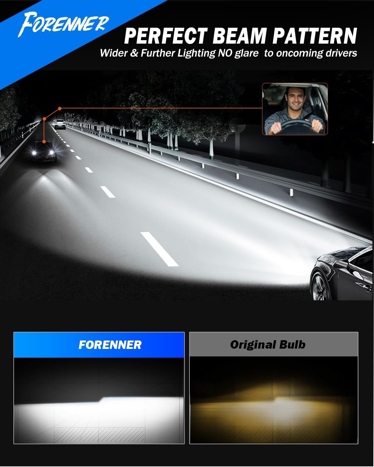 【Perfect Beam Pattern – No Glare, No Dark Spots】Forenner HB3 H9 bulbs are precisely aligned to match the original filament position, creating a clean, focused beam with no glare, shadows, or dark spots. The cut-off line improves nighttime visibility without blinding oncoming traffic, ensuring a , more comfortable drive and others on the road.
