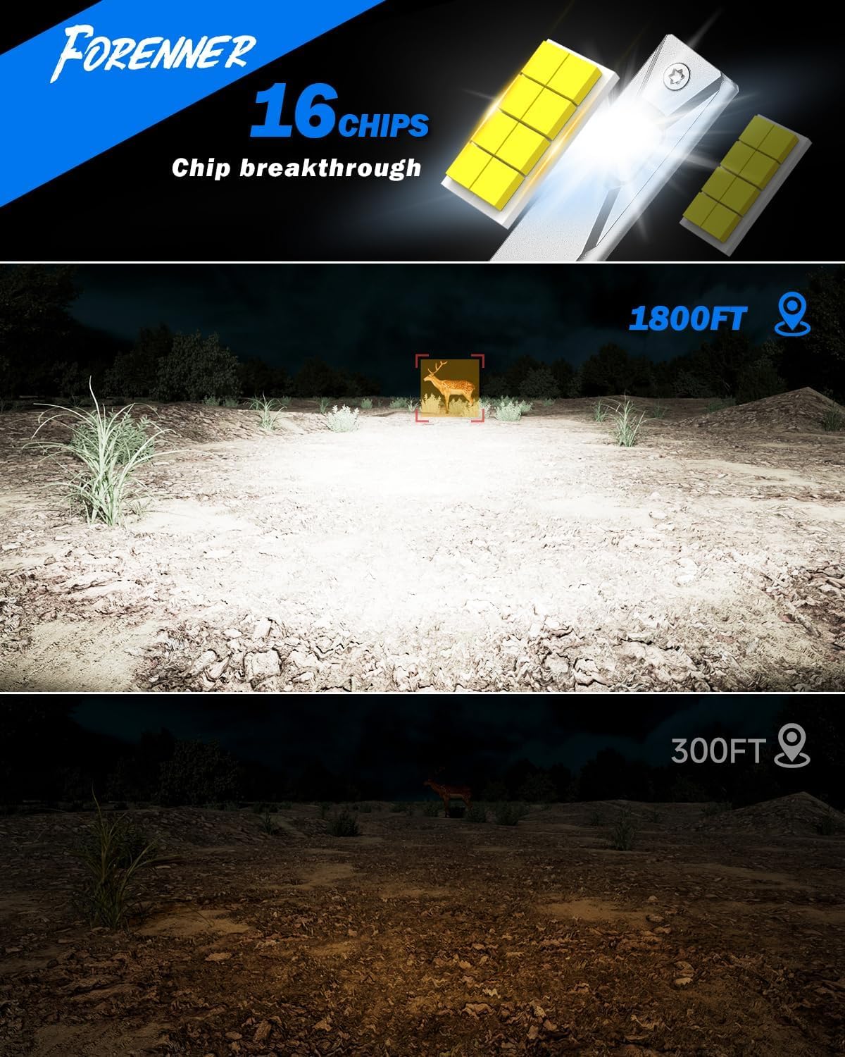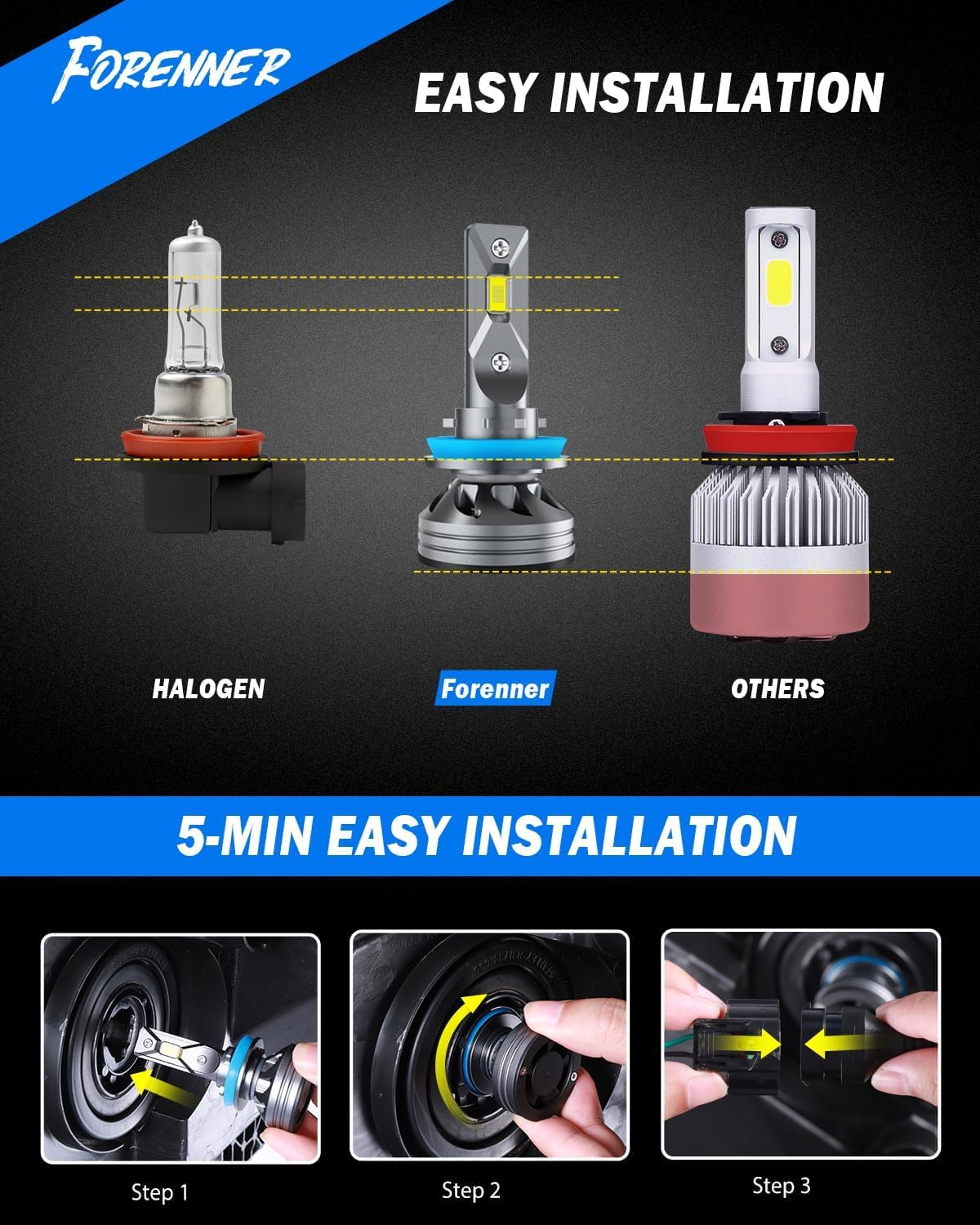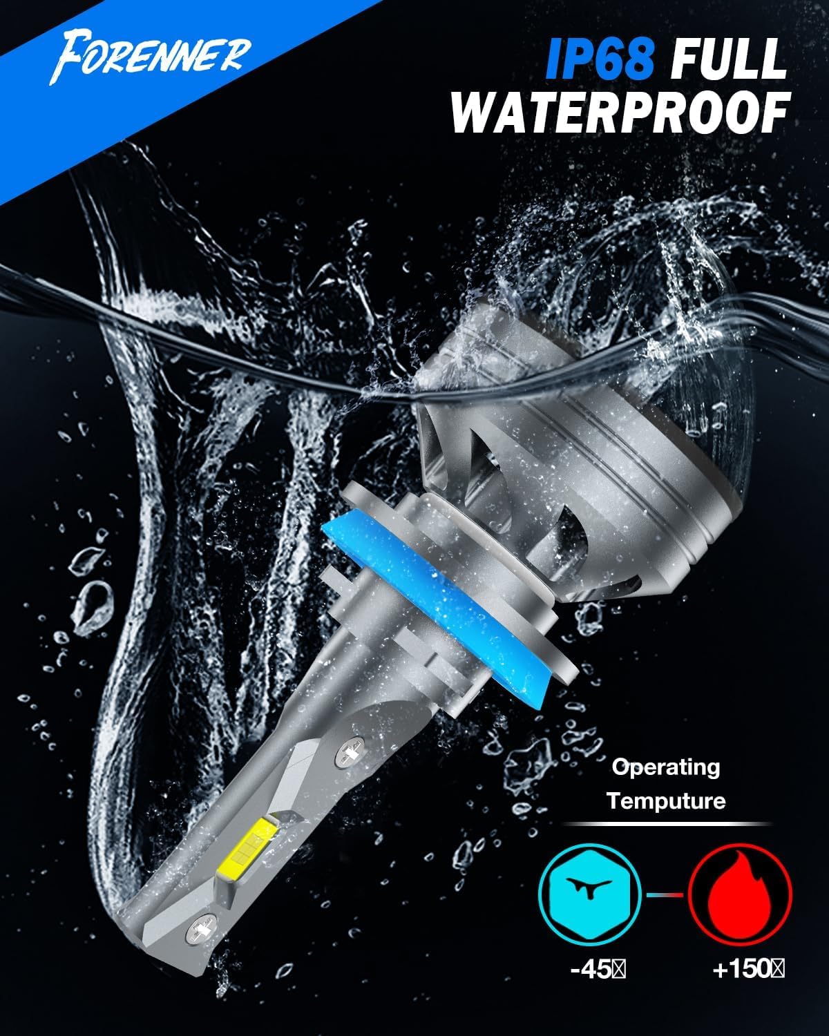 【900% Brighter Than Stock Bulb– Drive with Superior Clarity】FORENNER H11 9005 bulbs are equipped with 16 high-output CSP chips, delivering up to 1000% more brightness than stock bulbs. The 6500K cool white light provides visibility and reduces eye strain, helping you see farther and at night for , more confident driving in any low-light condition.