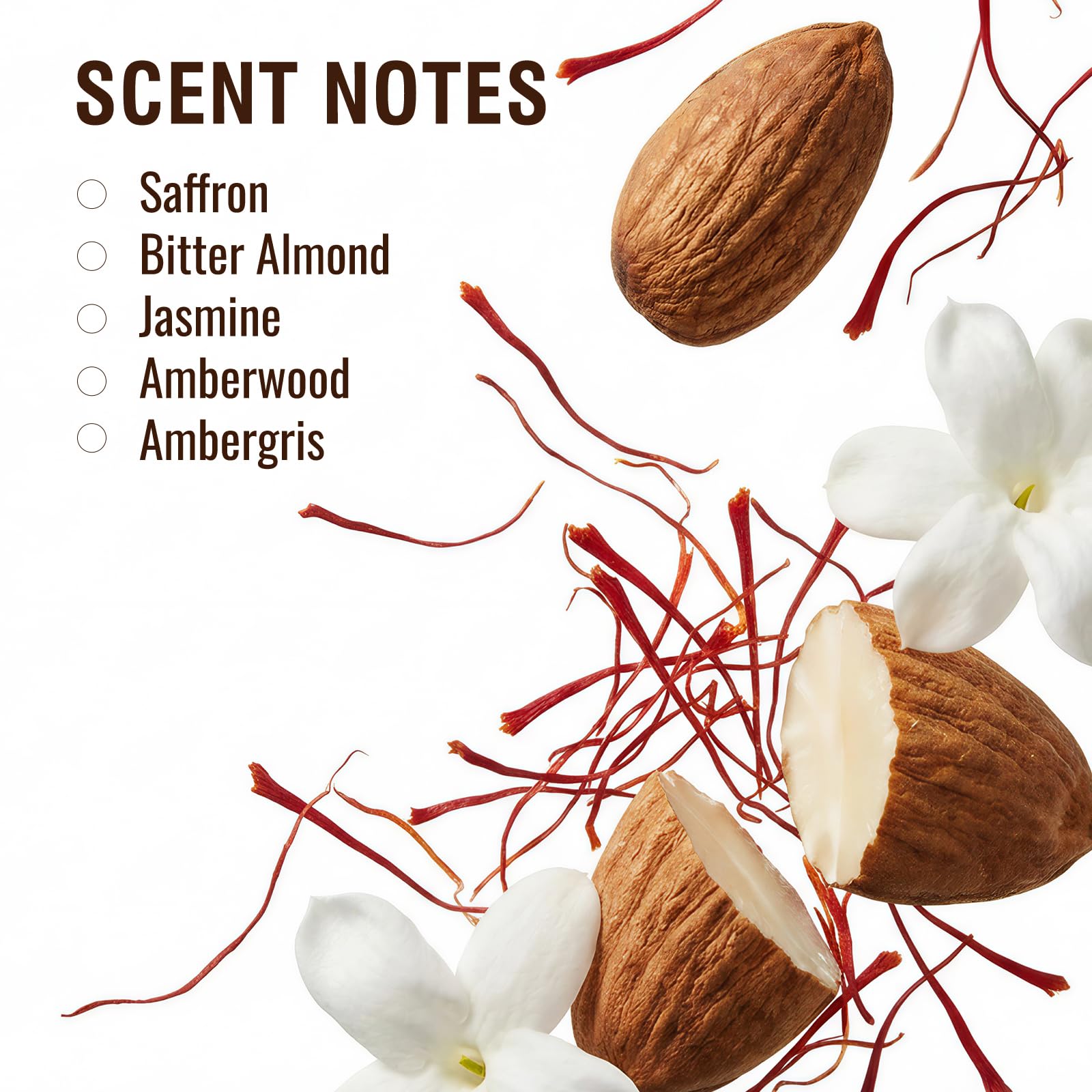 ✦ Elegant Floral Amber Scent Profile This women's perfume opens with saffron and almond brightness, develops into a warm amberwood and oak moss heart, and settles into smooth cedarwood, musk and ambergris for a balanced, layered fragrance.