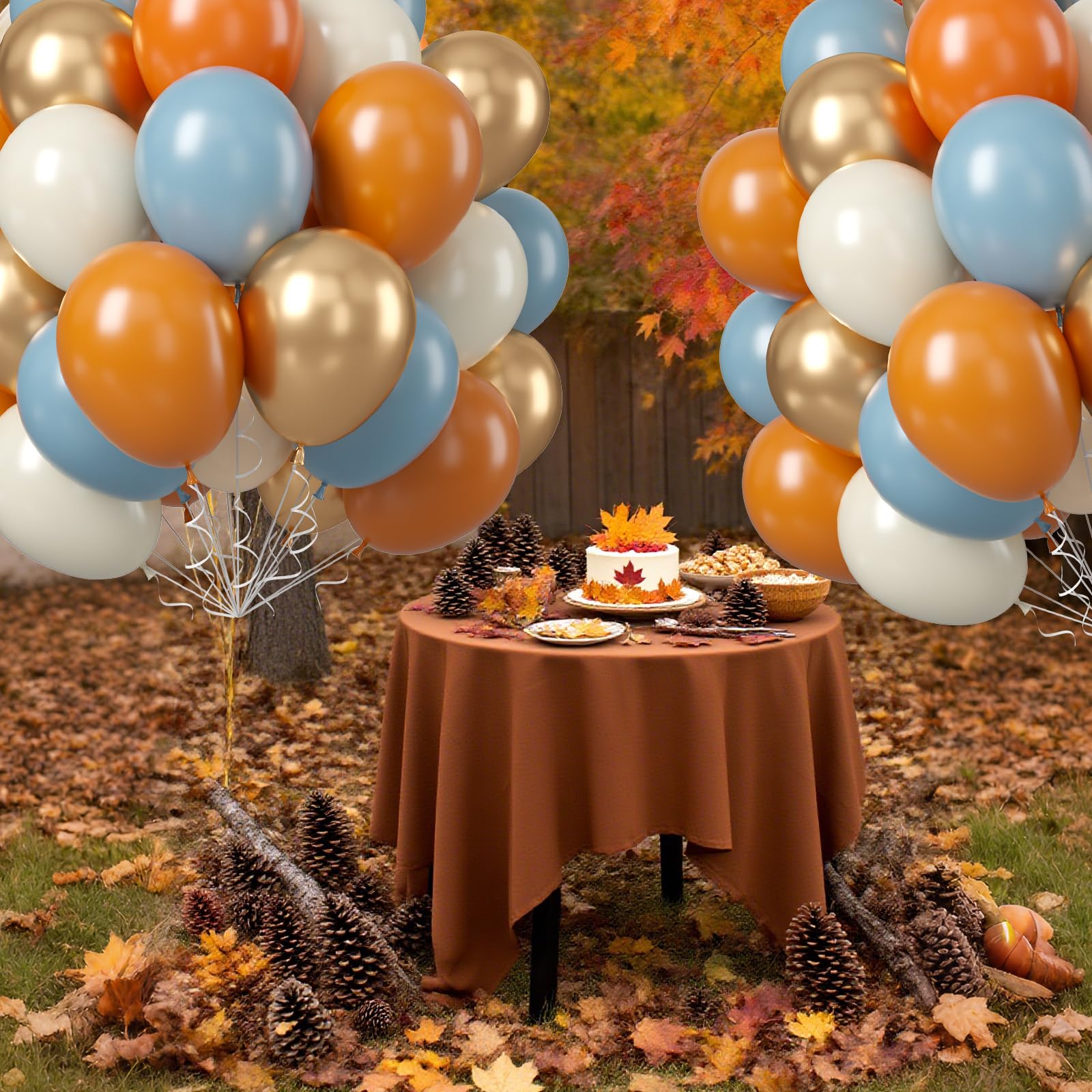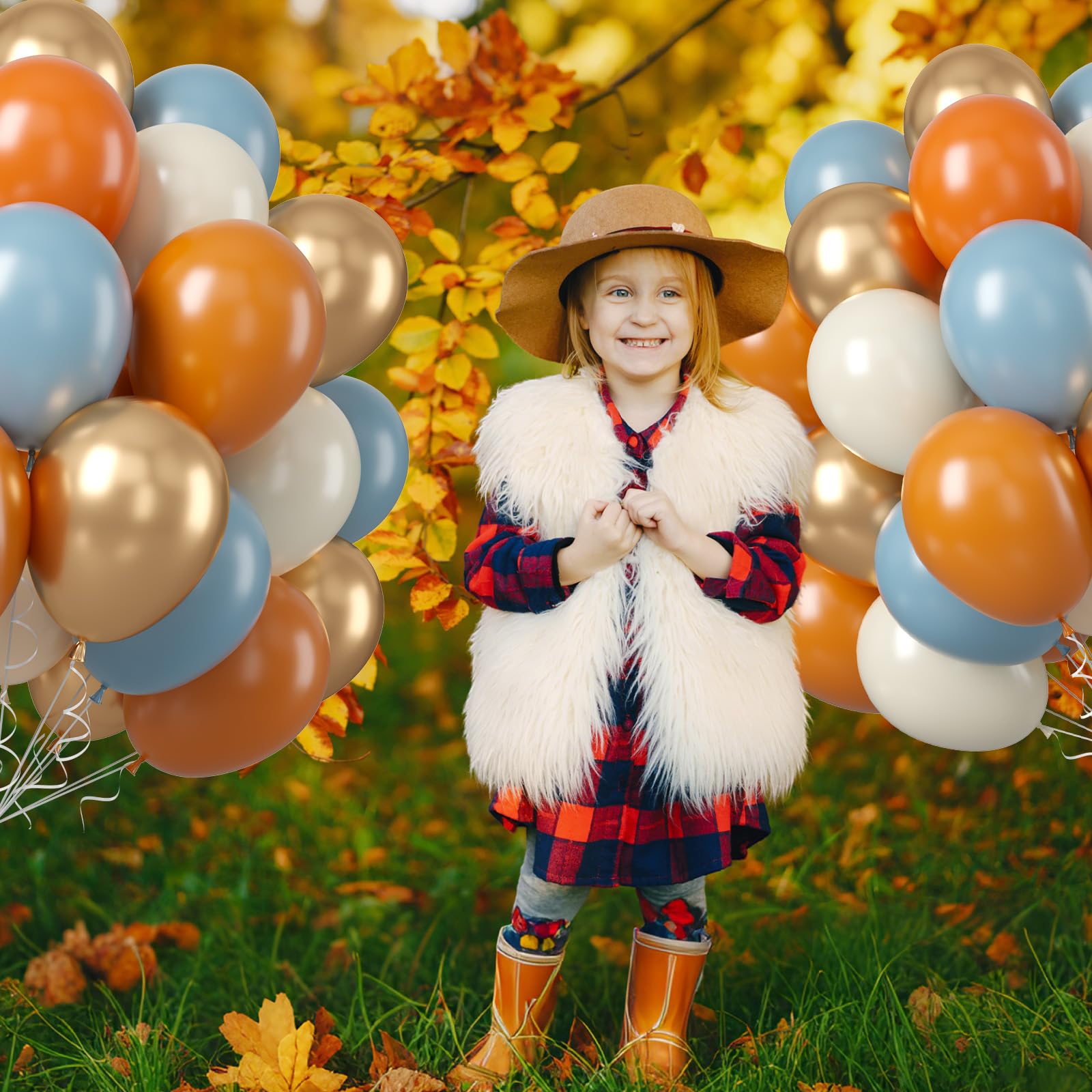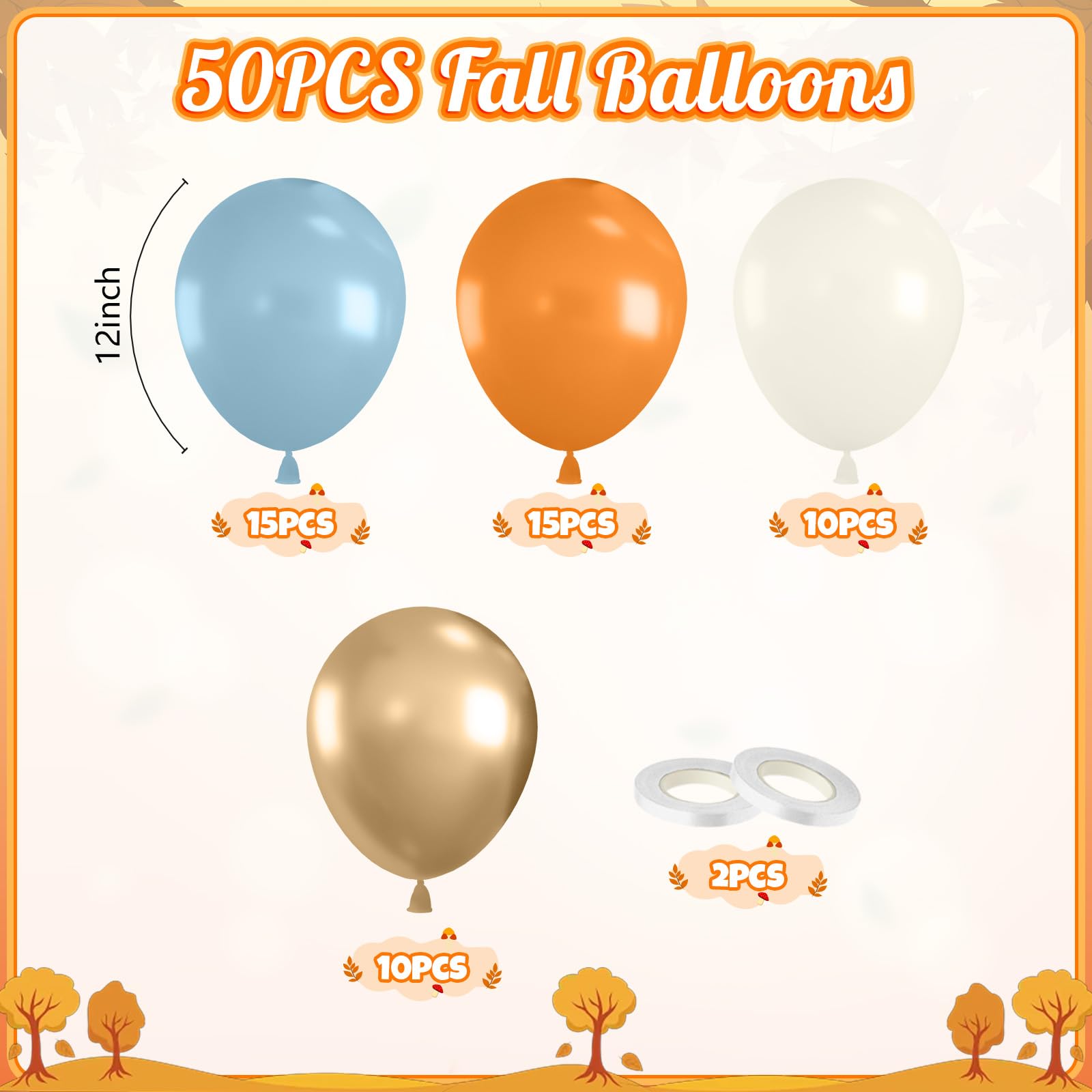 12Inch Fall Balloons Set: include 15* mist blue balloons, 15*dusty blue balloons, 10* sand white balloons, 15* burnt orange balloons, 8* metallic champagne gold balloons, 2 * ribbon. Our fall thanksgiving party balloons can be used to DIY hula hoop balloon garlands and then used to decorate dessert tables, or can be hung on the wall for decoration, or used as photo props.