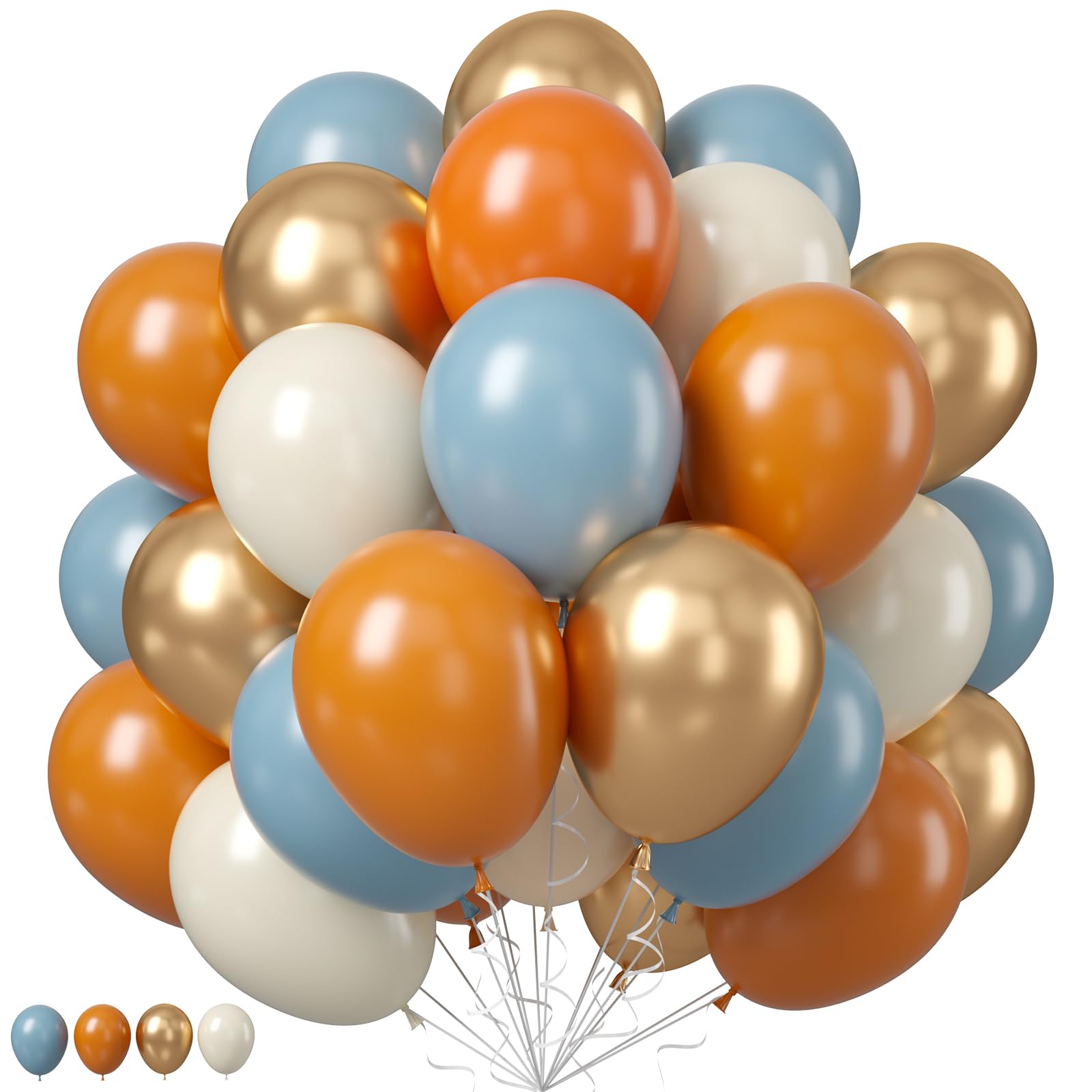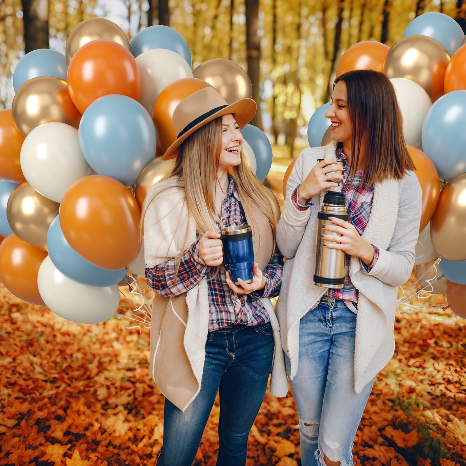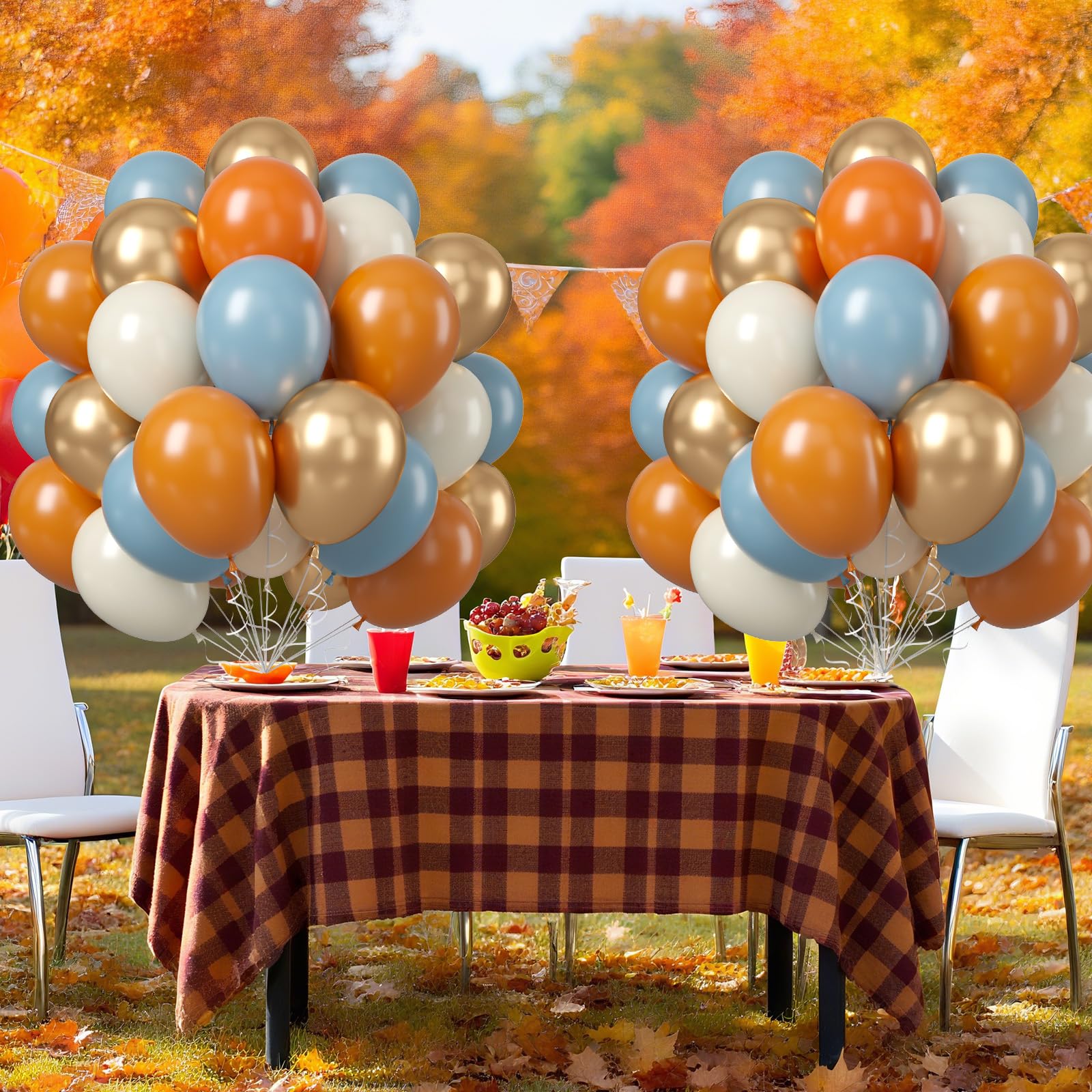 12Inch Fall Balloons Set: include 15* mist blue balloons, 15*dusty blue balloons, 10* sand white balloons, 15* burnt orange balloons, 8* metallic champagne gold balloons, 2 * ribbon. Our fall thanksgiving party balloons can be used to DIY hula hoop balloon garlands and then used to decorate dessert tables, or can be hung on the wall for decoration, or used as photo props.