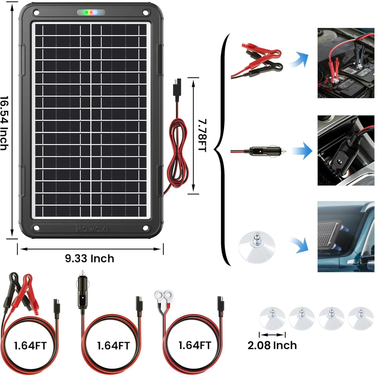 Stronger & More Long-lasting: The 15W solar car battery charger adopts high-transparency glass, which is high-strength, impact-resistant, wind-snow-resistant low-iron tempered. This waterproof solar battery charger needs no additional maintenance