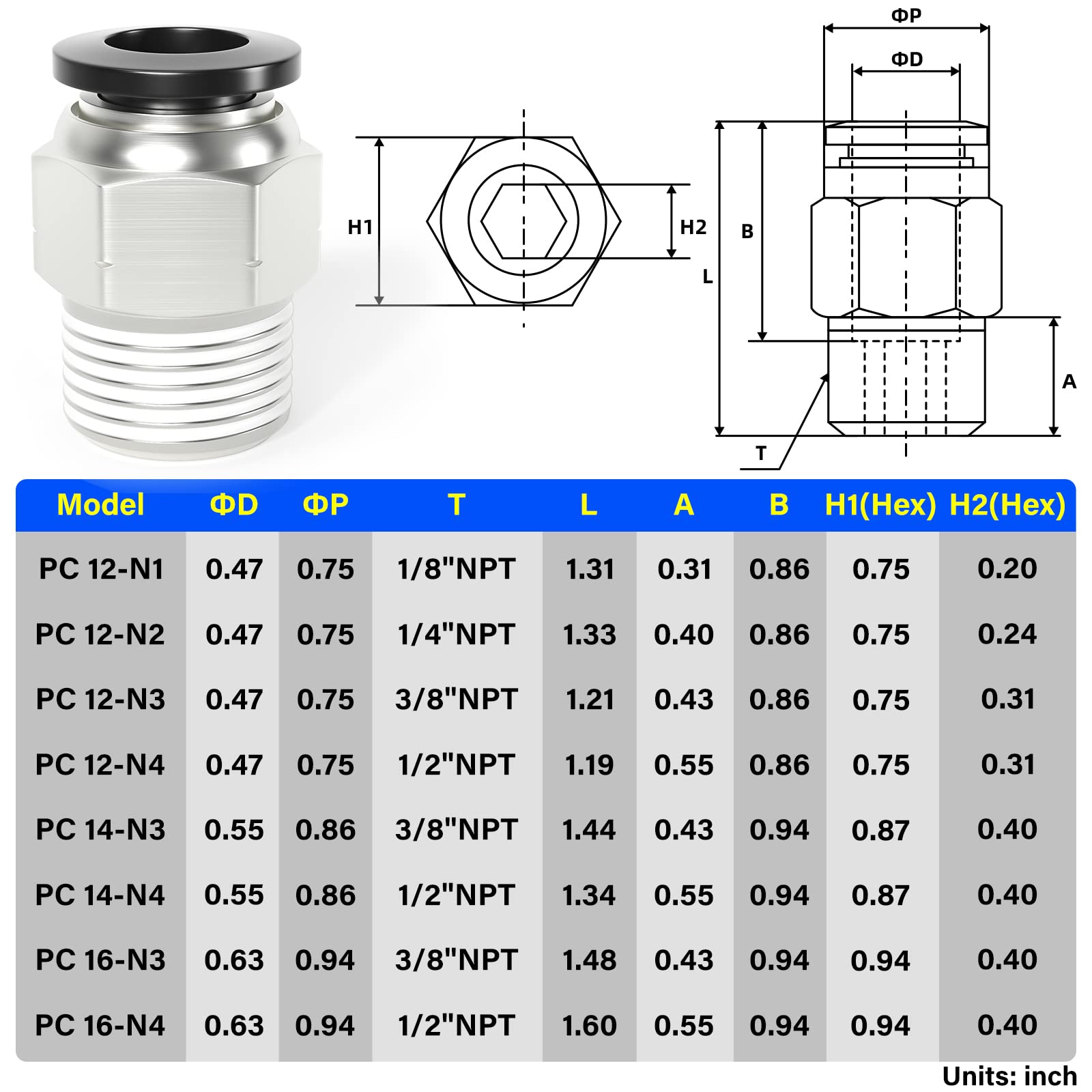 【Size】12mm Tube OD x 3/8" NPT Thread,Notice - NPT Thread Size is a Nominal Pipe Size, and it Does Not represent the actual diameter