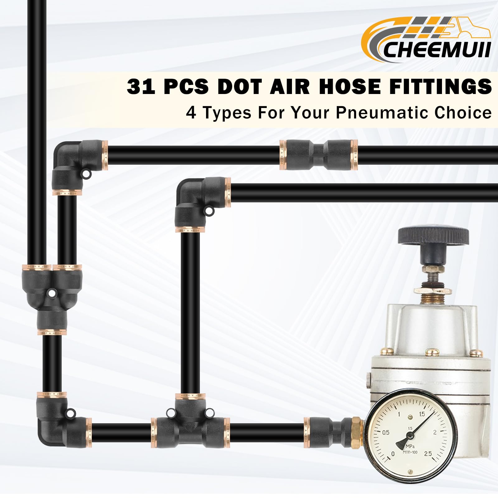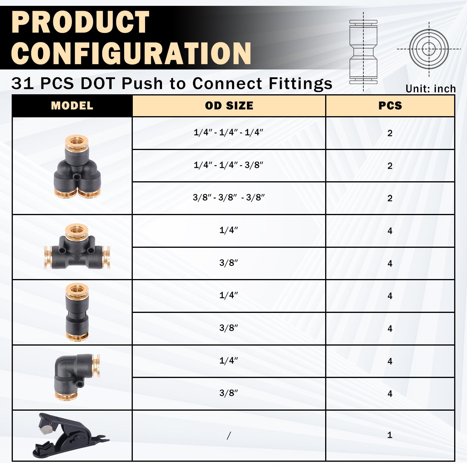 31 PCS PACKAGE: The DOT air brake fittings kit includes: 4 pcs 1/4" tee fittings, 4 pcs 3/8" tee fittings, 4 pcs 1/4“ straight union, 4 pcs 3/8“ straight union, 4 pcs 1/4" 90°elbows, 4 pcs 3/8" 90°elbows, 6 pcs Y splitters, 1 pc tube cutter. Air brake fitting assortment types: 1/4", 3/8"