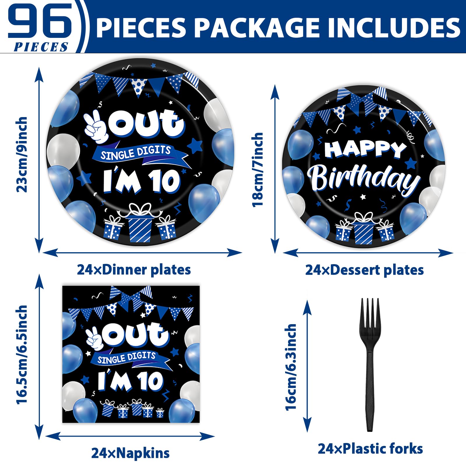 Package includes: The 10th birthday party tableware set includes everything you need for a birthday party, serving up to 24 guests with 10th birthday dinner plates, happy birthday dessert plates, double digits napkins, and black forks. This ensures you have enough tableware for a larger gathering without needing to purchase additional items.