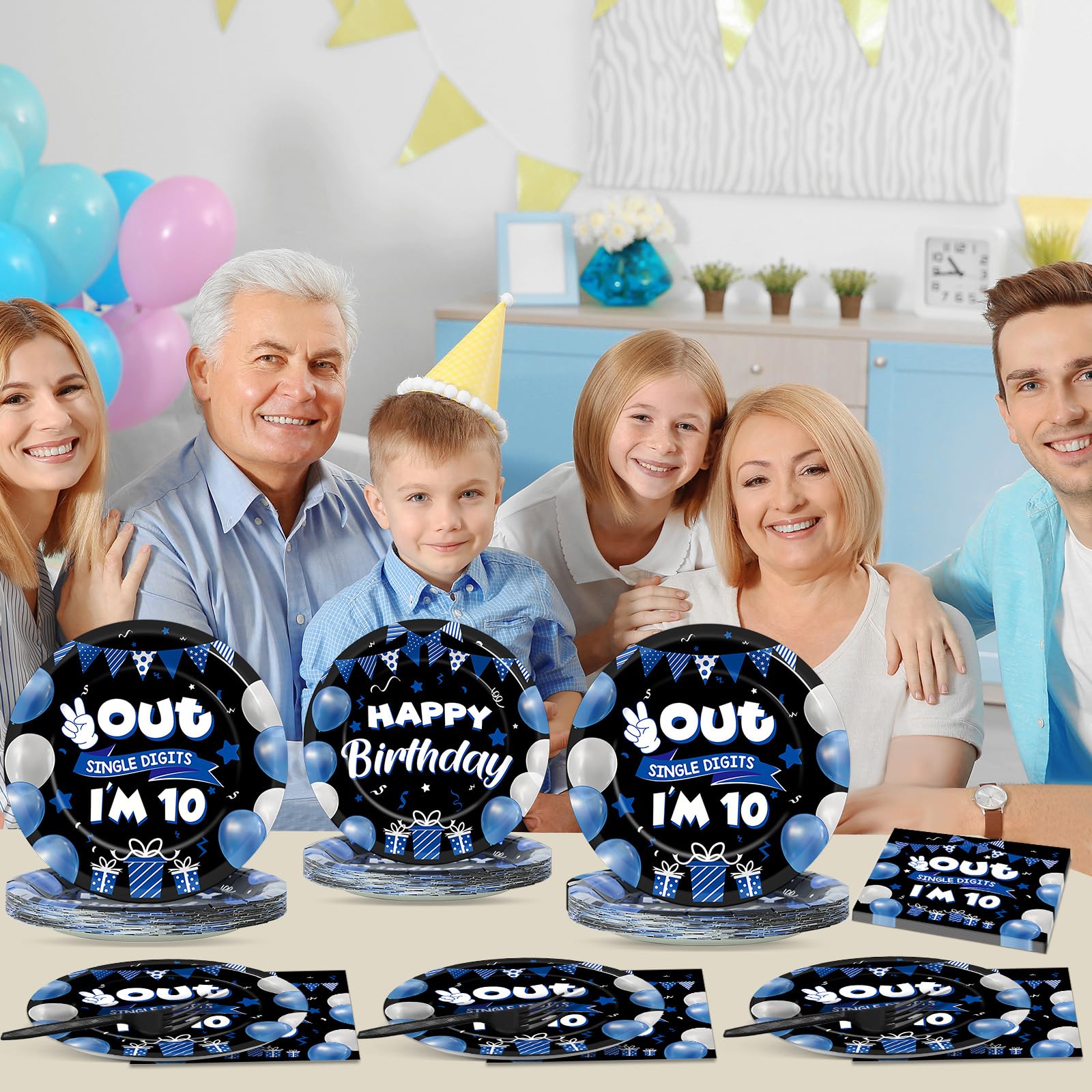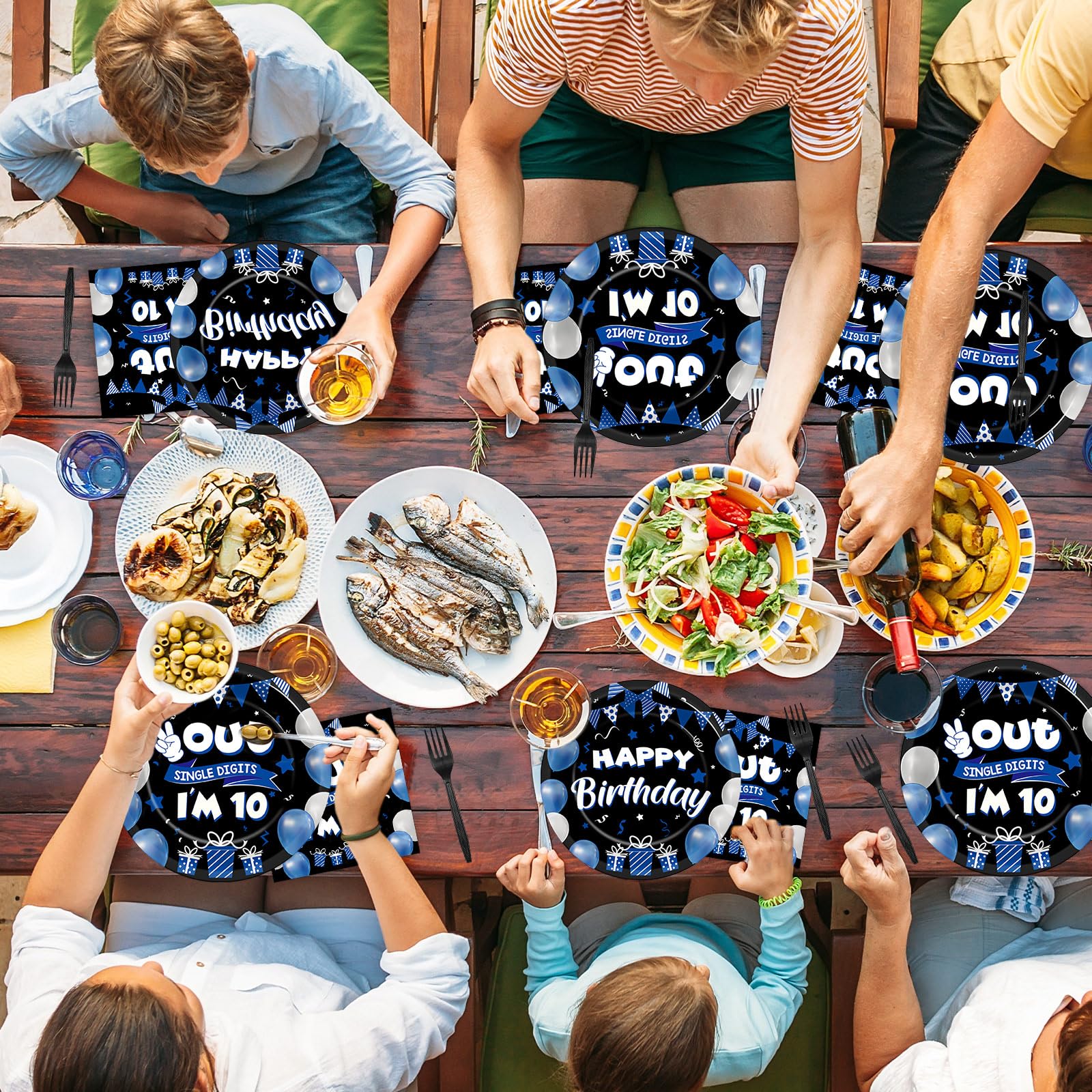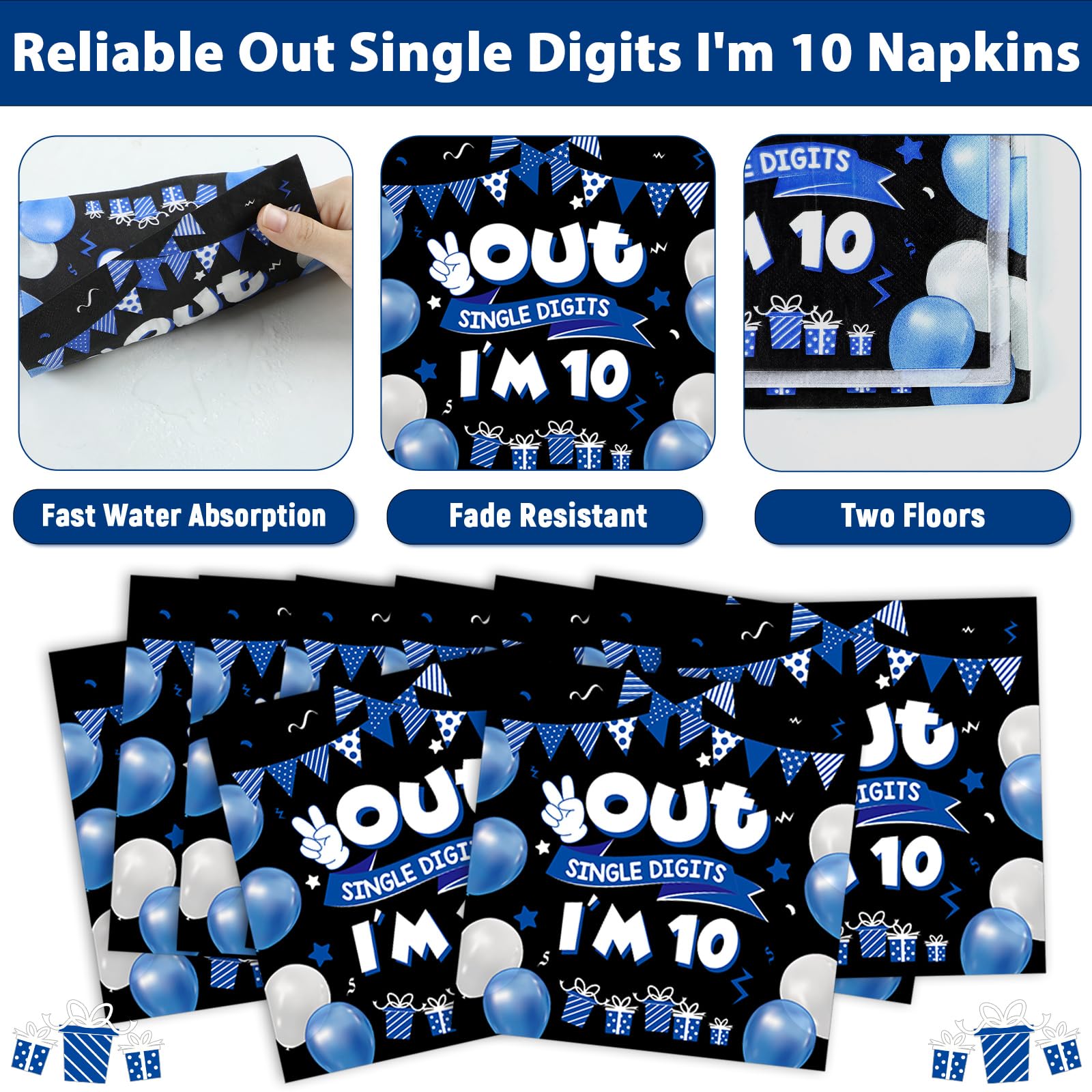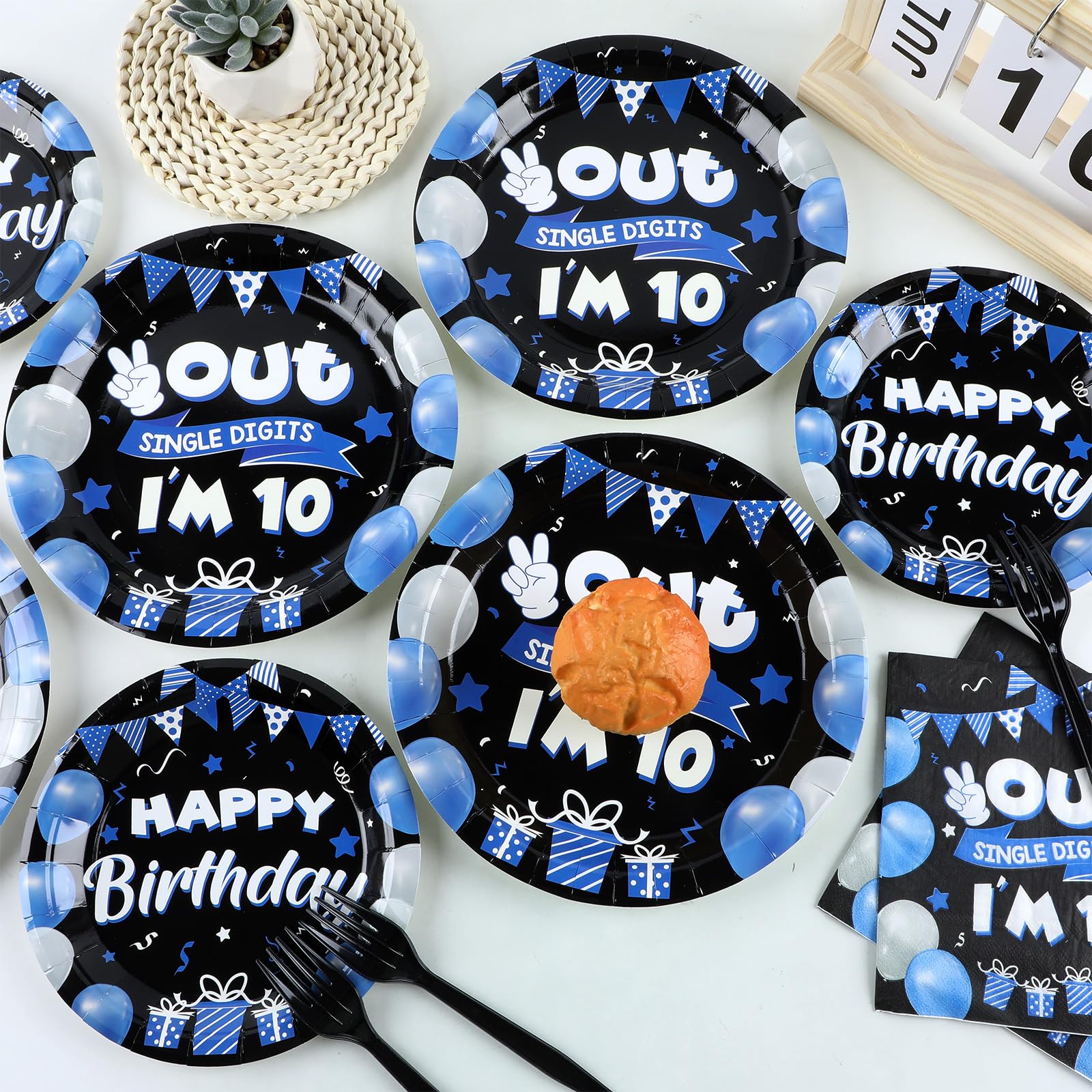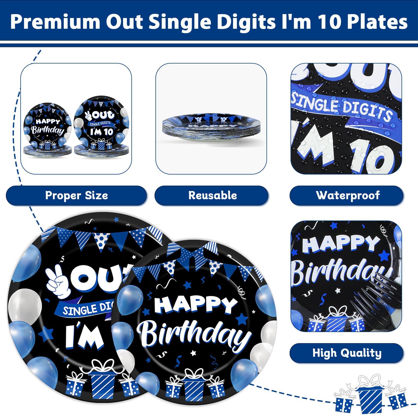 Unique Design: Features eye-catching graphics with the "Out Single Digits I'm 10" and "Happy Birthday" text, adorned with balloons, stars, and gift designs. These Out Single Digits I'm 10 plates and napkins are ideal for creating a great atmosphere that children will love.
