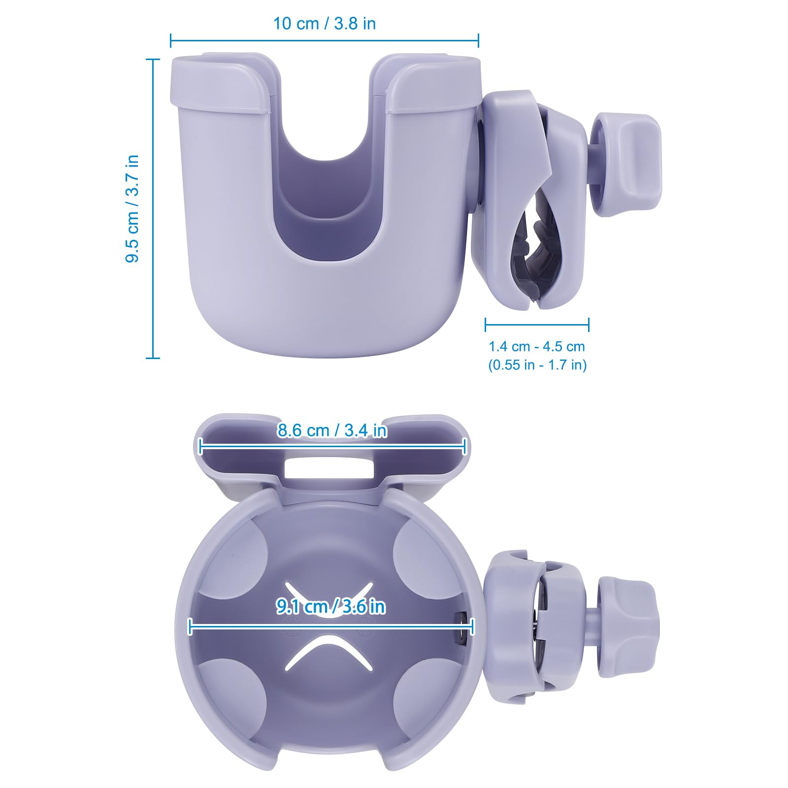 Stroller Cup Holder with Phone Holder/Organizer 1.Universal: Our universal stroller cup holder attachment fits for most strollers, walker, wheelchair, rollator, bicycle, scooter, boat handle bar, shopping cart, kayak, ATV, lawnmowers, motorcycle, treadmill etc. 2.The universal cup holder fits for different sizes cups and bottles with handle or without handle. Get our drinks bottle holder, you can drink your beverage, coffee or milk conveniently! 3. It is a convenient way to hold both the cups and phone. Our cup phone holder fits for most mobile phones under 6.8 inches. 4. Easy to Use: This handlebar cup holder is easy to install, just clamp and go without any tools and assemblies. 5. A Necessity for Going Out: Made of ABS plastic, the cup holder has strong roughness. It is convenient for you to clamp it on your pushchair to shopping or rambling the park with your baby. 6. Compatible with Most Baby Strollers: It is a practical stroller accessories cup holder for Uppababy, Nuna, Bugaboo, Chicco, Britax, Baby Jogger, Doona strollers. 7. It is also a universal walker cup holder or wheelchair cup holder, clip on cup holder for bike and scooter. Product Details: Applicable phone size(include phone case ) : W*H : 3.15In *0.46in / 80mm *11.7mm Holder clip range: 0.55in-1.7in / 1.4cm- 4.5cm Organizer Size: 9cm×9 cm / 3.5in ×3.5in Package Includes: cup holder