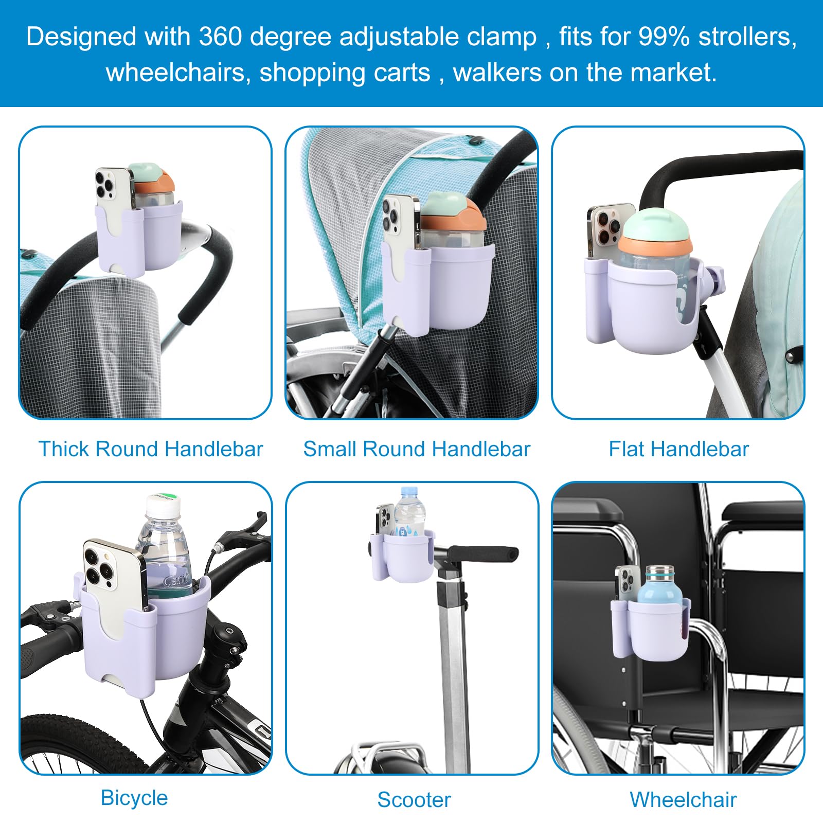 Wide Compatibility: This universal cup holder with phone holder compatible with most baby strollers, walker, wheelchair, rollator, bike, scooter, boat handle bar, shopping cart, kayak, ATV, lawnmowers, motorcycle, treadmill, golf push cart and so on.