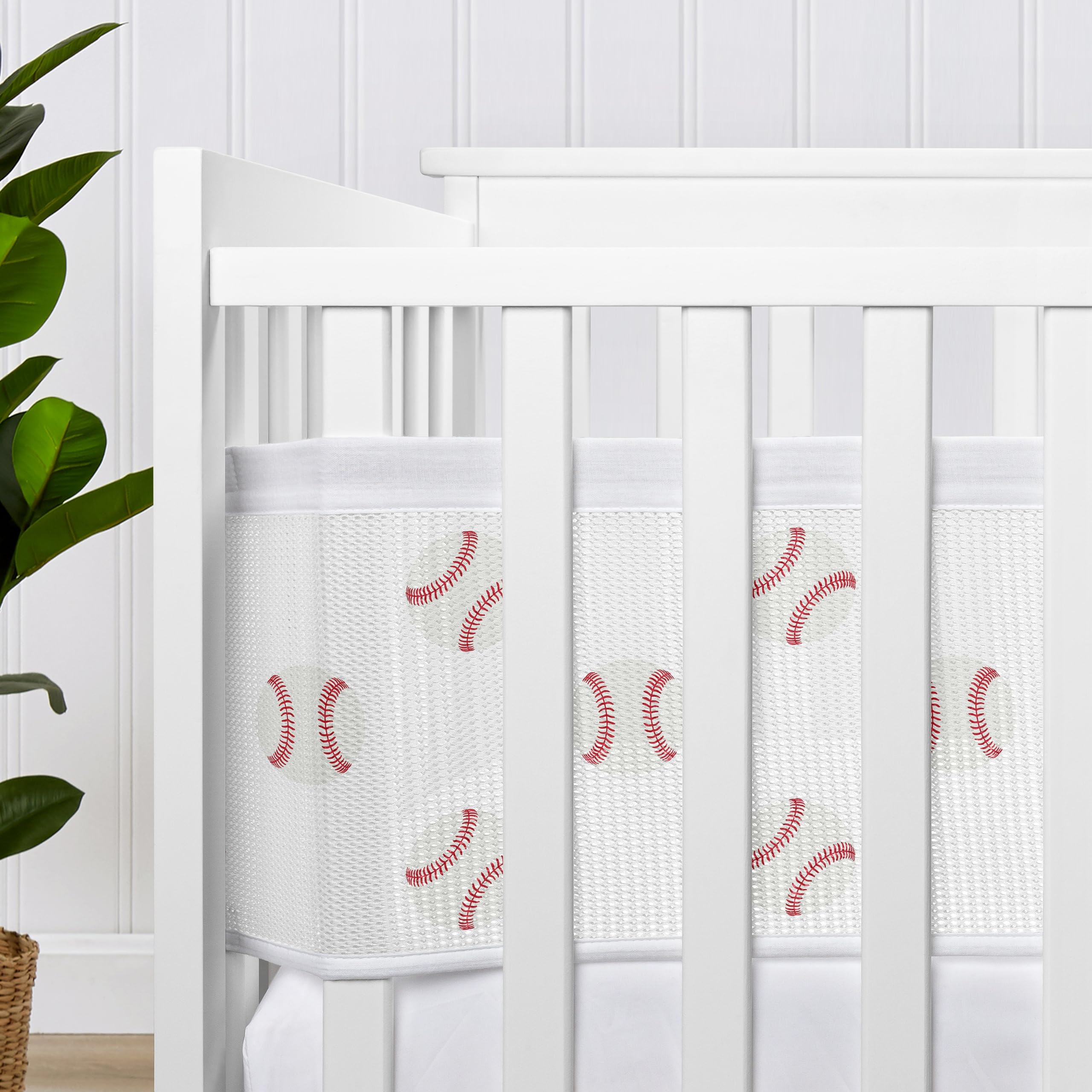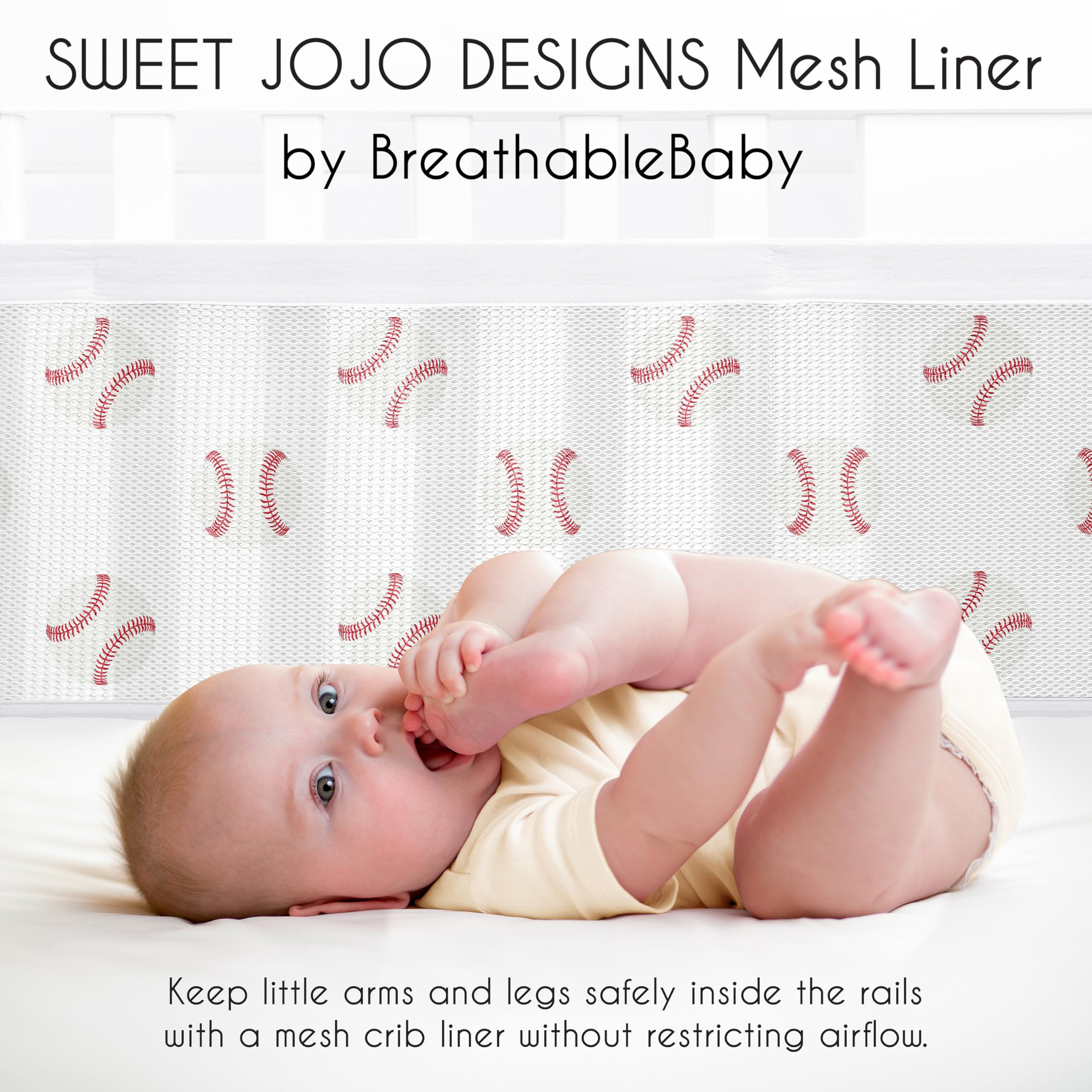 This mesh crib liner features a sports americana with complimentary color palette from the matching Sweet Jojo Designs Baseball Patch bedding collection of red and white.