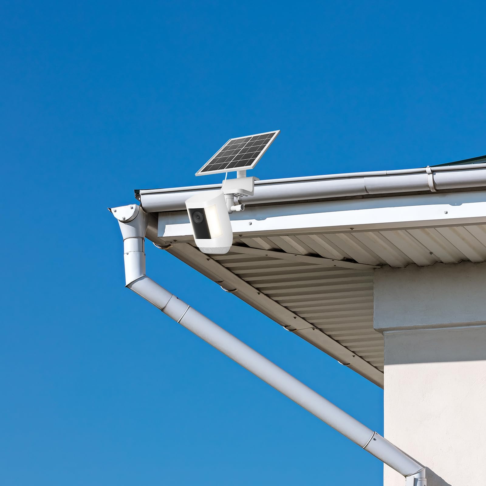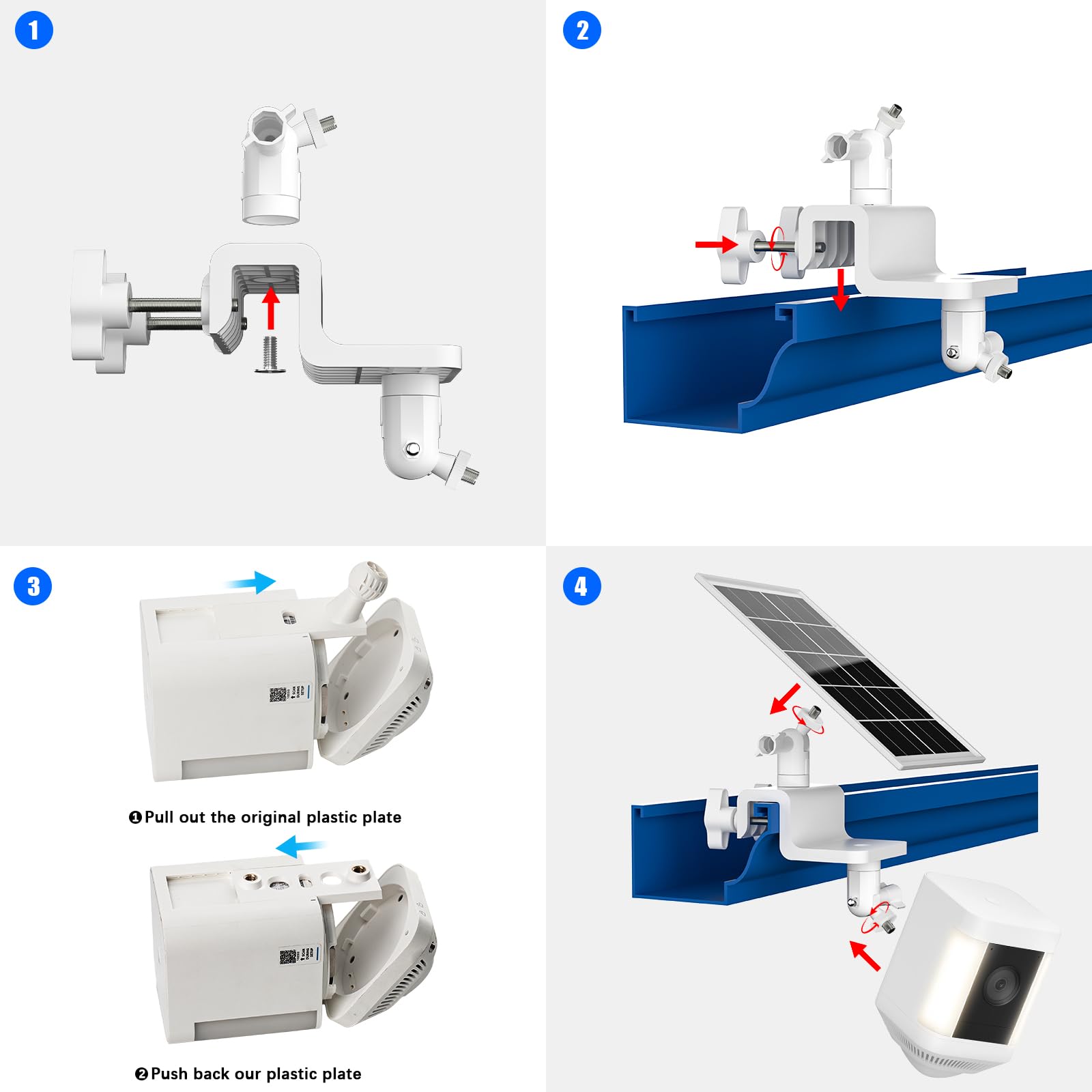 Fully Adjustable:The gutter mount features dual mini ball head assemblies, allowing adjustment of both solar panels and security cameras to simultaneously achieve optimal monitoring coverage/camera angles and ideal direct sunlight exposure.