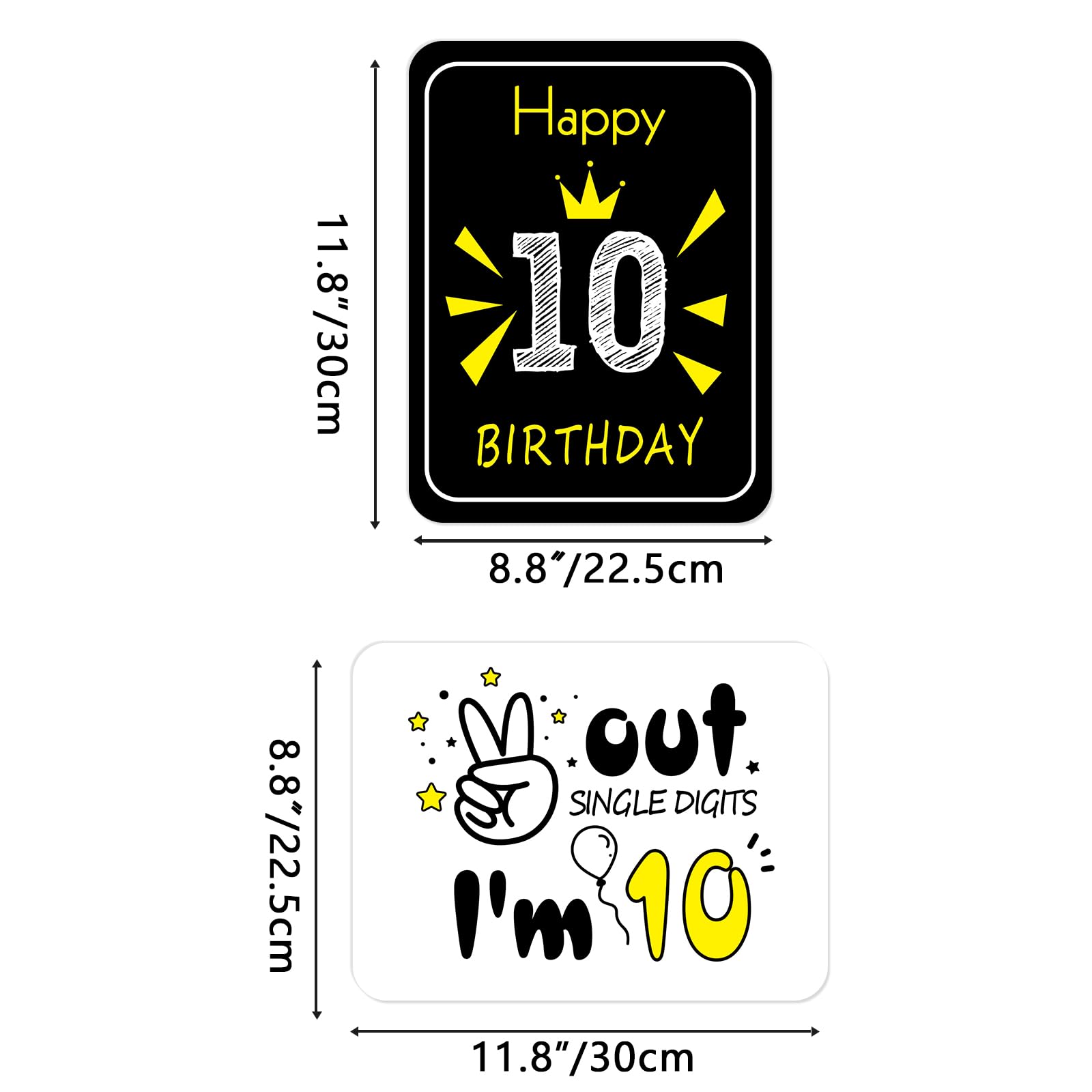 PACKAGE - 9 PCS dirty 10 birthday party supplies. All logos measure 11.8" X 8.8". Total 9 patterns: WARNING: 10th birthday party, CAUTION: 10 YEARS OLD, 10 ZONE ENDS, You are now entering the 10 zone and more.