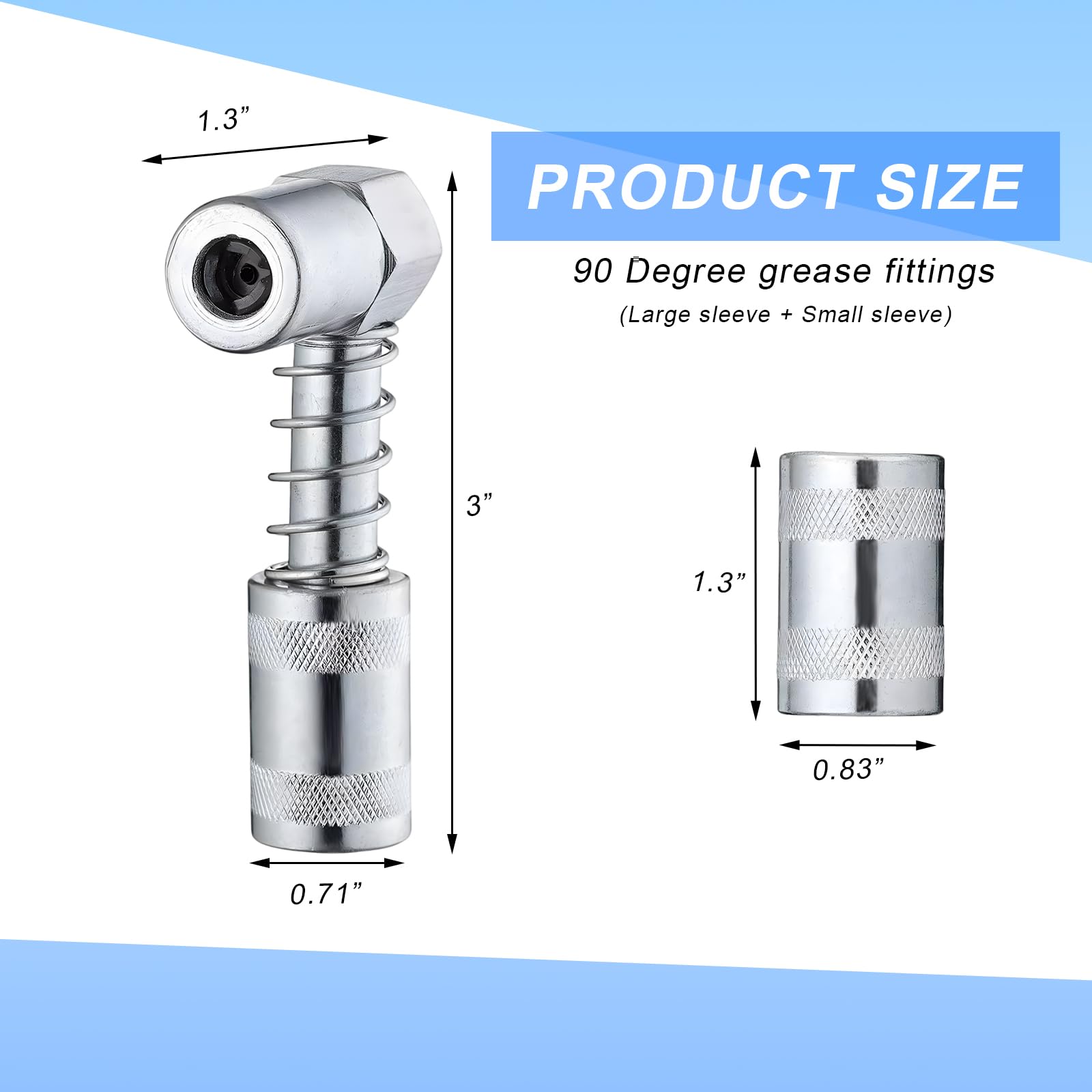 【What You Get】: The package contains a coupler with a 90° grease fitting coupling and sleeve. The size of the coupling is 1.3 inches long and 0.67 inches in diameter. The sleeve size is 1.34×0.83 inches. Please measure the size of the connector before placing an order to avoid not being able to use it.