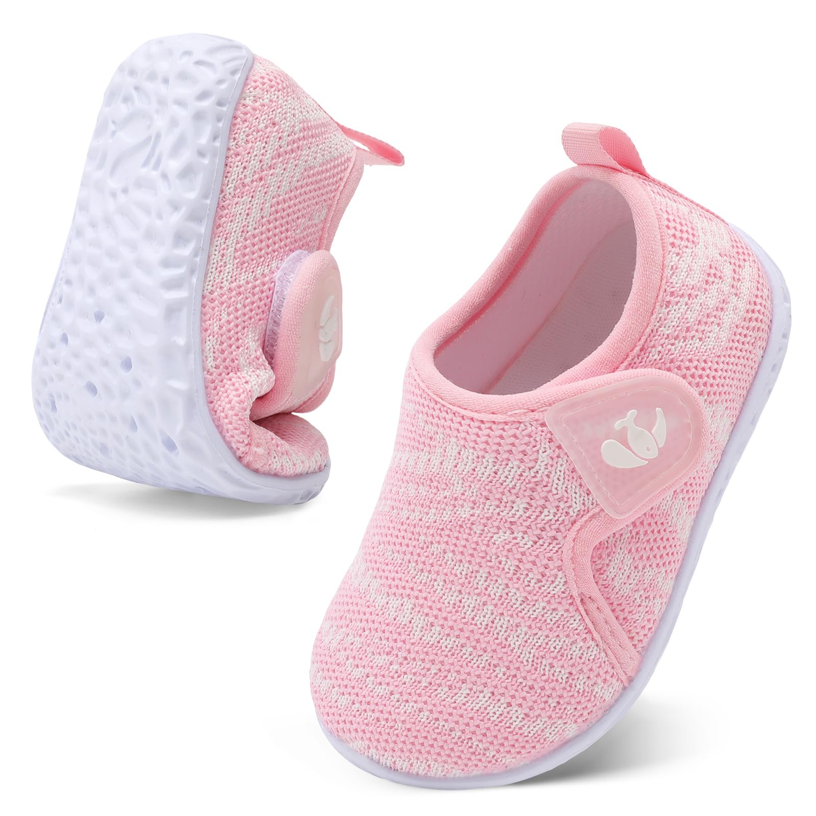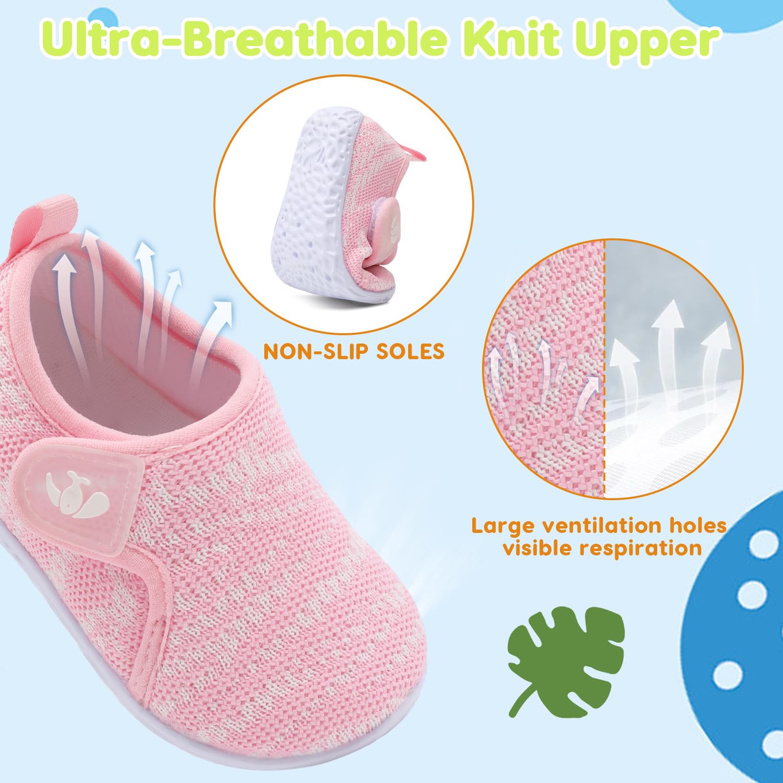 Upper:Knitted Mesh Upper offers comfort and air permeability,has excellent breathability,moisture wicking function,and keep baby's feet dry and odorless.Super Soft,Breathable and Comfortable fit all the year