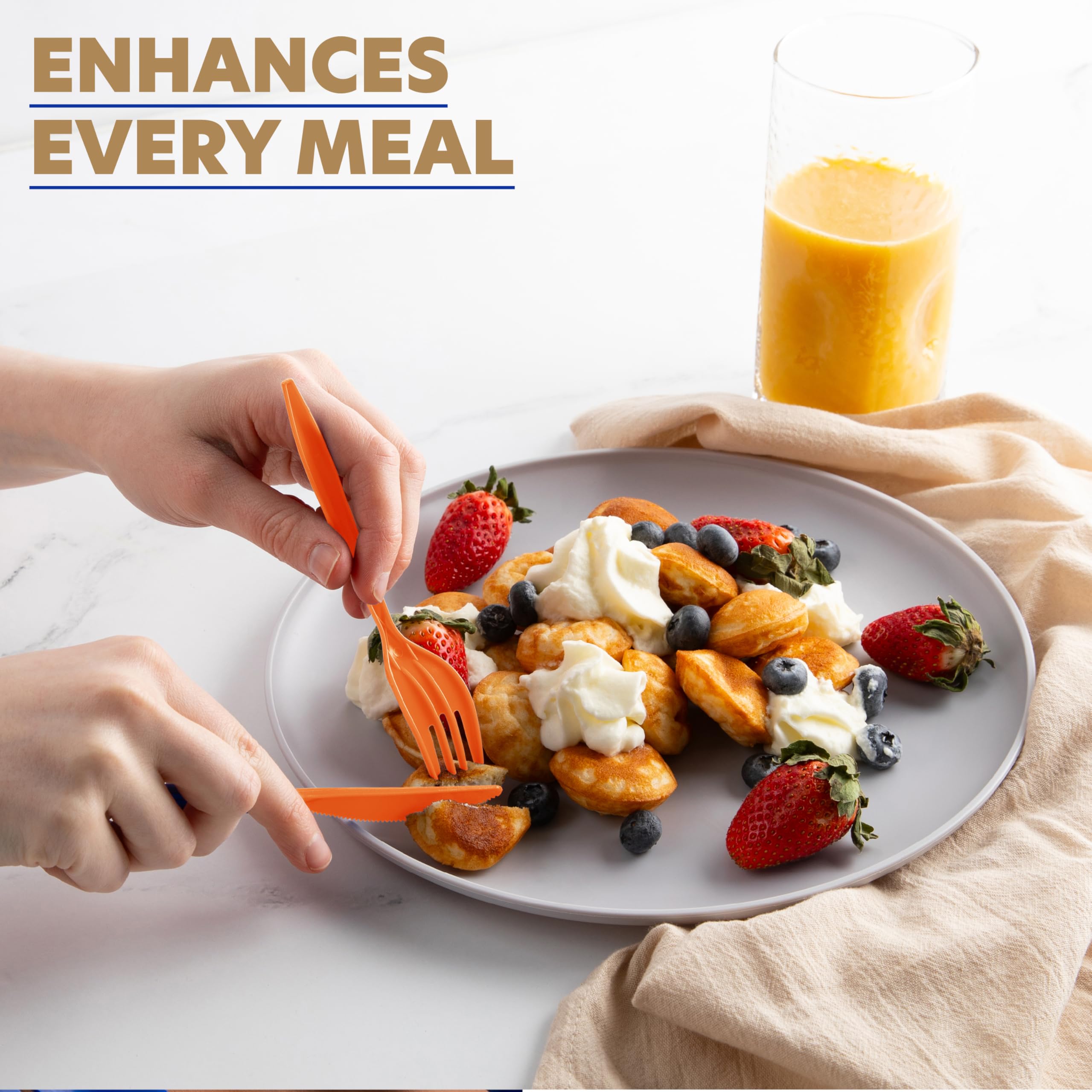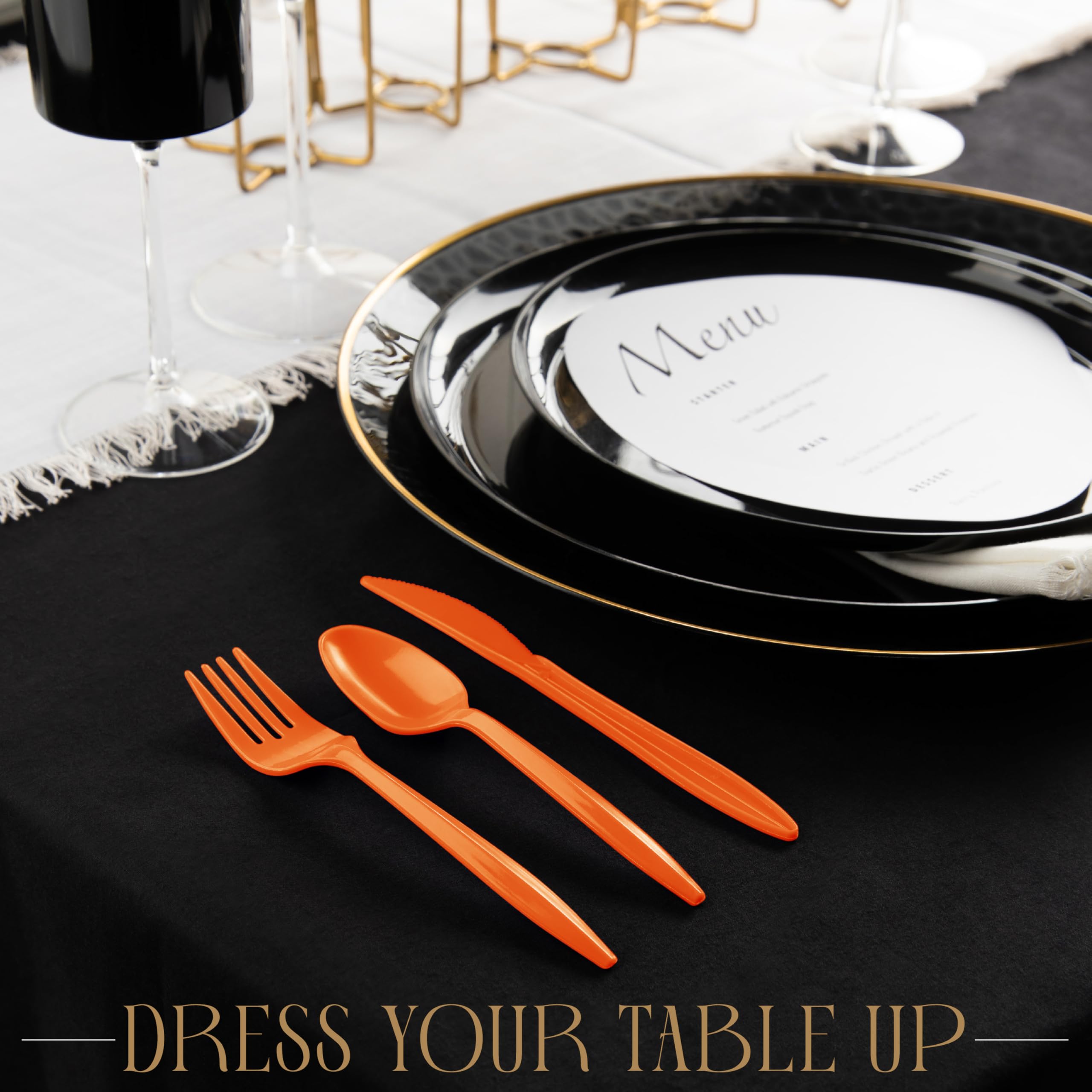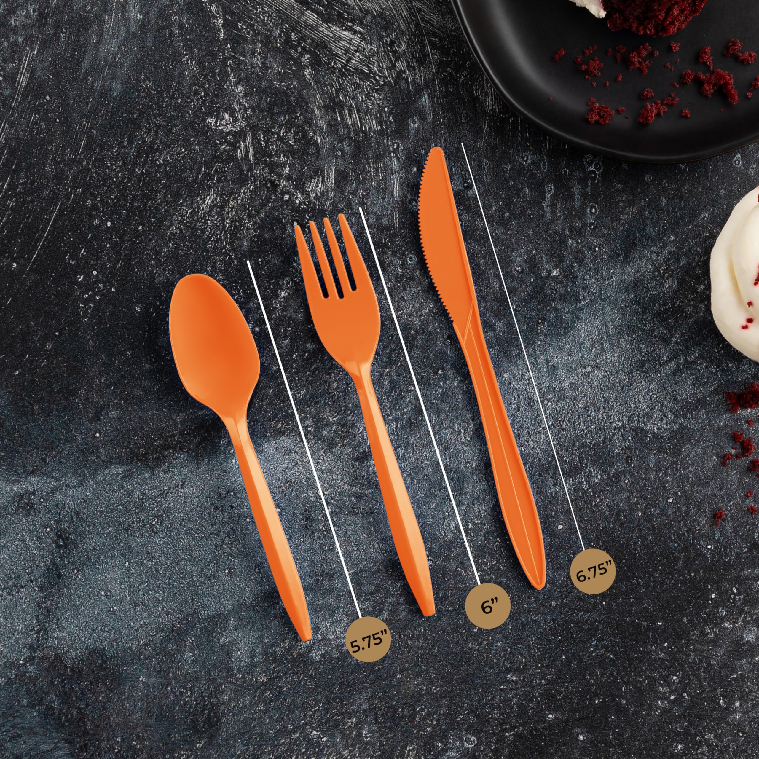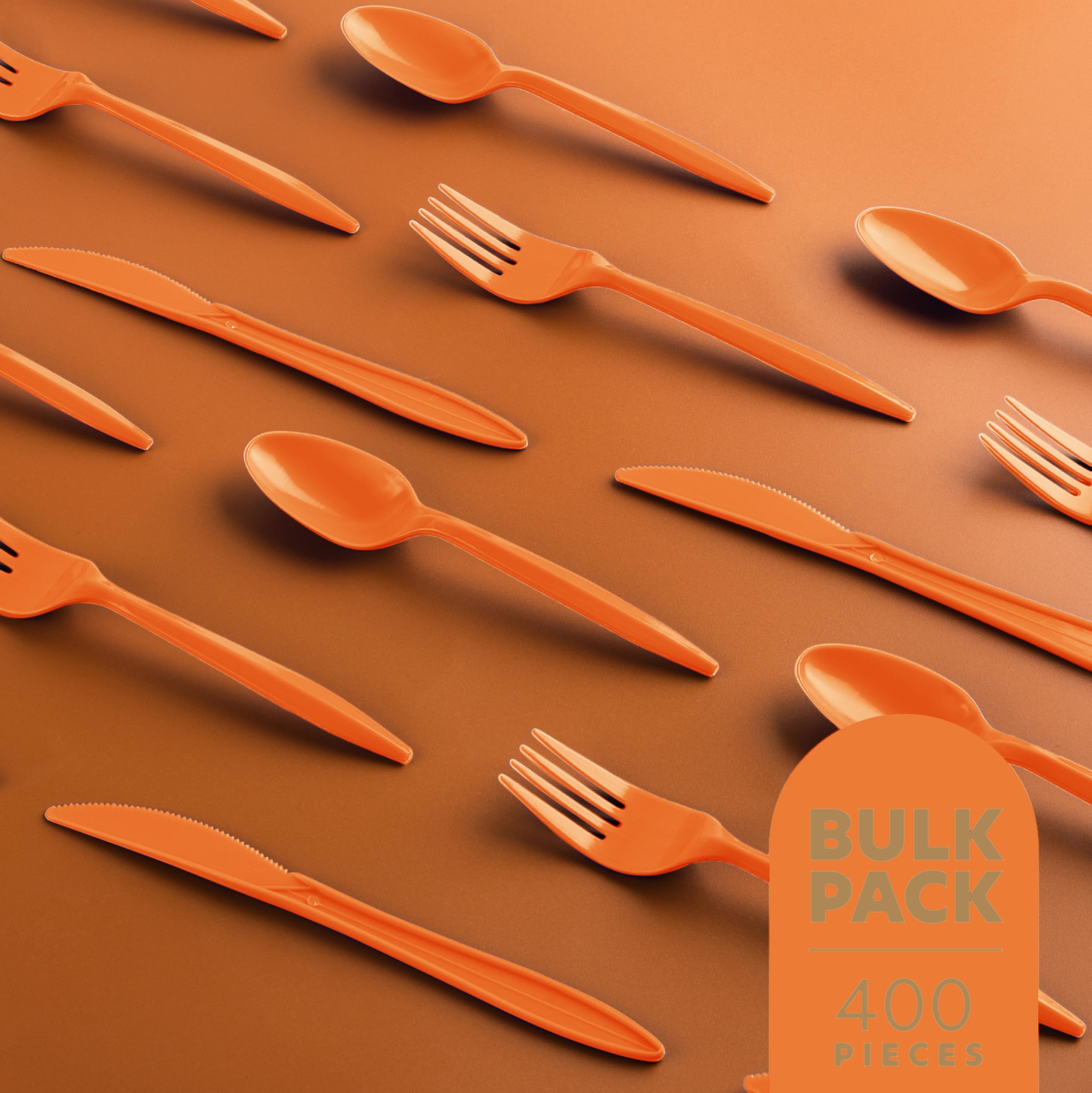 Bulk Pack disposable cutlery includes 400 pieces: 160 orange plastic tea spoons, 160 orange plastic forks, and 80 orange plastic knives.