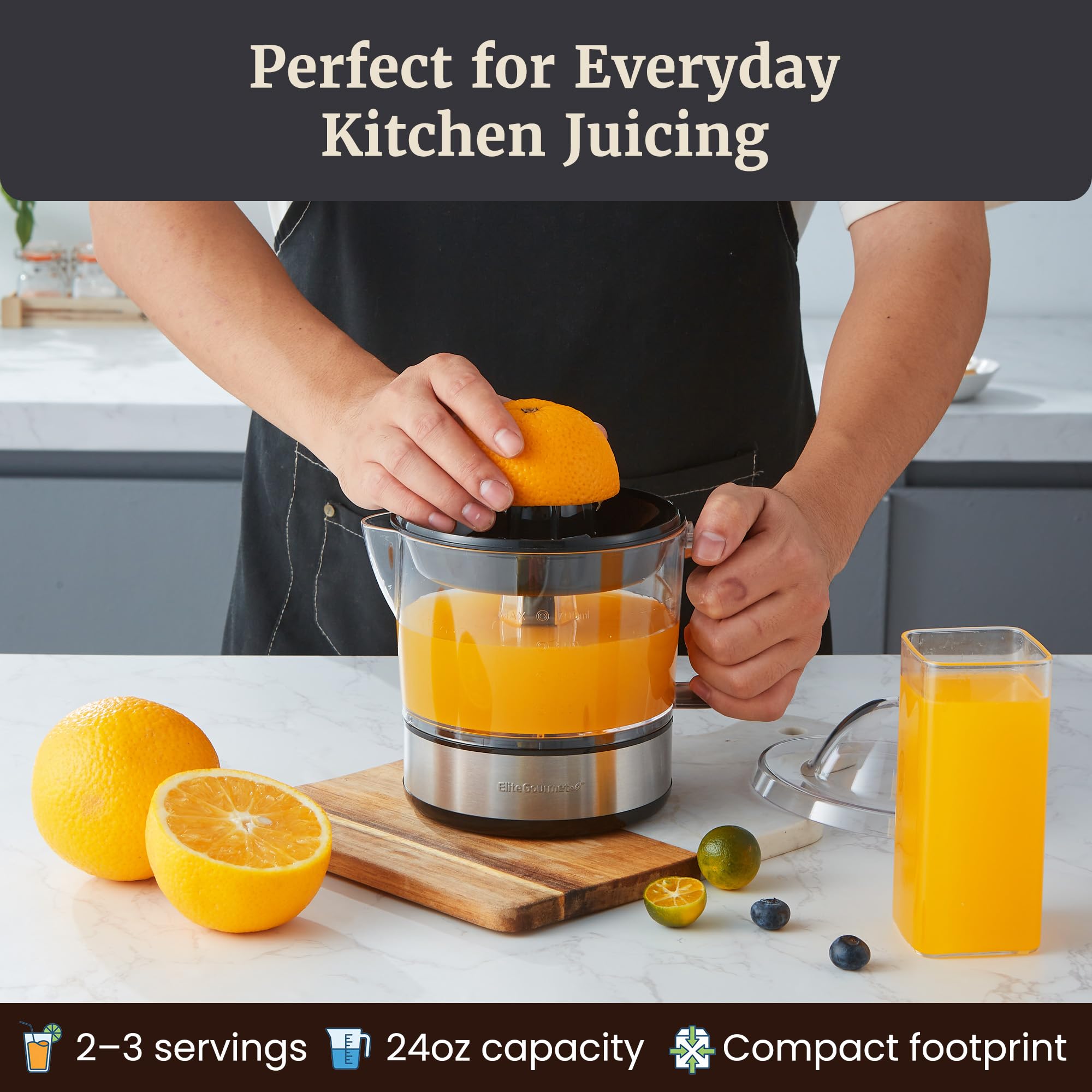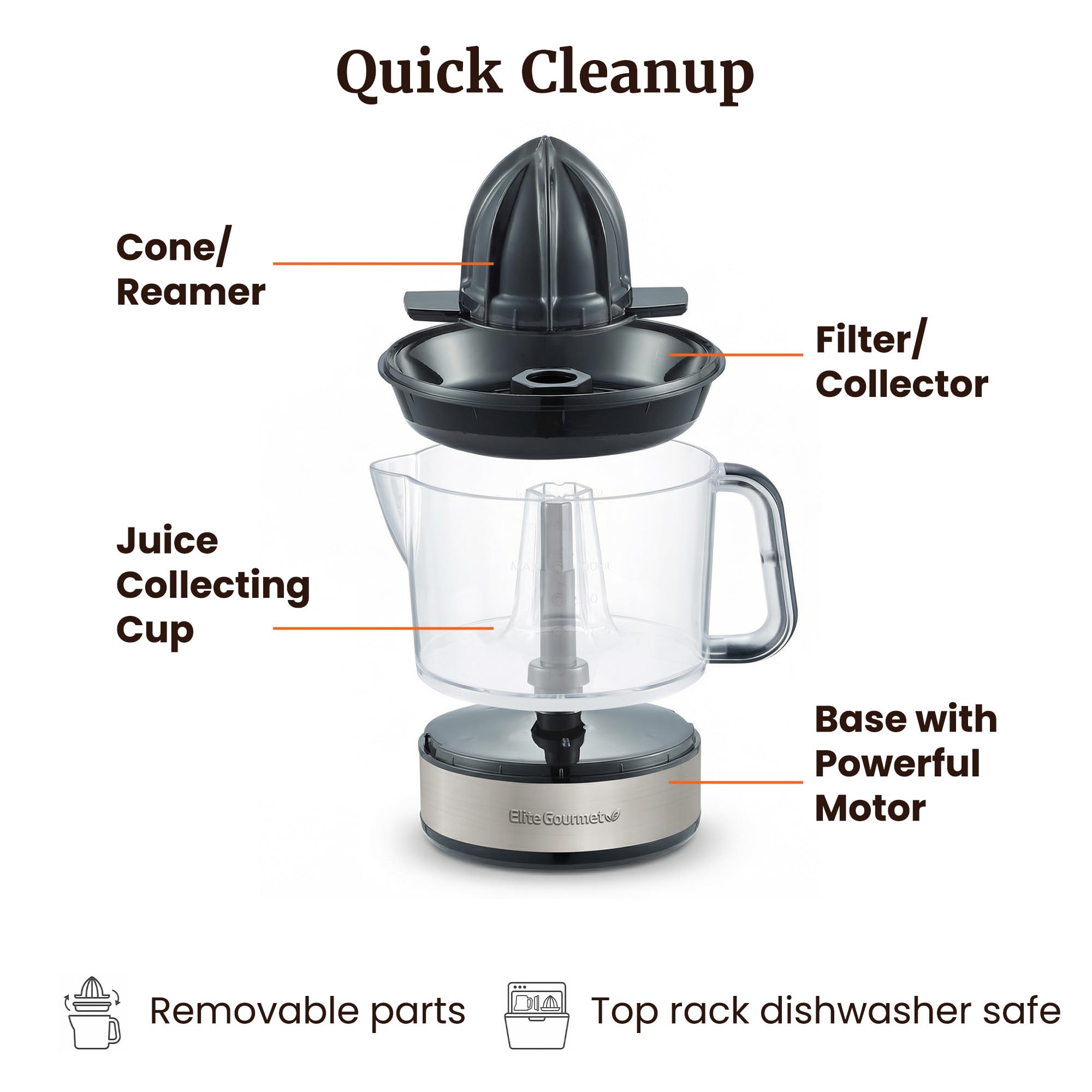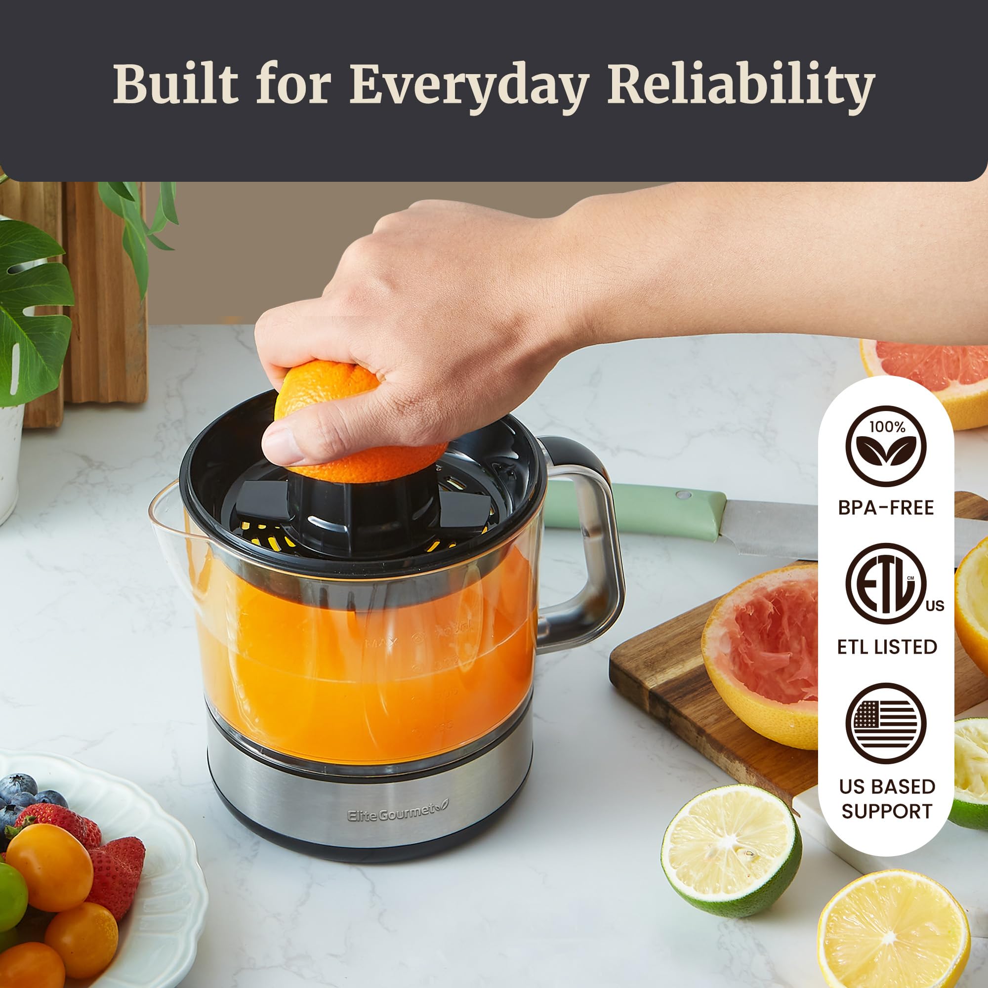 There’s nothing quite like a glass of freshly squeezed citrus juice to start your day. The Elite Gourmet Electric Citrus Juicer makes it easy to enjoy fresh orange, lemon, lime, or grapefruit juice at home in seconds. Powered by a 40-watt motor, this citrus juicer delivers stronger performance than many standard 25-watt models. The auto-reversing reamer rotates in dual directions to help extract more juice from each fruit while maintaining smooth, effortless push-down operation. The 24oz (3-cup) juice container is perfect for preparing 2–3 servings at once. A built-in pulp and seed filter helps separate seeds and reduce excess pulp, giving you smoother juice with minimal effort. The easy-pour spout and ergonomic handle allow you to serve directly from the juicing container. Designed for convenience, the compact footprint fits easily on kitchen counters, in small apartments, dorm rooms, or RV kitchens. When you're finished juicing, the detachable parts remove quickly and are top-rack dishwasher safe, making cleanup fast and simple. Made with BPA-free materials and ETL listed for safety, the Elite Gourmet citrus juicer delivers reliable everyday performance for fresh, natural citrus juice without added sugars, preservatives, or additives. Enjoy bright, fresh flavor straight from your favorite citrus fruits — anytime.