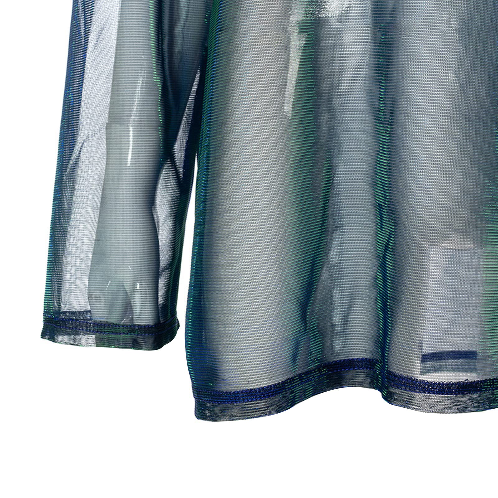 Features with mesh sheer see-through fabric, long sleeve, irregular neck, metallic sparkle shinny oversized T-shirt.