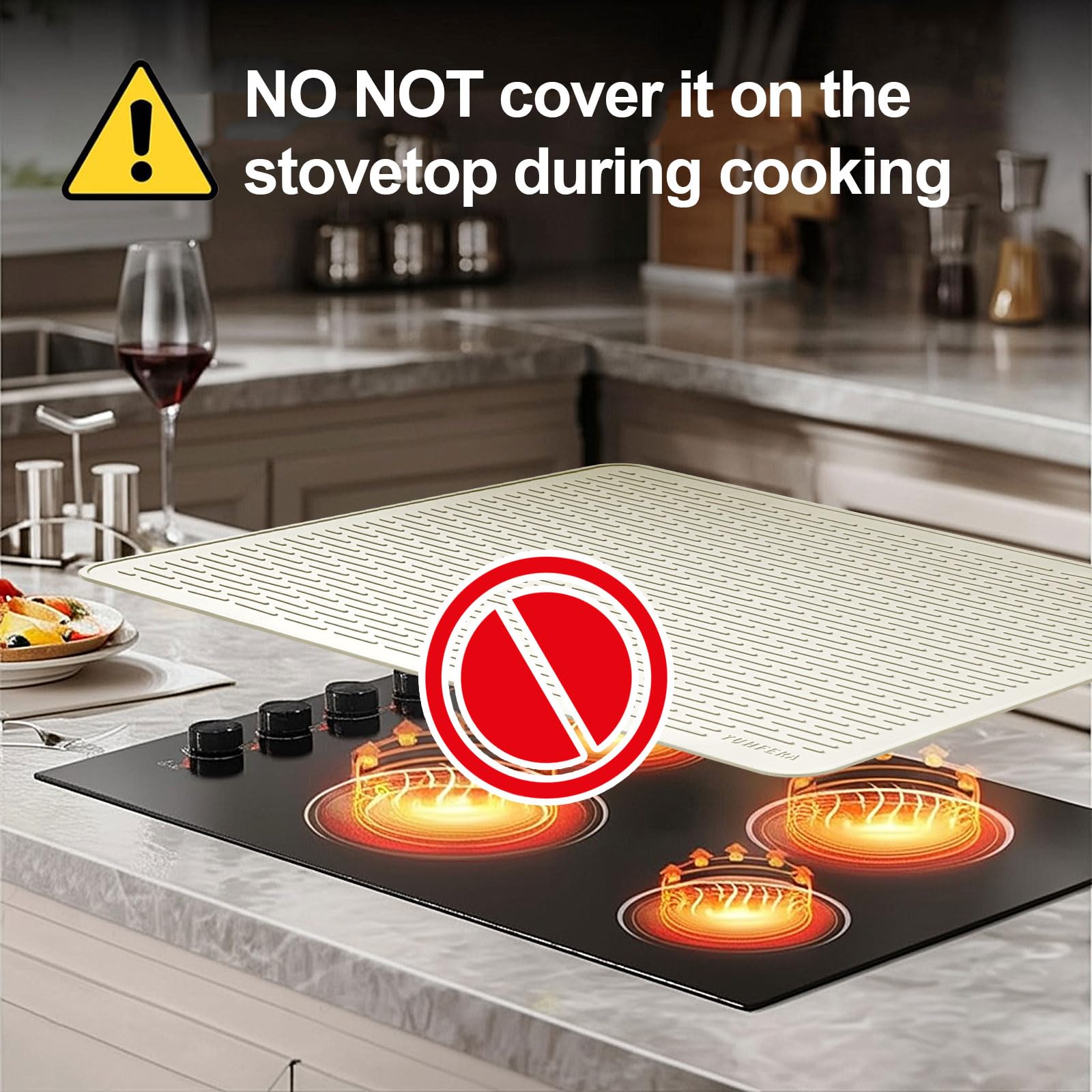 Anti Scalding Silicone Mat: Our glass-top stove cover doubles as a silicone trivet mat that can hold hot pots and pans. Heat resistant up to 400°F, its raised wide ridges separate the hot pot from the table and protect your kitchen surfaces from scalding. Attention!*Do NOT put the electric cooktop cover on the electric range while it's ON to prevent damage.